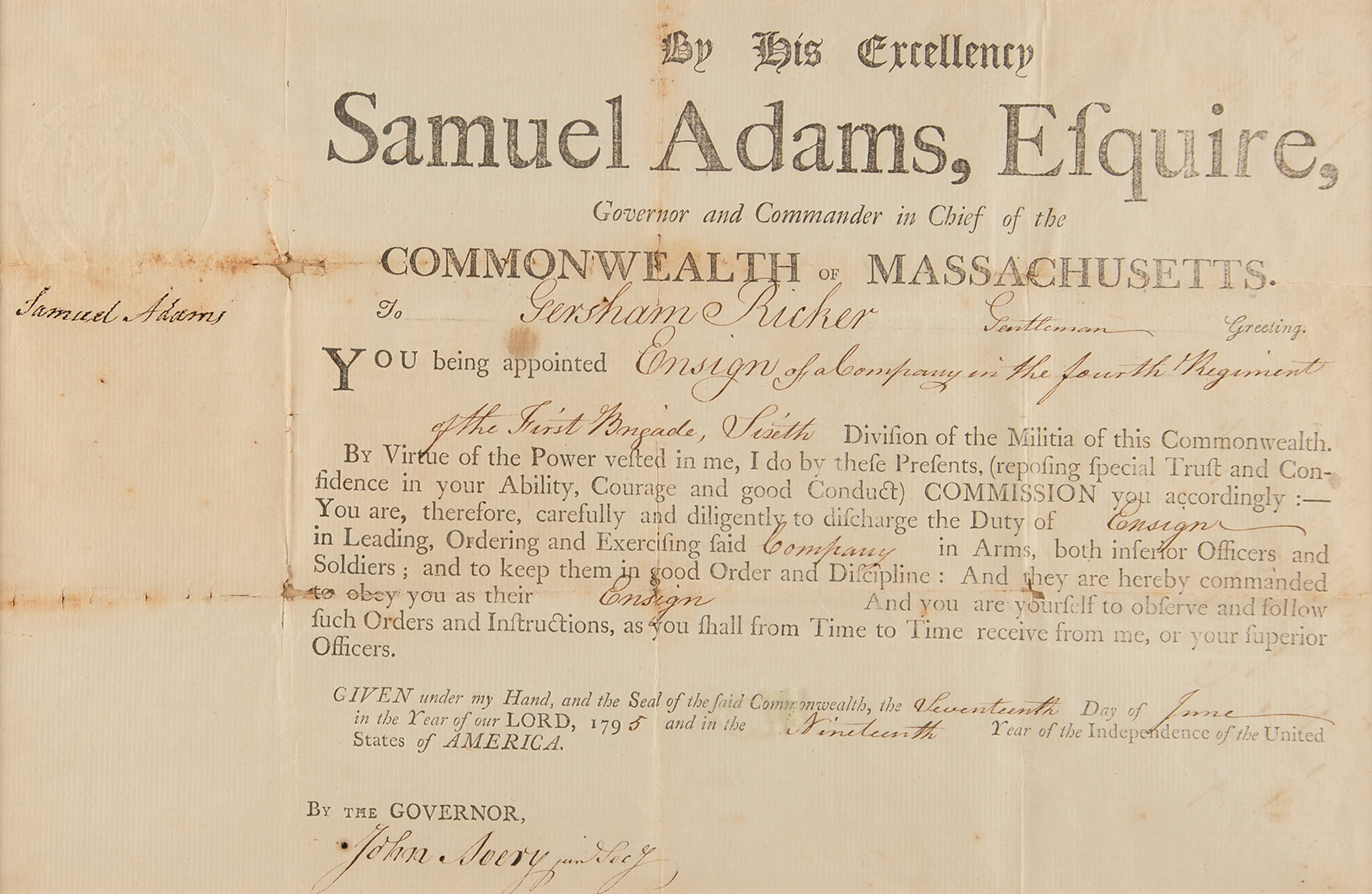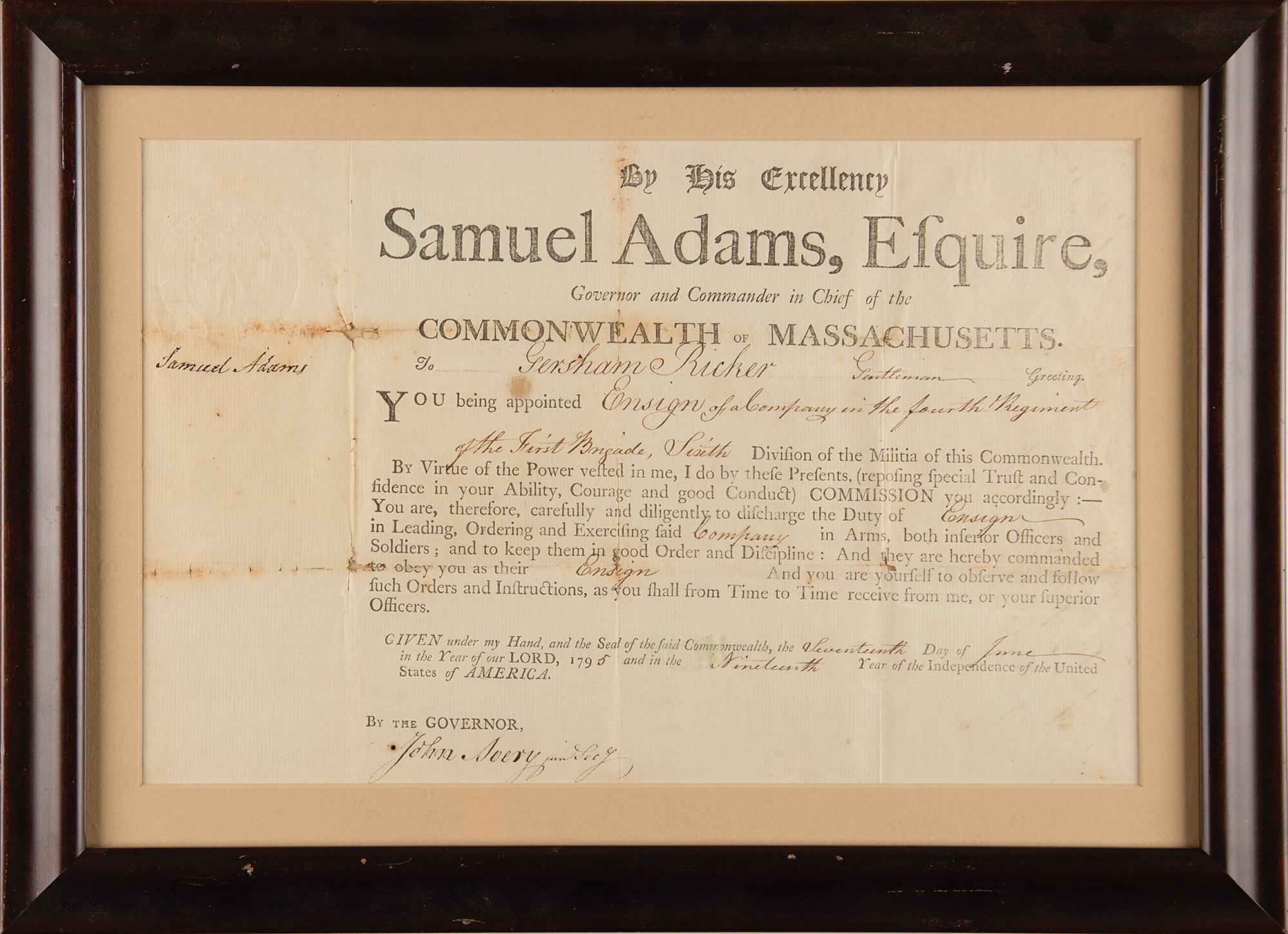 Sought-after partly-printed DS, signed “Samuel Adams,” one page, 14.25 x 9.25, June 17, 1795. As governor of Massachusetts, Samuel Adams appoints Gersham Ricker as “Ensign of a Company in the fourth Regiment of the First Brigade, Sixth Division of Militia of this Commonwealth." Crisply signed in the upper left, below the embossed seal of Massachusetts, by Governor Samuel Adams, and countersigned at the conclusion by Secretary John Avery. Matted and framed to an overall size of 18.25 x 13.5. In very good to fine condition, with scattered stains, and some minor paper loss at fold intersections. An ideal, boldly signed military document from the Revolutionary leader.