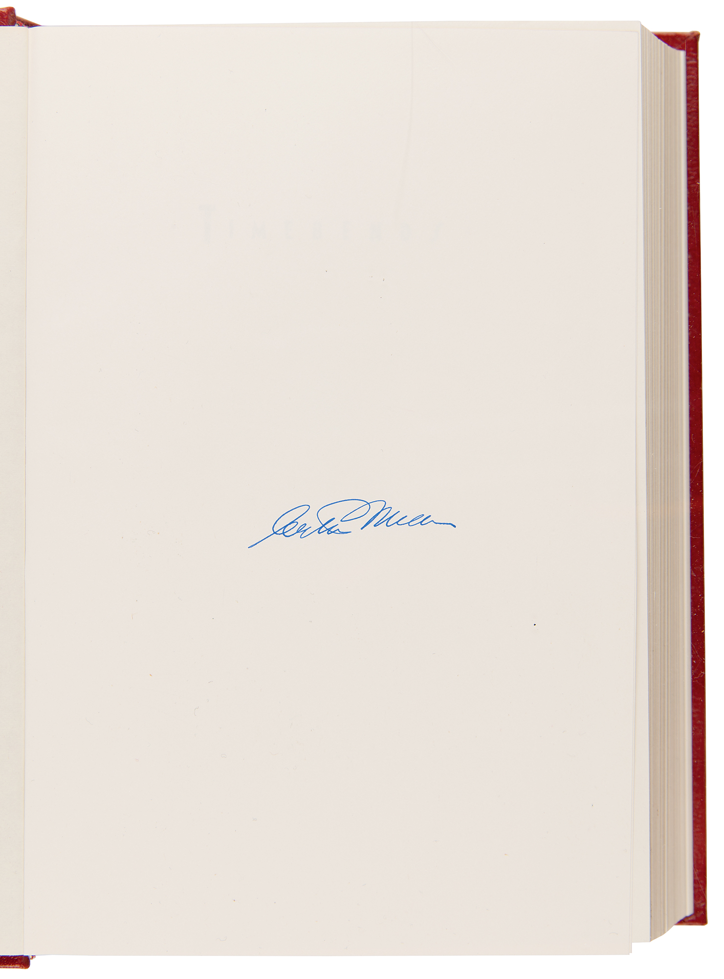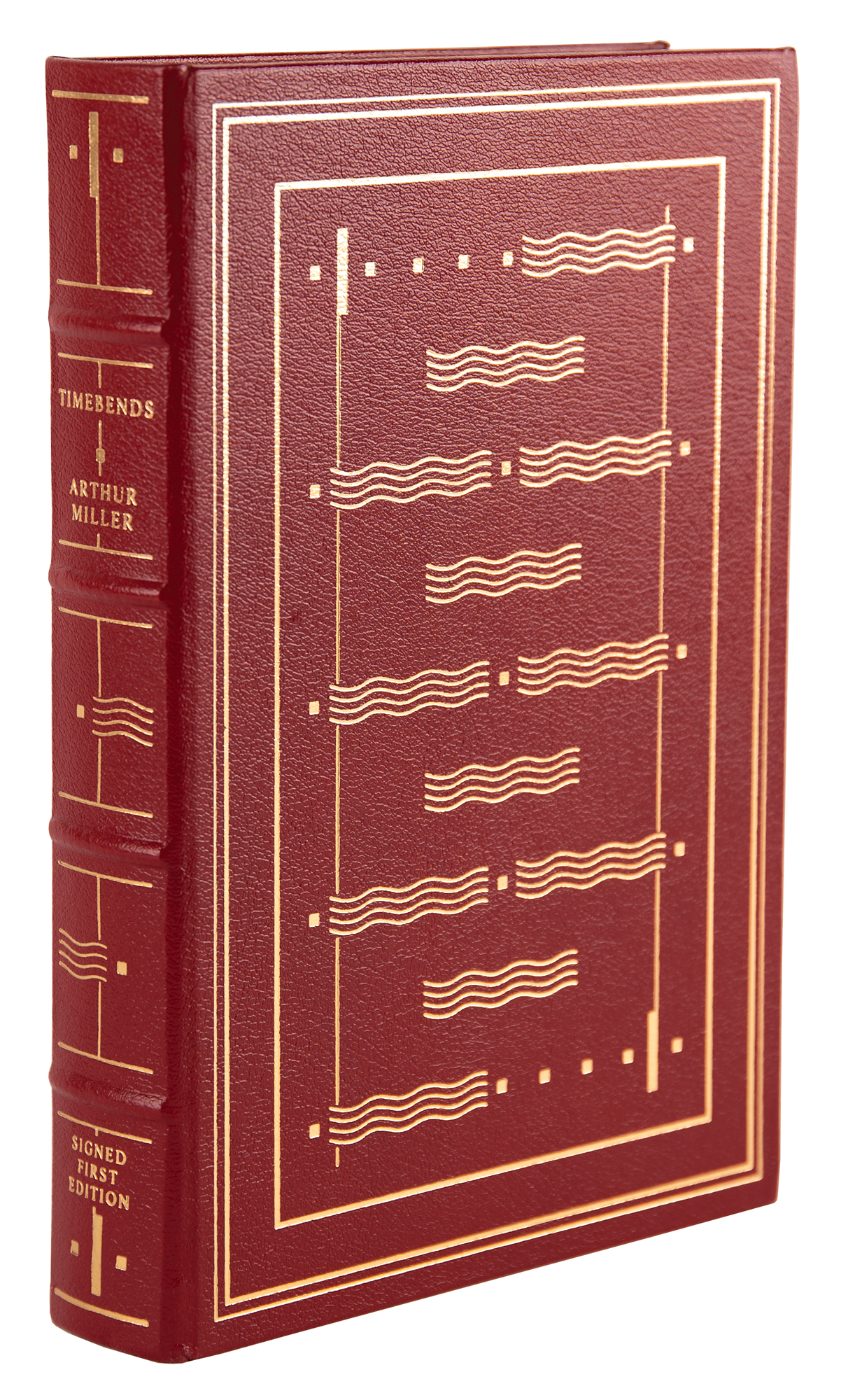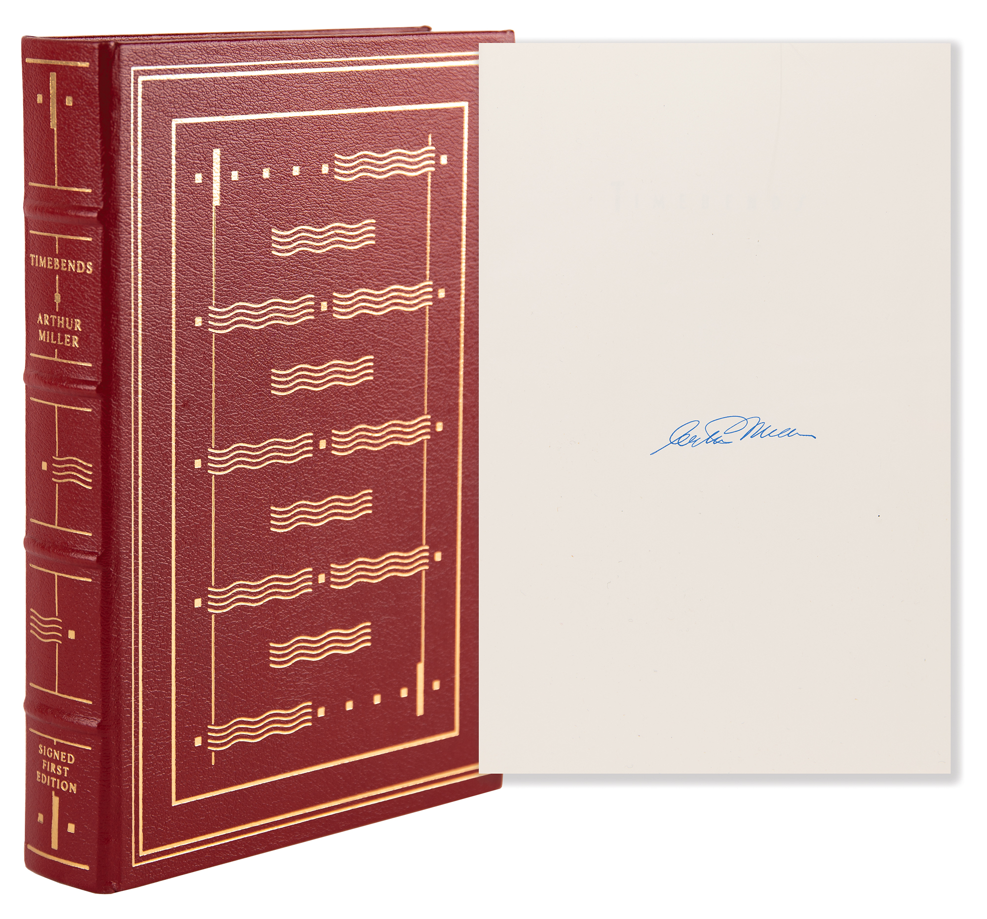 Signed book: Timebends: A Life. Limited first edition. Franklin Center, Pennsylvania: Franklin Library, 1987. Leatherbound hardcover, 6.5 x 9.5, 614 pages. Signed in blue ink on an opening page by Arthur Miller. In very fine condition.