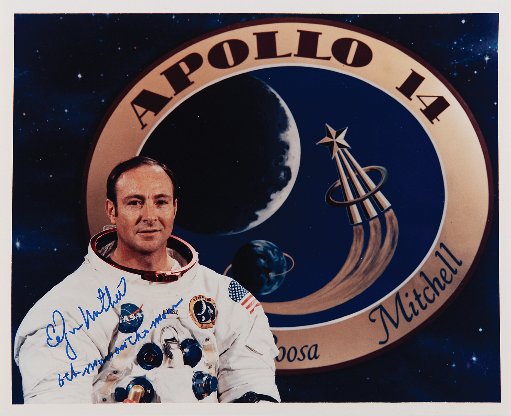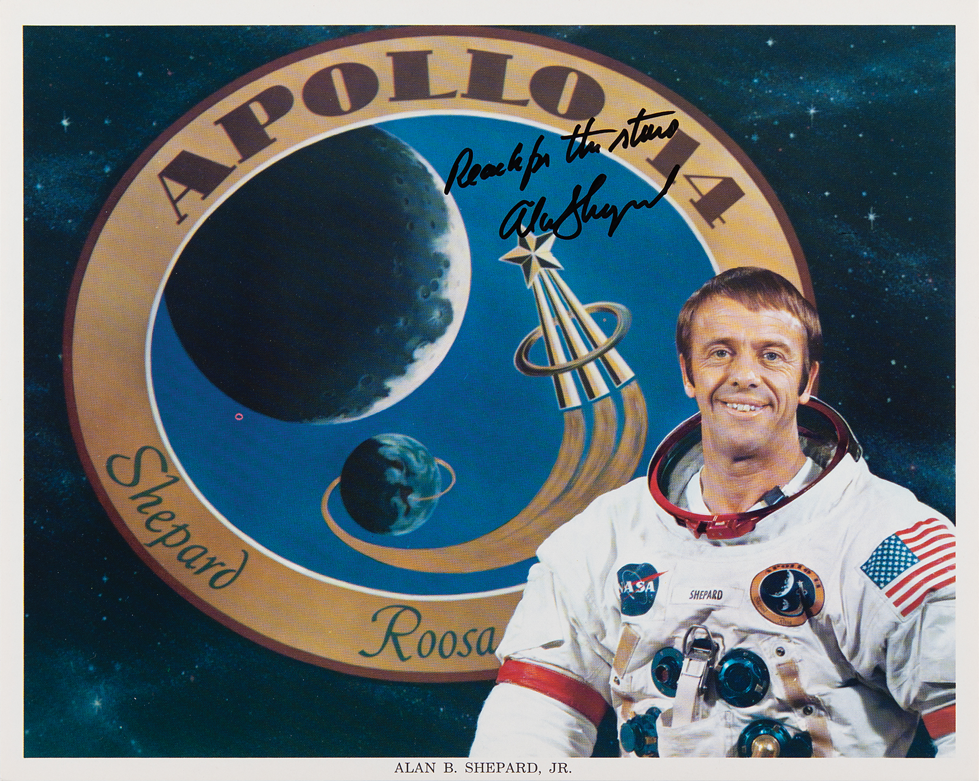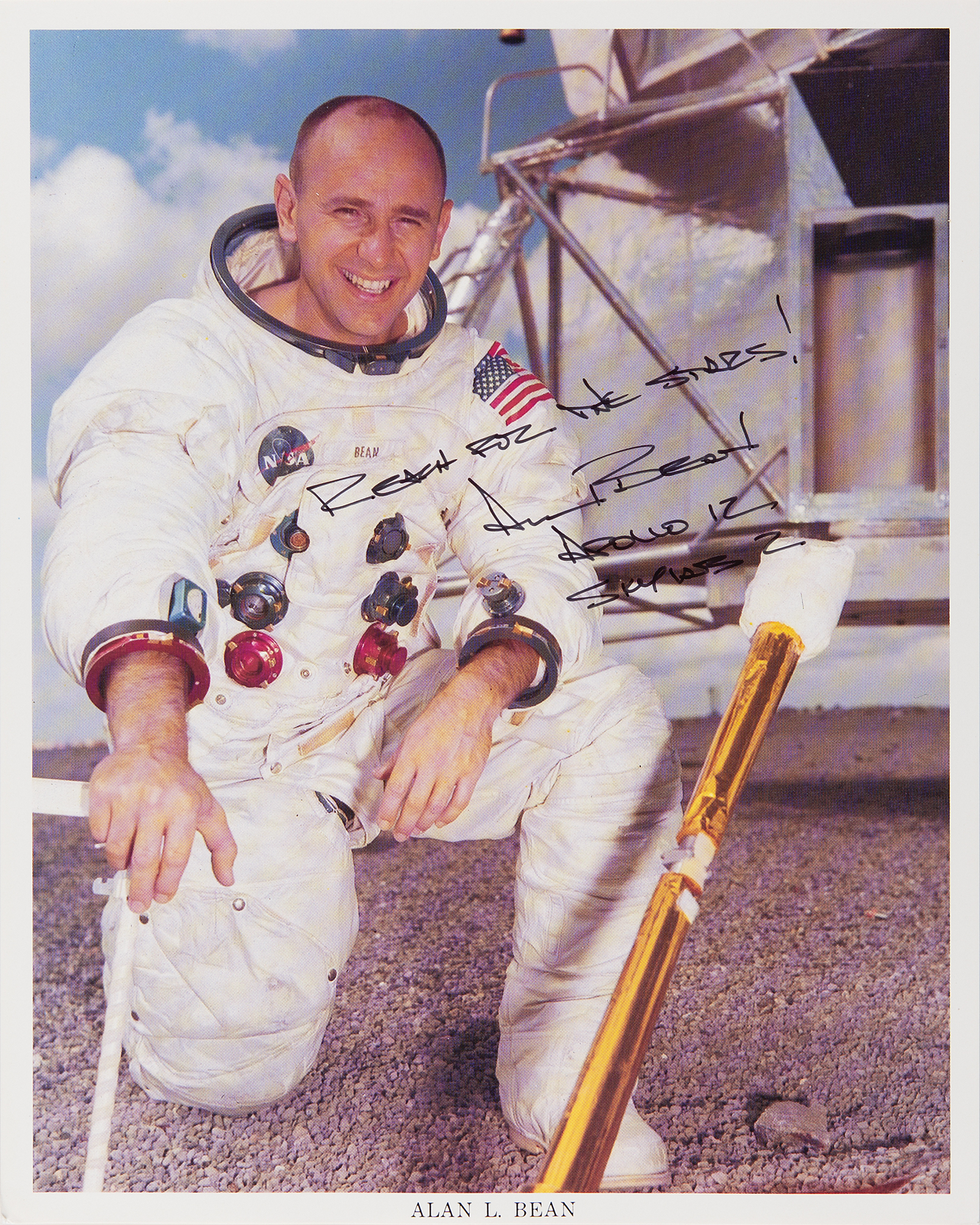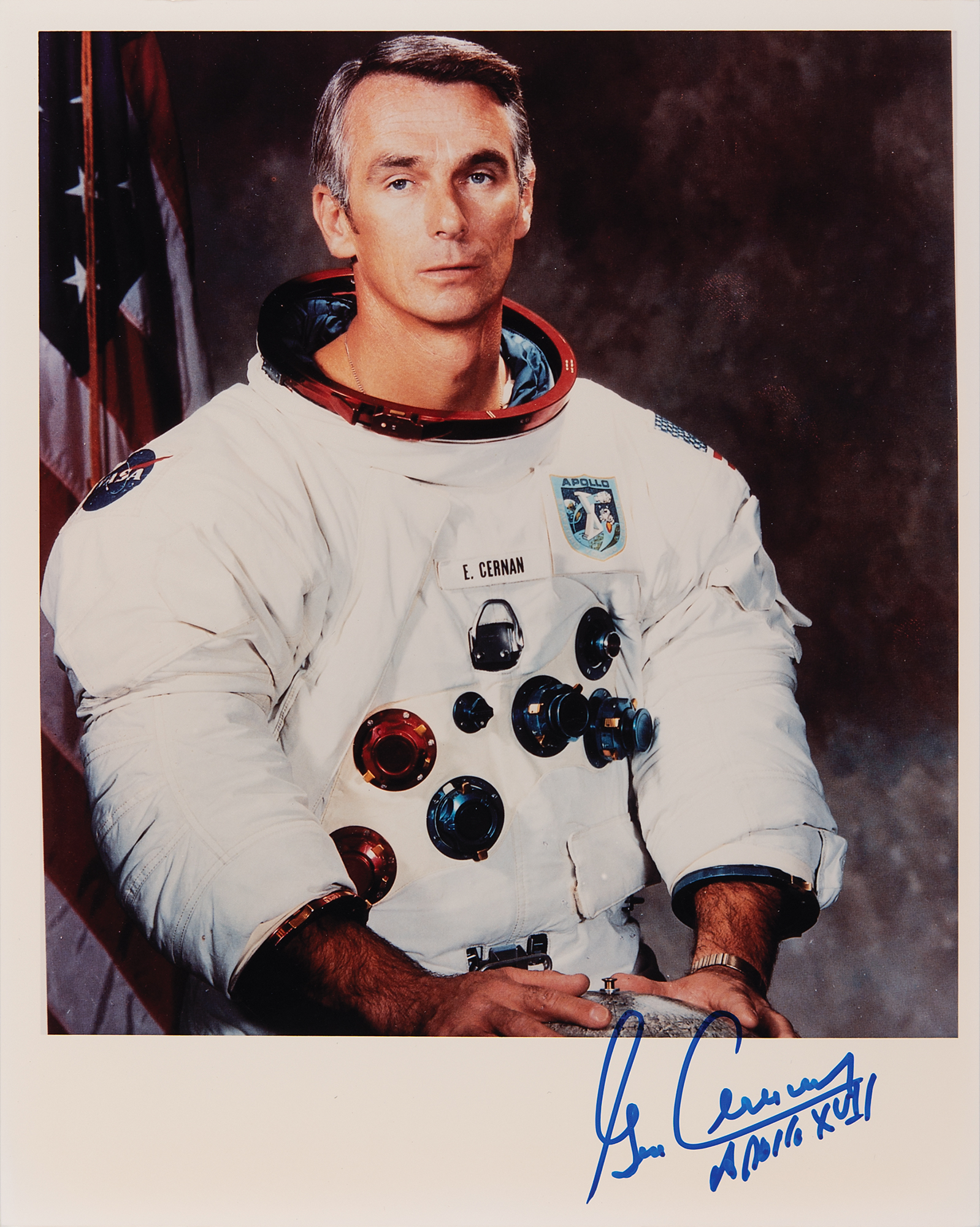 Desirable set of 10 color photos signed by an Apollo moonwalker, 8 x 10 and 10 x 8, half of which are official NASA lithographs, each uninscribed and signed in blue or black felt tip by the following astronauts: “Buzz Aldrin, Apollo XI,” “Charles Conrad, Jr.,” “Reach for the stars! Alan Bean, Apollo 12, Skylab 2,” “Reach for the stars, Alan Shepard,” “Edgar Mitchell, 6th man on the moon,” “Dave Scott, CDR,” “Jim Irwin,” “Charlie Duke, Apollo 16,” “Jack Schmitt,” and “Gene Cernan, Apollo XVII.” The reverse of the Mitchell and Scott photos bear affixed labels from The SpaceSource. In overall fine condition. Accompanied by certificates of authenticity from The SpaceSource for the Mitchell and Scott photos.