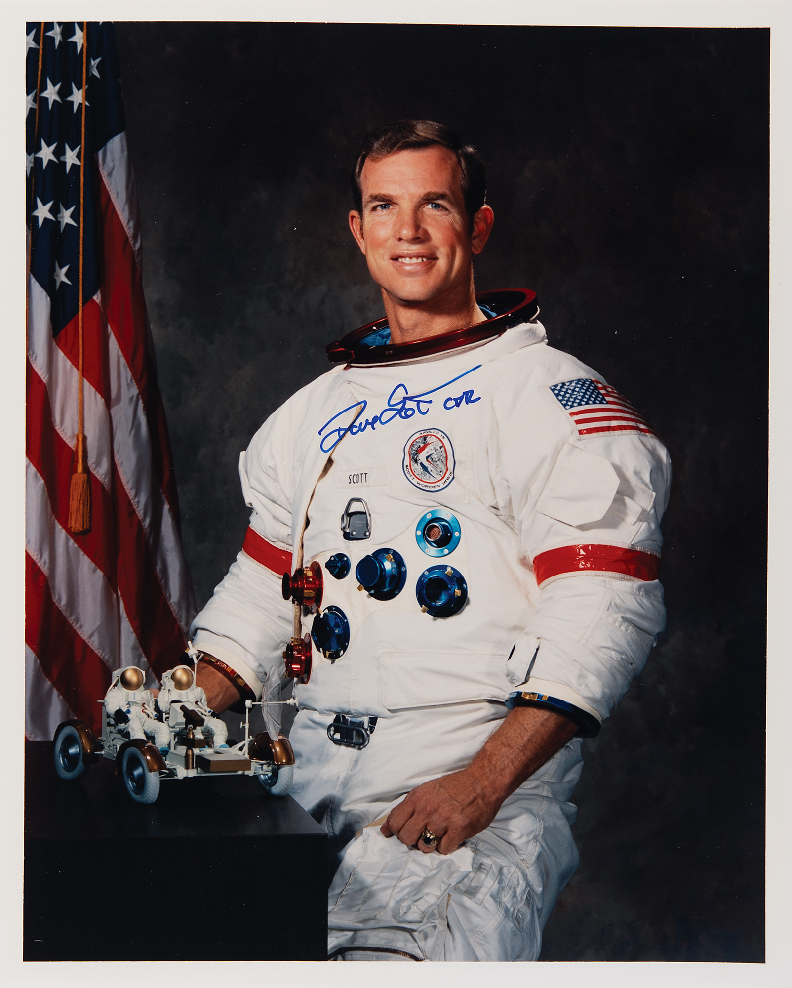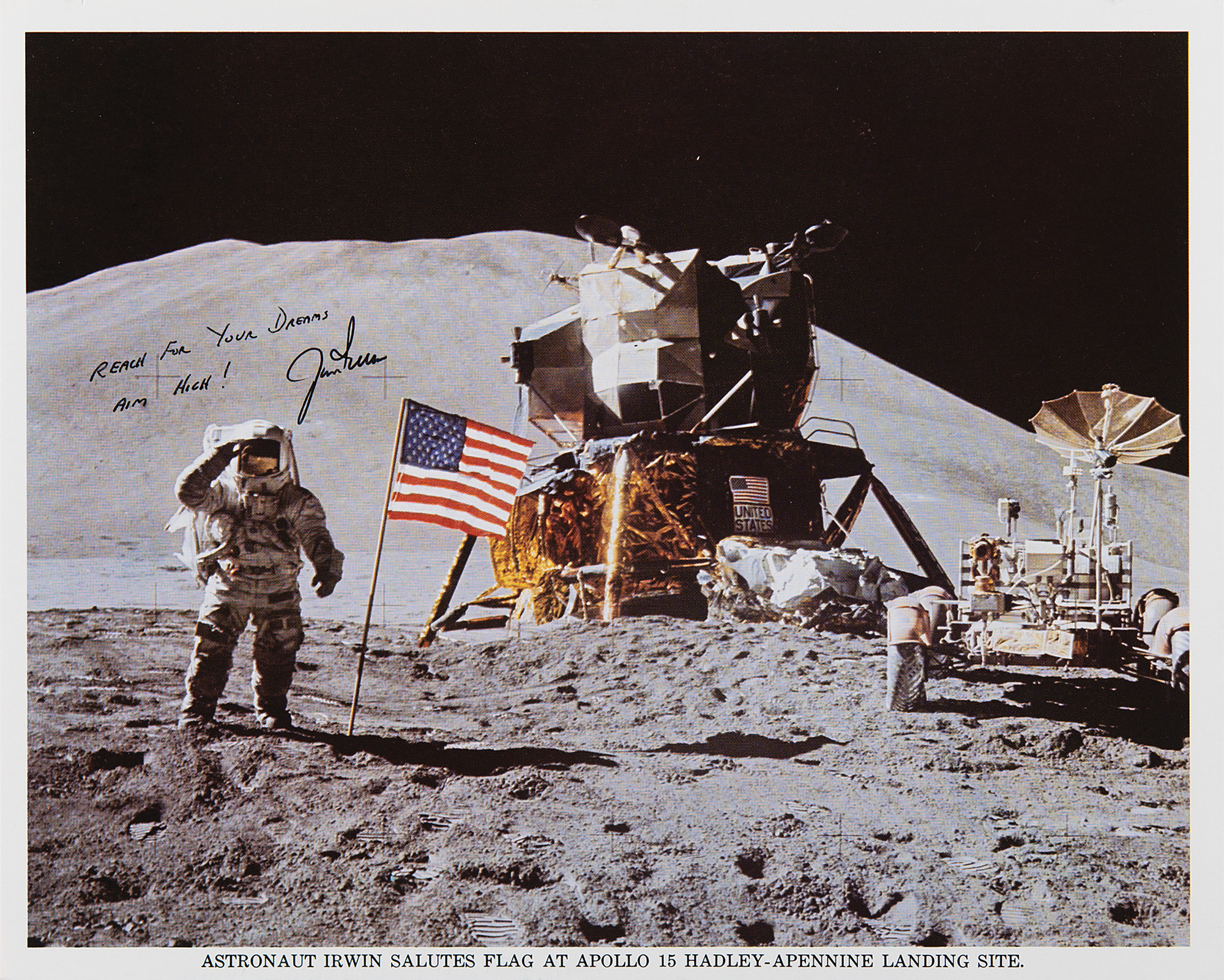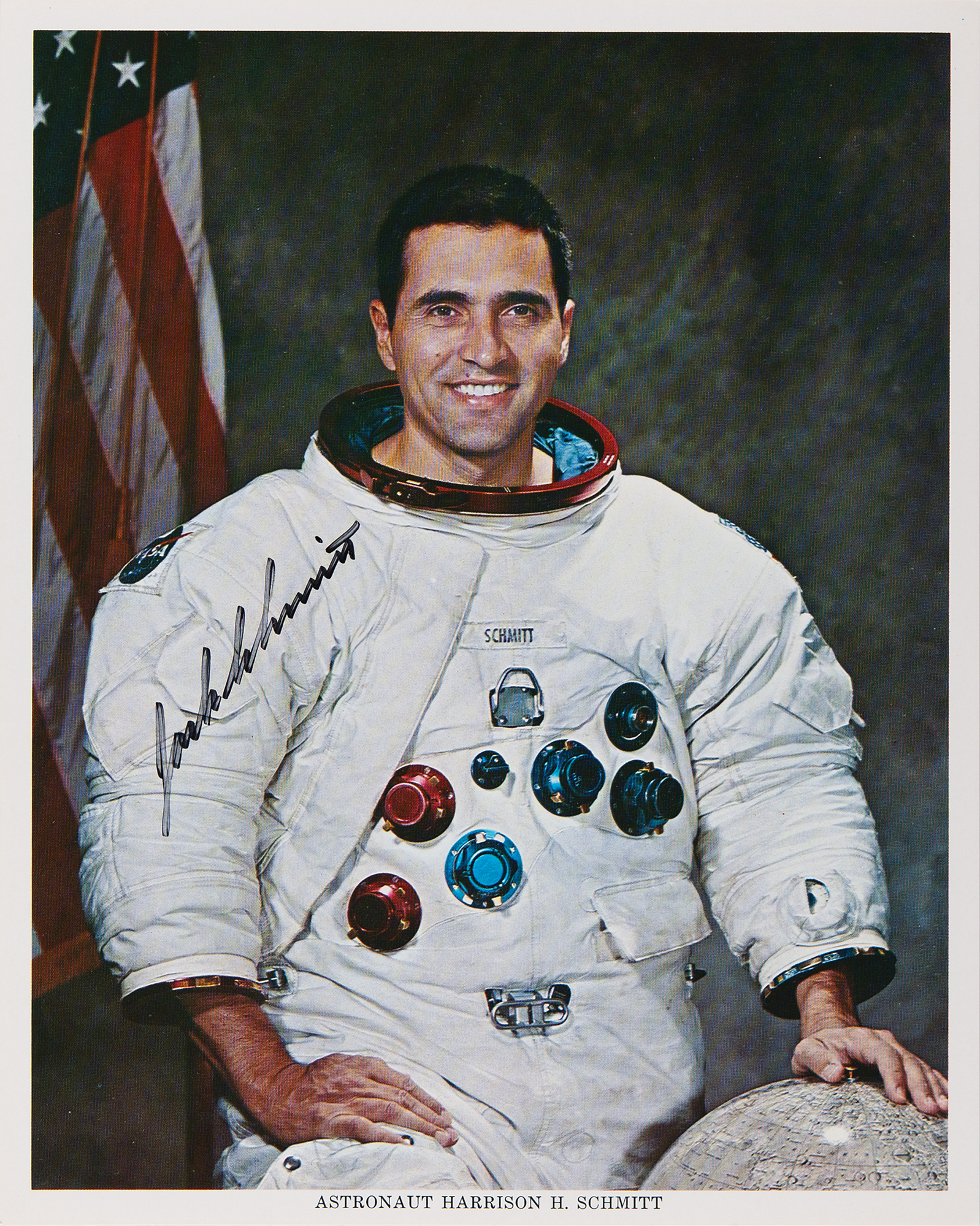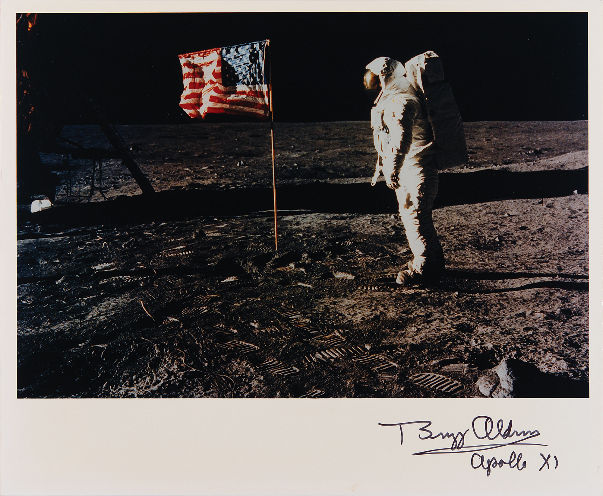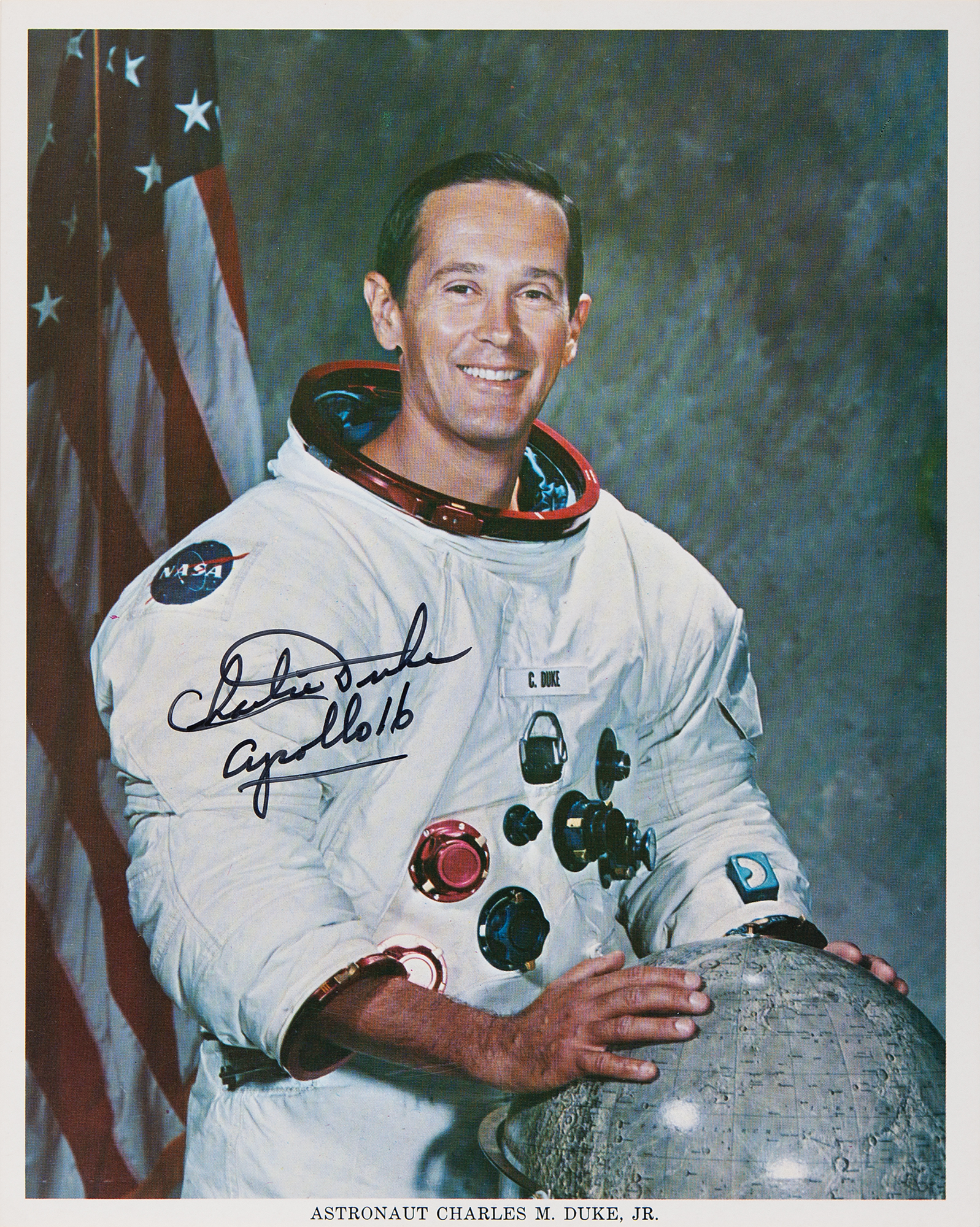 Desirable set of 10 color photos signed by an Apollo moonwalker, 8 x 10 and 10 x 8, half of which are official NASA lithographs, each uninscribed and signed in blue or black felt tip by the following astronauts: “Buzz Aldrin, Apollo XI,” “Charles Conrad, Jr.,” “Reach for the stars! Alan Bean, Apollo 12, Skylab 2,” “Reach for the stars, Alan Shepard,” “Edgar Mitchell, 6th man on the moon,” “Dave Scott, CDR,” “Jim Irwin,” “Charlie Duke, Apollo 16,” “Jack Schmitt,” and “Gene Cernan, Apollo XVII.” The reverse of the Mitchell and Scott photos bear affixed labels from The SpaceSource. In overall fine condition. Accompanied by certificates of authenticity from The SpaceSource for the Mitchell and Scott photos.