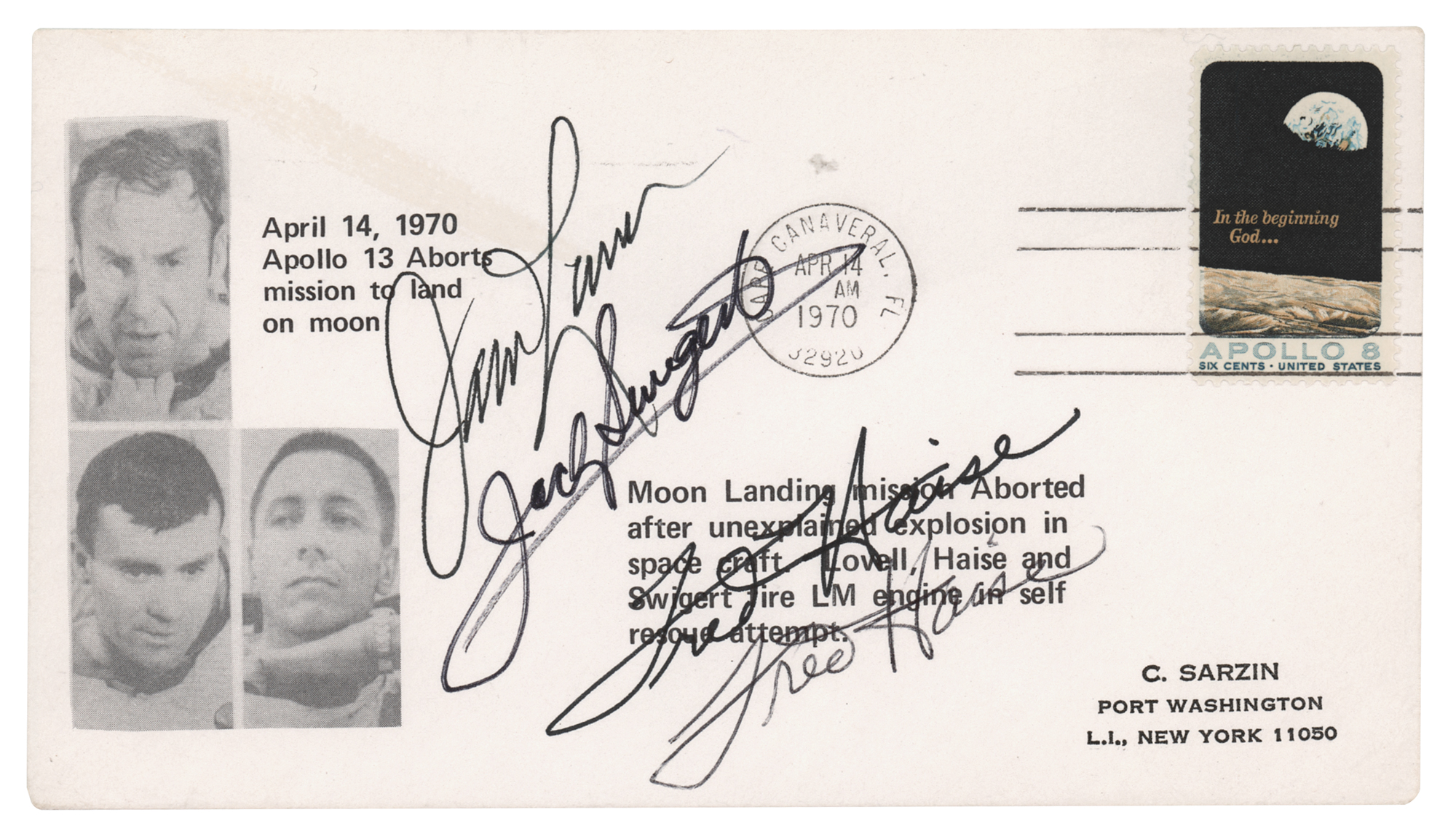 Commemorative cover with Apollo 13 crew images and text related to the mission’s abort on April 14, 1970, the same date of the stamped Cape Canaveral postmark, signed in black ink by James Lovell, in black felt tip by Jack Swigert, and in black ballpoint by Fred Haise, whose autopen signature is above. In very fine condition.