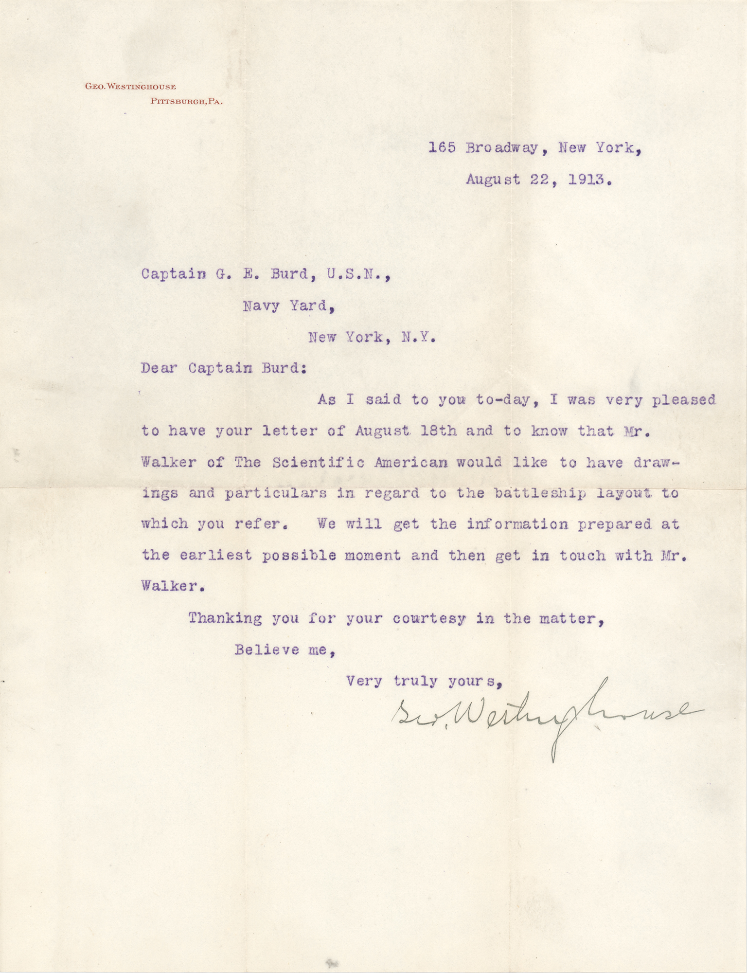 Westinghouse agrees to provide The Scientific American with “drawings and particulars in regard to the battleship layout”