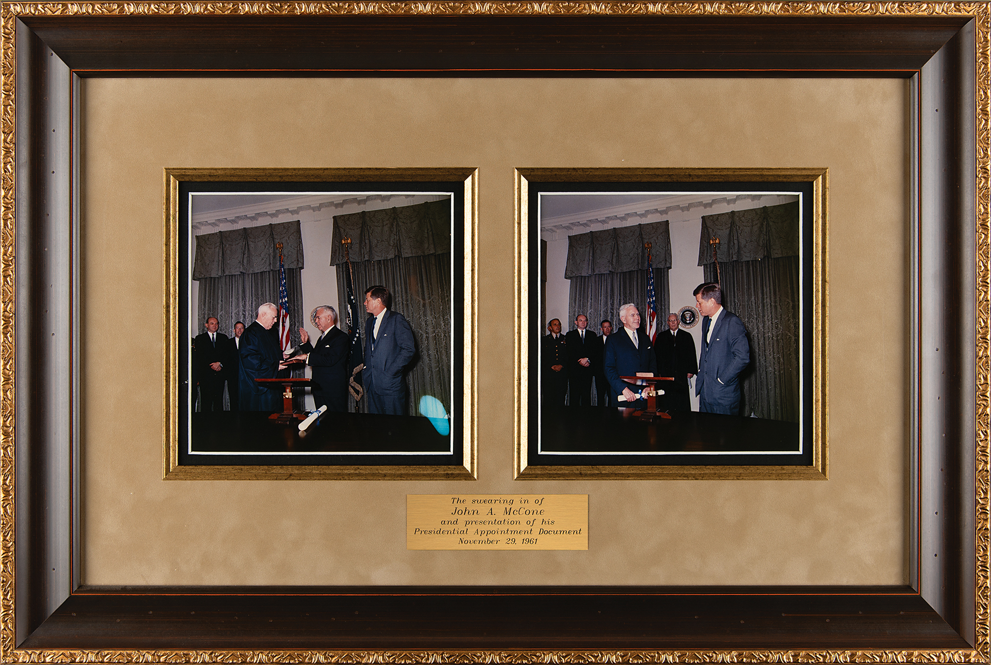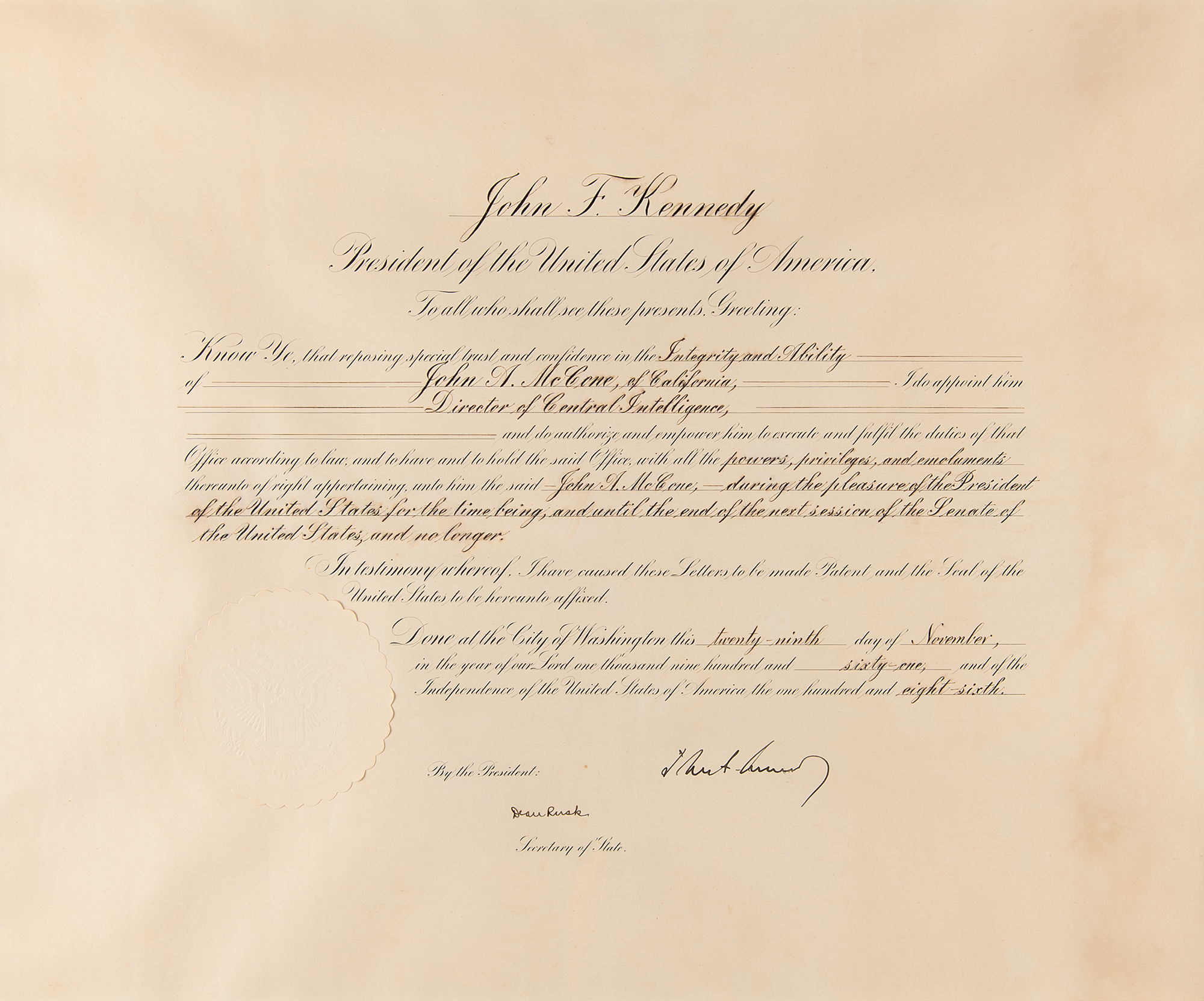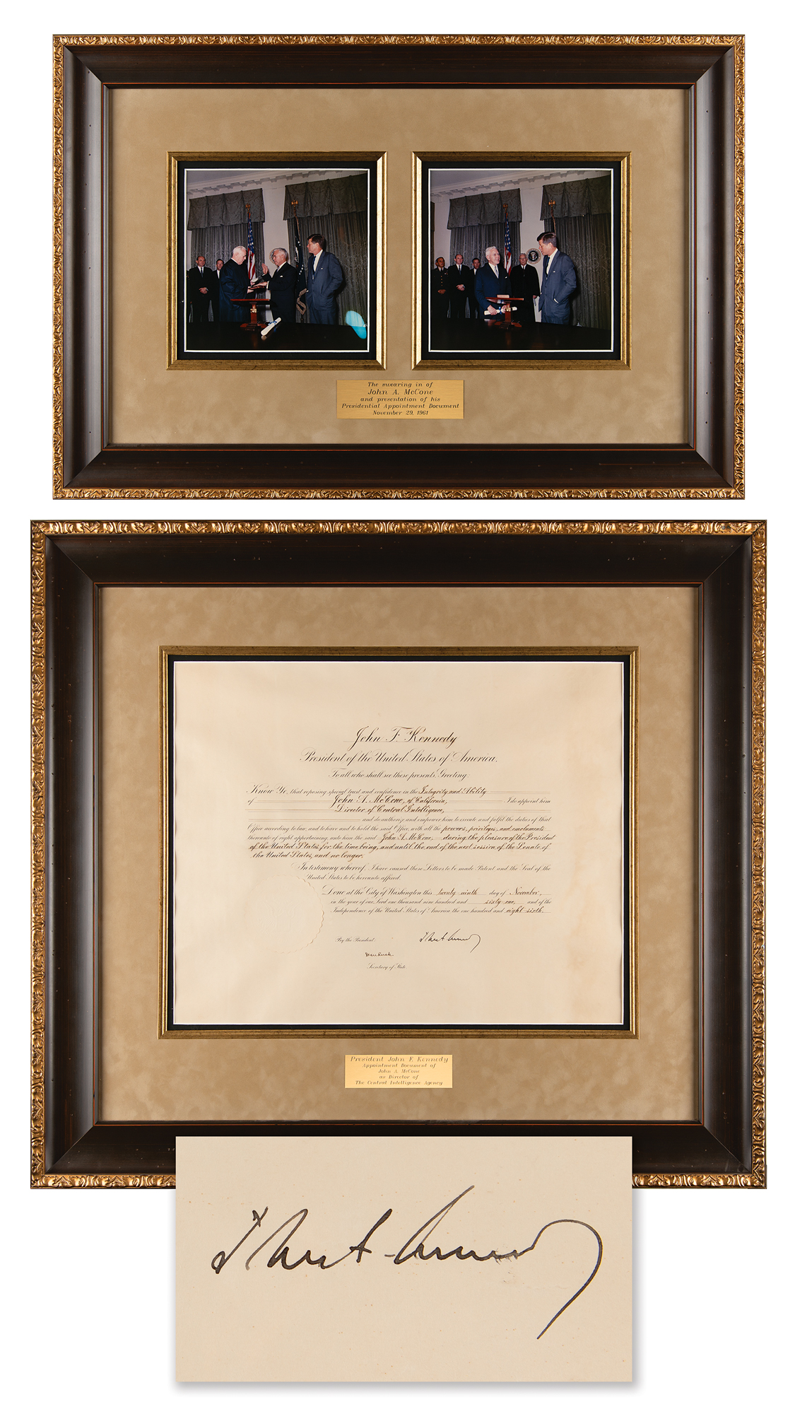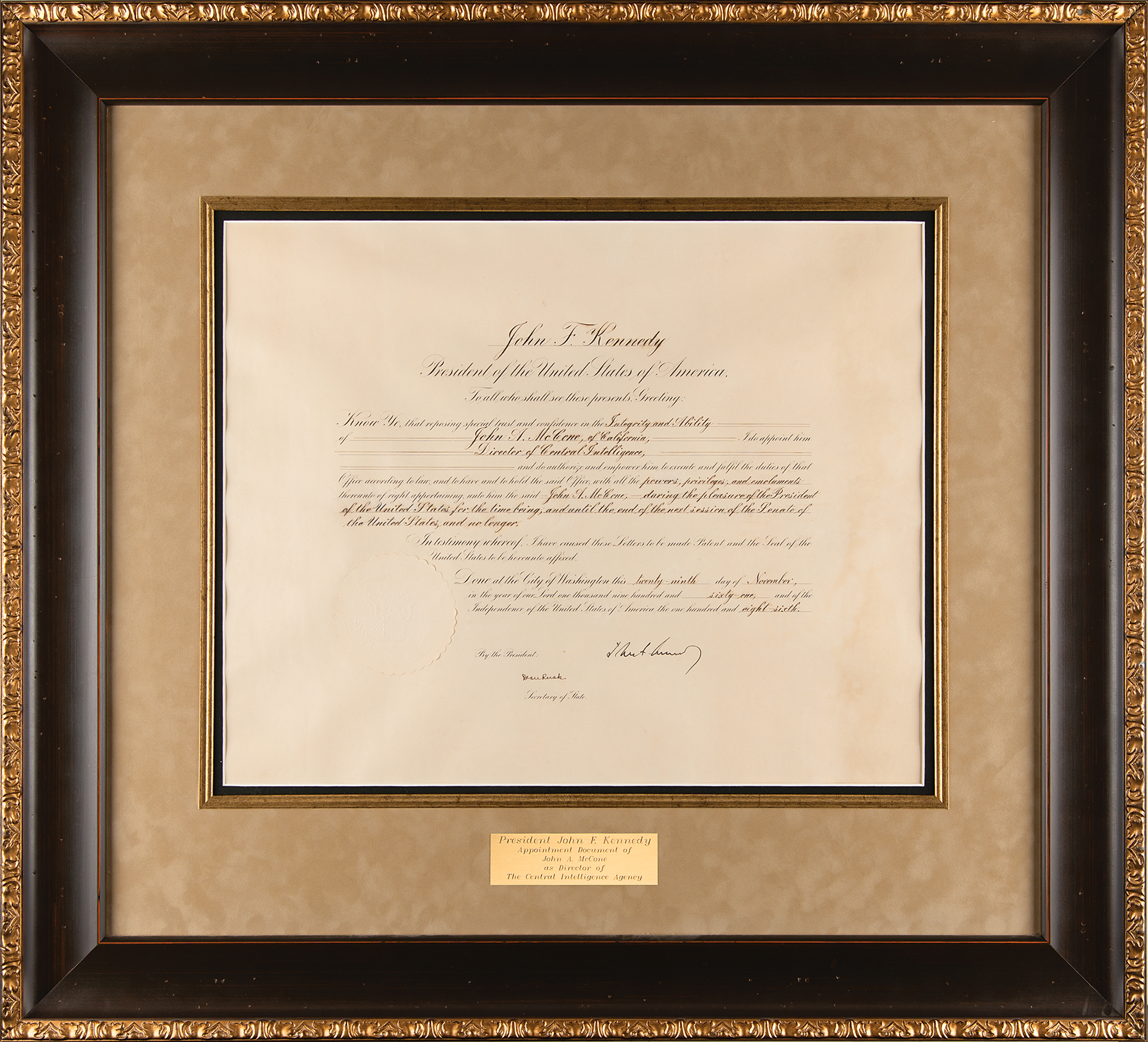 Partly-printed DS as president, one page, 21 x 17, November 29, 1961. President Kennedy appoints John A. McCone of California as "Director of Central Intelligence." Boldly signed at the conclusion by President John F. Kennedy, and countersigned by Secretary of State Dean Rusk. The embossed white paper seal affixed at the lower left remains intact. Impressively suede-matted and framed with a plaque to an overall size of 34 x 31.5. In very good to fine condition, with light dampstaining in the right margin. Accompanied by two color glossy photographs of McCone's swearing-in ceremony, suede-matted and framed with a plaque to an overall size of 27 x 18.5. In overall fine condition.