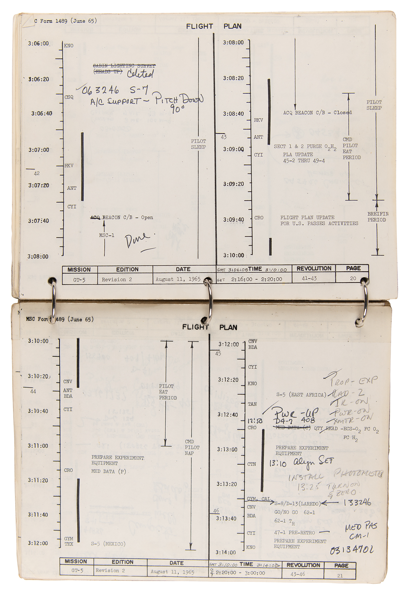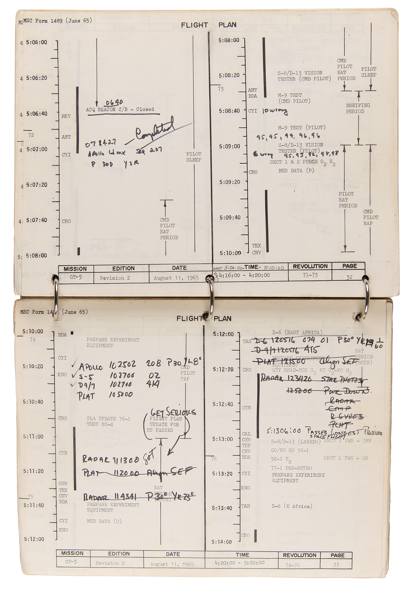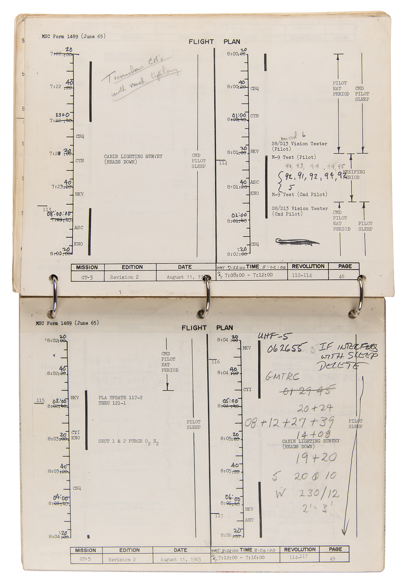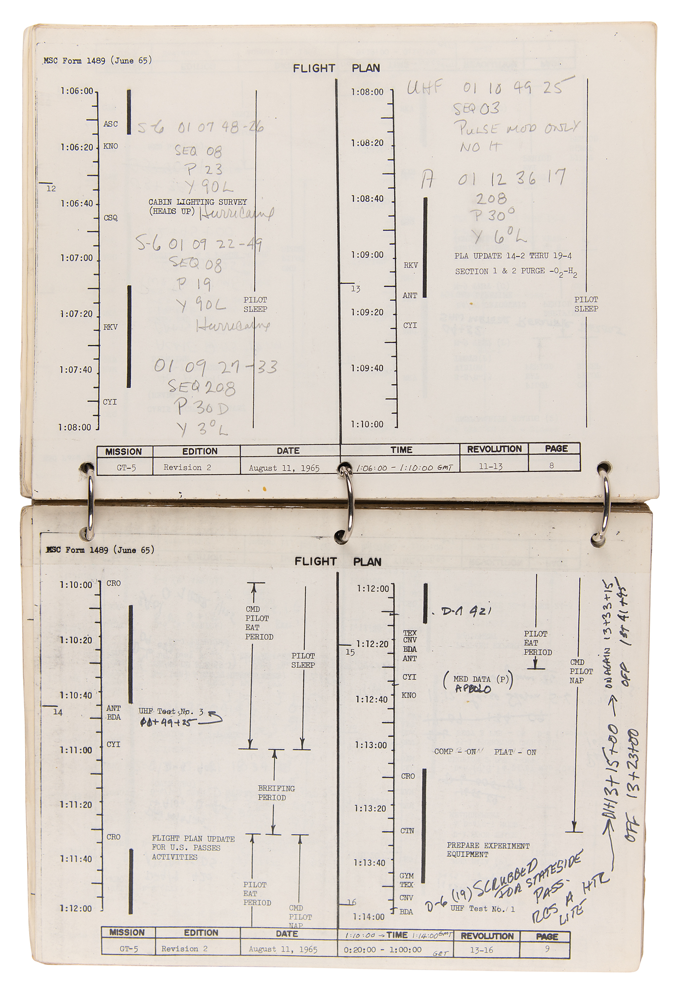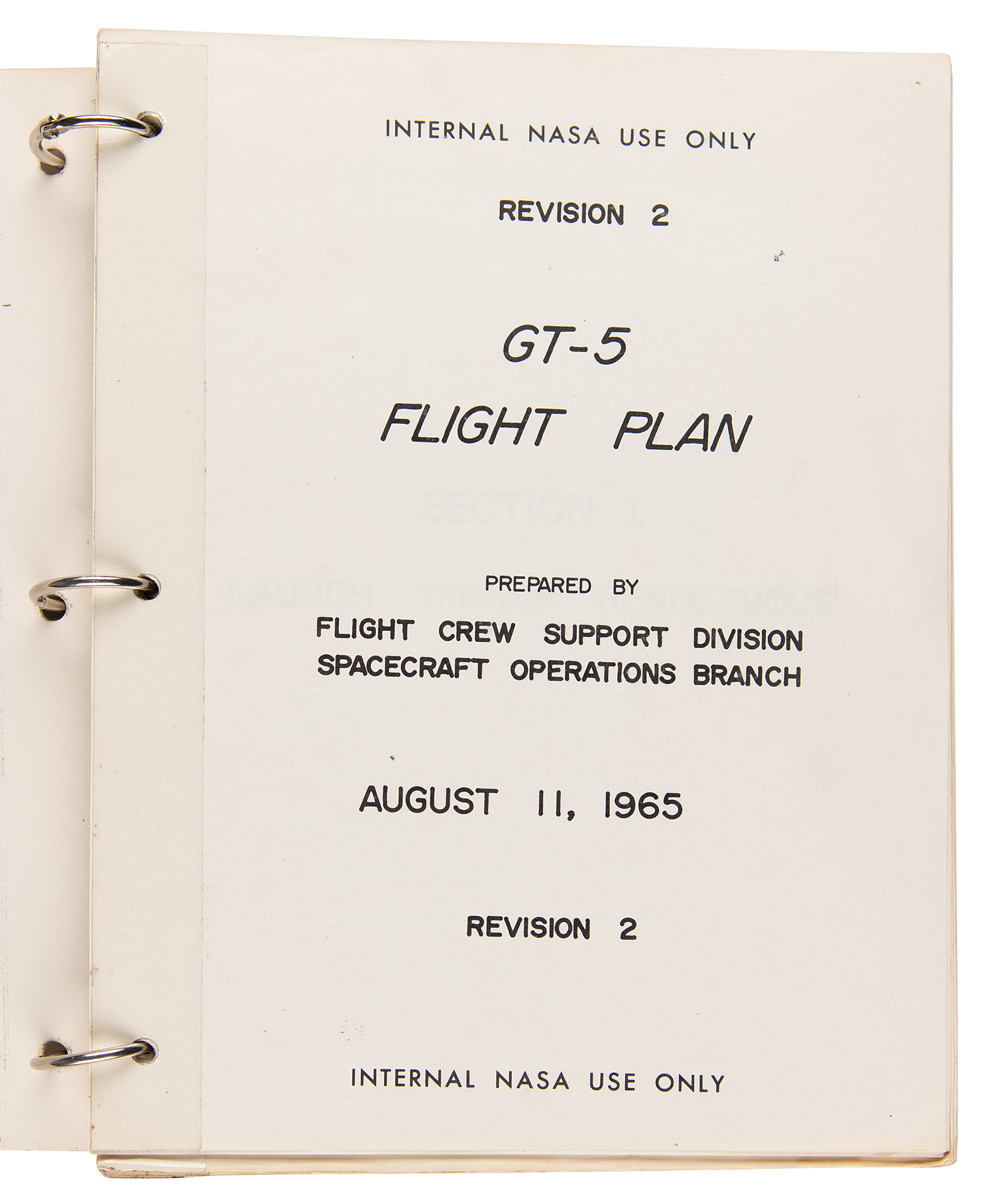 Remarkable flown Gemini 5 flight plan used by Charles Conrad on the third crewed Gemini flight, identified on the front as "Part No. CF55069, Dash 1, S/N 50, SC 5, Book 1, Remarks: Flight Plan," with the title page reading: "Revision 2, GT-5 Flight Plan, Prepared by Flight Crew Support Division, Spacecraft Operations Branch, August 11, 1965," and marked, "Internal NASA Use Only." The ring-bound plan measures 8 x 10.5 and contains 90 sheets (many double-sided), inclusive of the stiff covers. It is divided into "Section I: Launch Through Rendezvous" and "Section II: Flight Plan," followed by ten sheets of map plates.