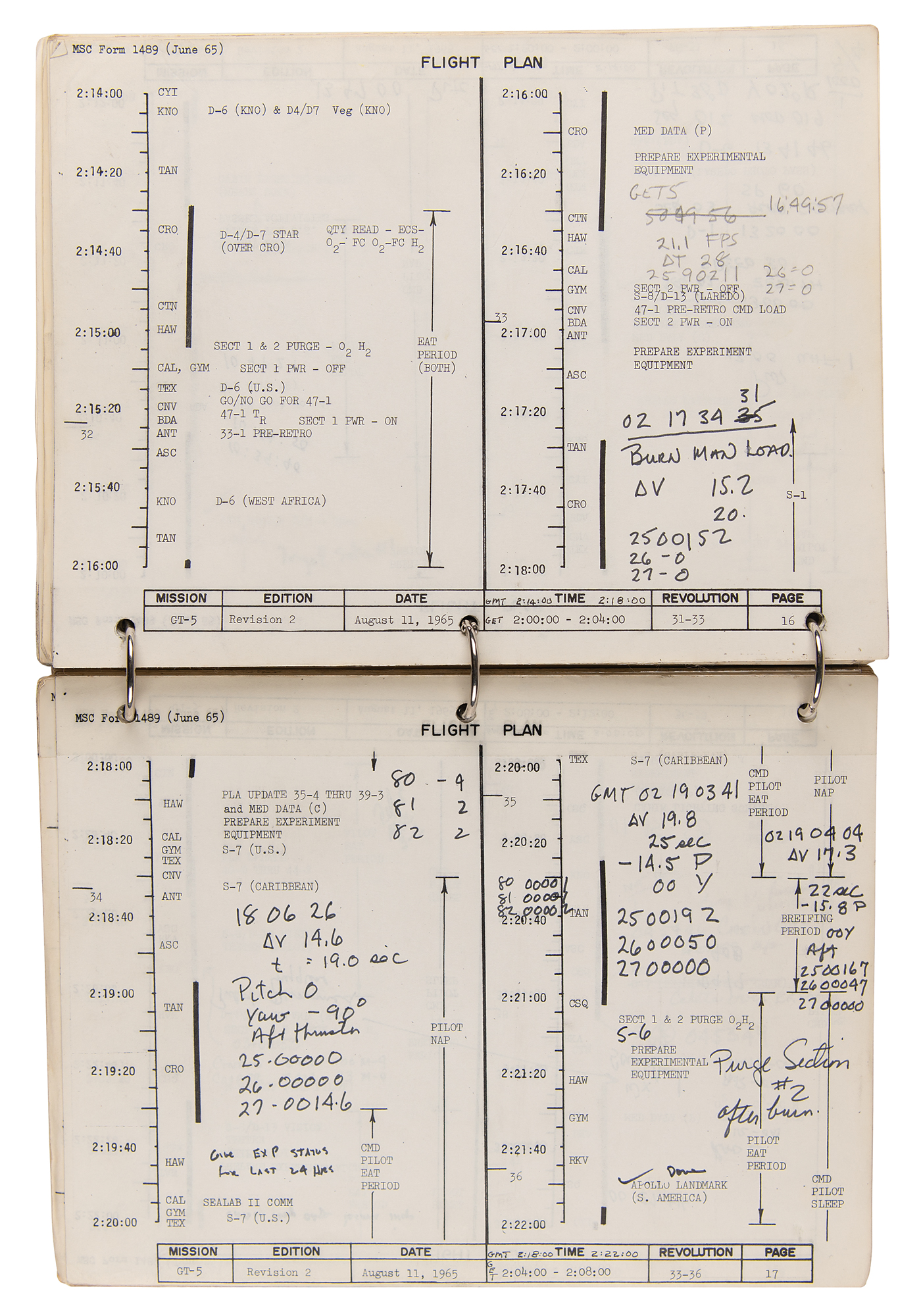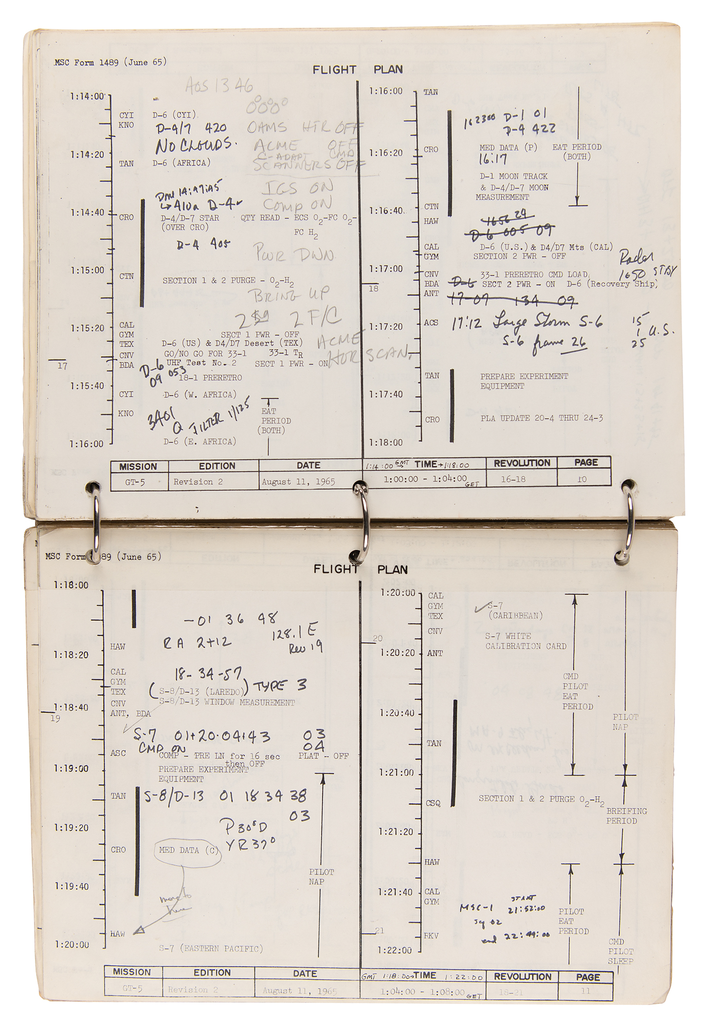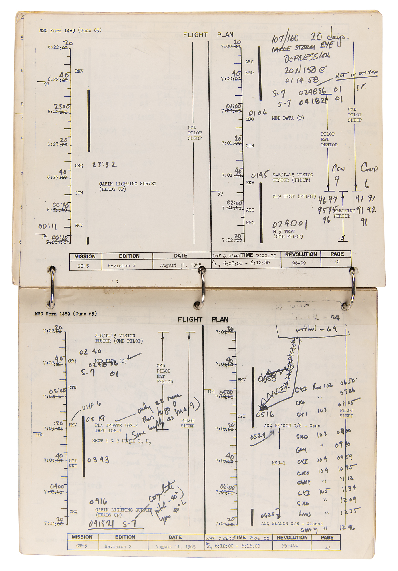 Most of Conrad's extensive handwritten notes come in the second section, recording critical data points and denoting tasks completed or deleted, such as fuel cell purges, crew activities like sleeping and eating periods, and the completion of mission-related checklists. Early on, at 1:04:40, Conrad notes, "Saw meteor reenter below," and at 2:02:50 records that the spacecraft was "dinged by a micrometeorite." He also makes observations of weather patterns seen while in Earth orbit ("Large Storm," "Storm Doreen," and "Large Storm Eye"), and jots down some reminders: "Tell Hou about Pri scanner" and "Get Serious," above scheduled flight plan updates. At 2:01:00, he makes a note to "Congratulate Gordo on exceeding his MA-9 Flight," referring to crewmate Gordon Cooper's 34-hour Project Mercury mission, in which he had become the first American to spend an entire day in space. The Gemini 5 mission was another record-breaker, coming in at 7 days, 22 hours, 55 minutes, 14 seconds—just under their '8 Days or Bust' slogan, but still enough to set a new endurance record. Their flight might have been one day longer, but Gemini 5 was cut short due to the approach of Hurricane Betsy—perhaps one of the weather patterns observed while on orbit. The rear board bears two affixed Velcro strips for securing the plan within the Gemini spacecraft. In very good to fine condition, with general wear from use.