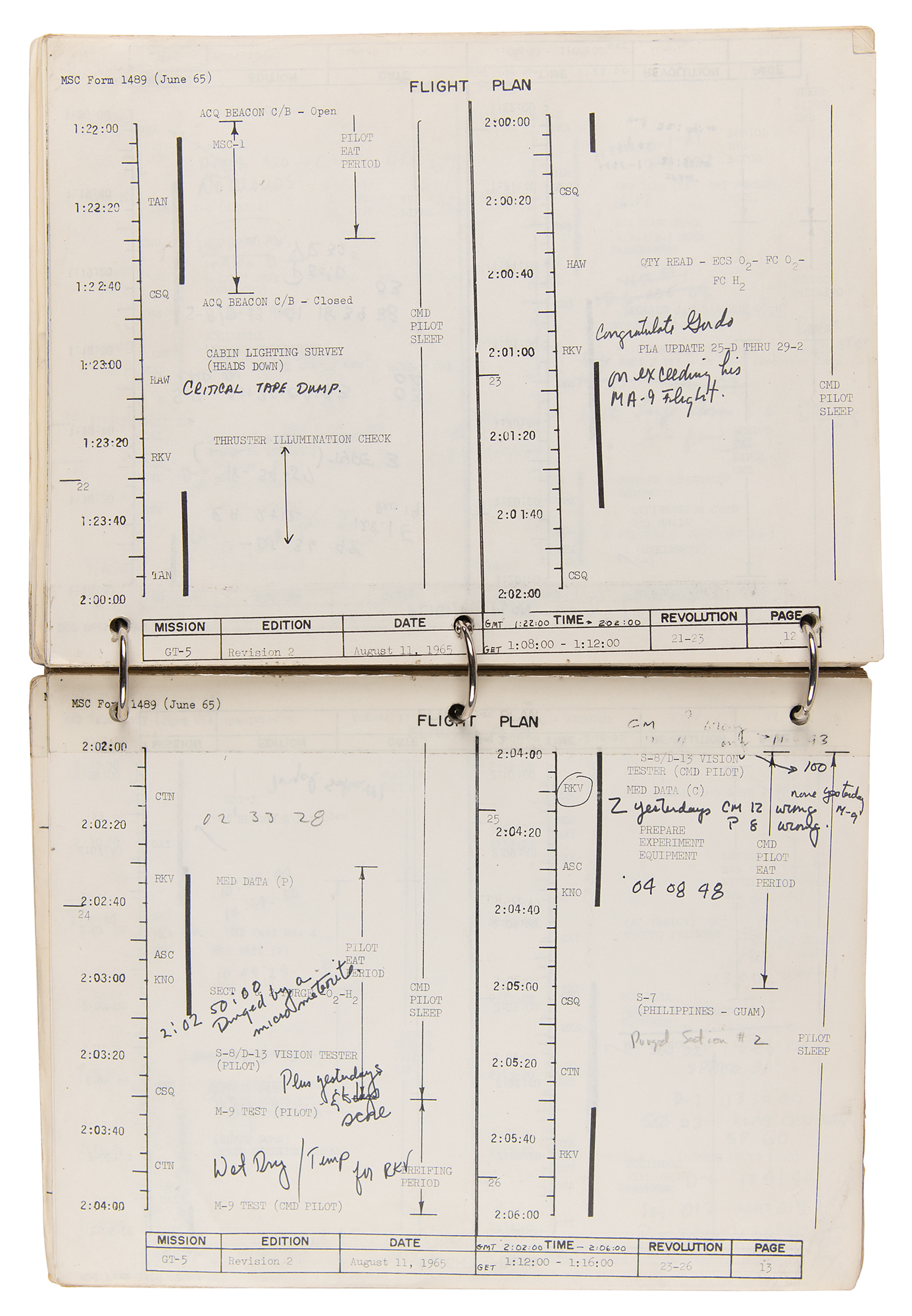 Charles Conrad's flown Gemini 5 flight plan, heavily annotated while in Earth orbit: "Congratulate Gordo on exceeding his MA-9 Flight"