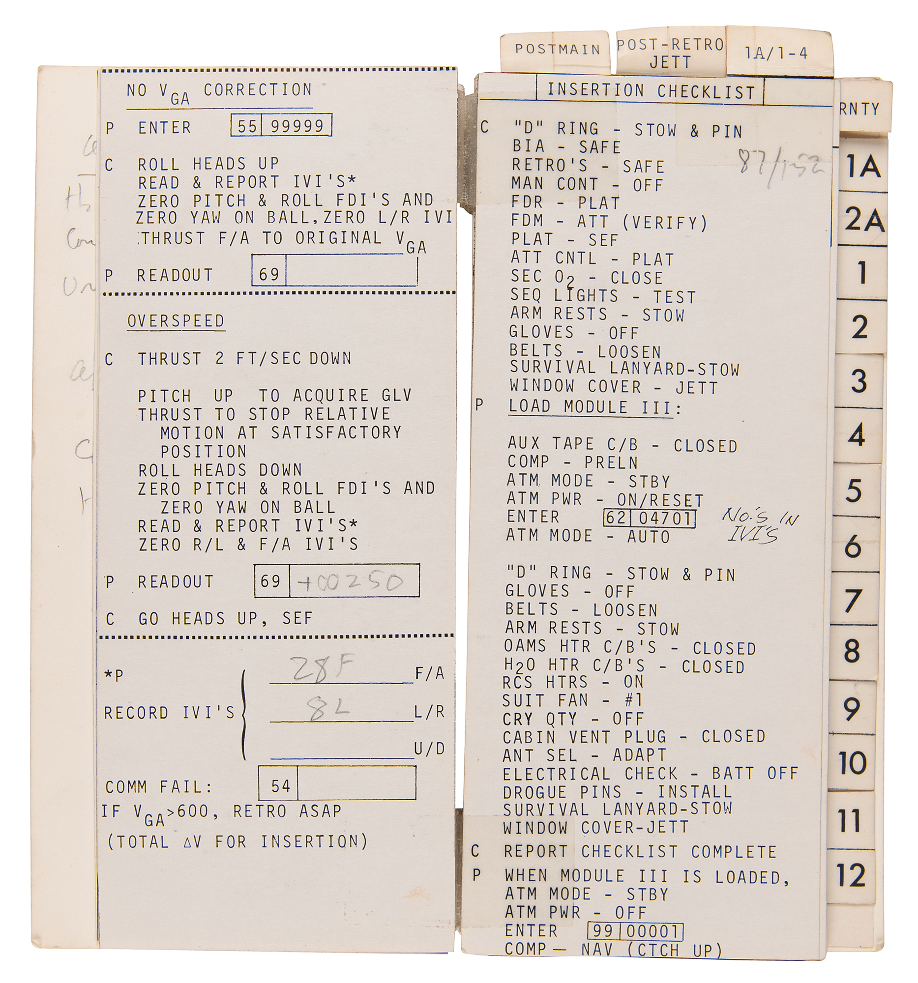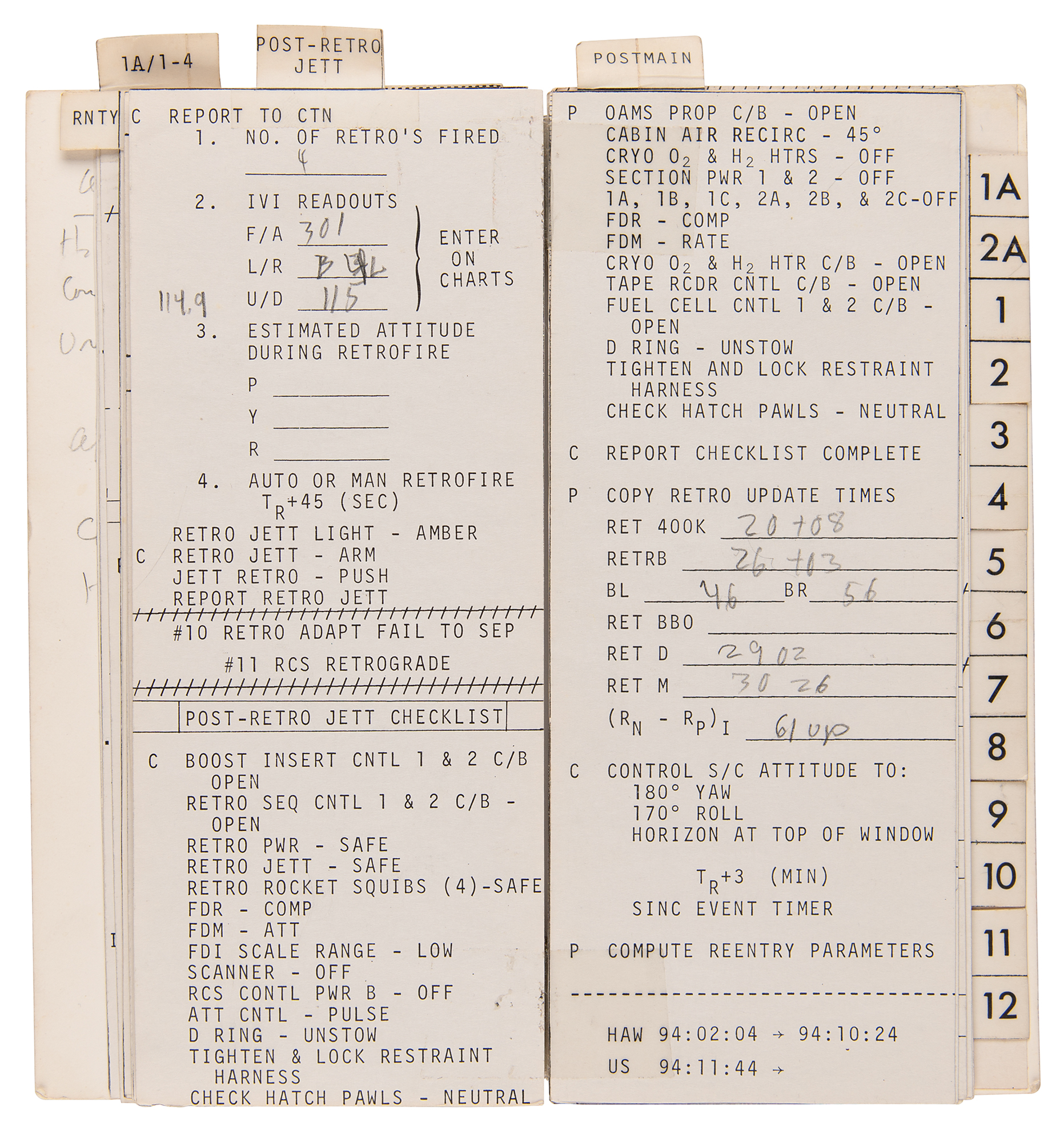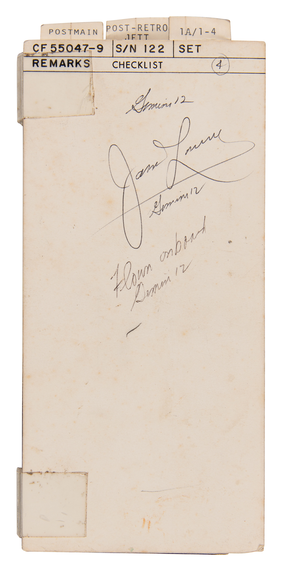 Scarce flown Gemini 12 checklist used on the mission by Command Pilot James Lovell, identified on the front as "CF 55047-9, S/N 112, Remarks: Checklist," and signed and flight-certified in black ballpoint, "Gemini 12, James Lovell, Gemini 12, Flown onboard Gemini 12." The tape-bound 3.75 x 8.5 checklist contains 20 double-sided pages plus stiff covers, with tabbed sections labeled "1A/1-4," "RNTY," "Post-Retro Jett," and "Postmain." It features numerous pencil notations inside in Lovell's own hand, with a list of instructions related to drinking water written inside the front cover. Other notations record critical flight metrics such as IVI values, wind and altitude data, coordinates, and other readouts. One ink notation designates settings for the 16mm camera: "f8, 1/250, 1 Frame/Sec." The rear board bears an affixed Velcro strip for securing the checklist within the Gemini spacecraft. In very good to fine condition, with light soiling and overall wear from use.