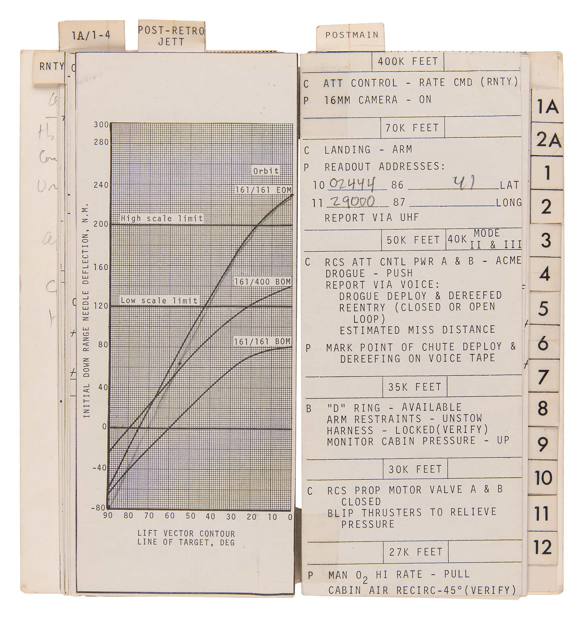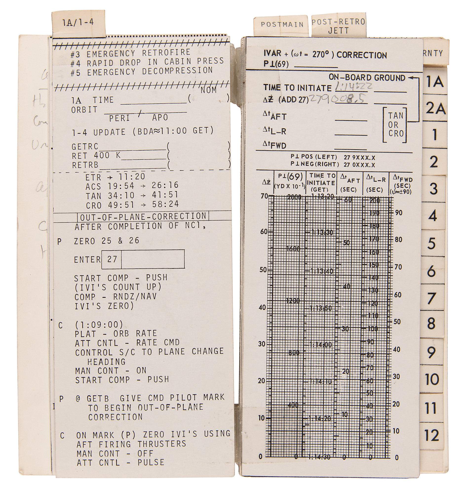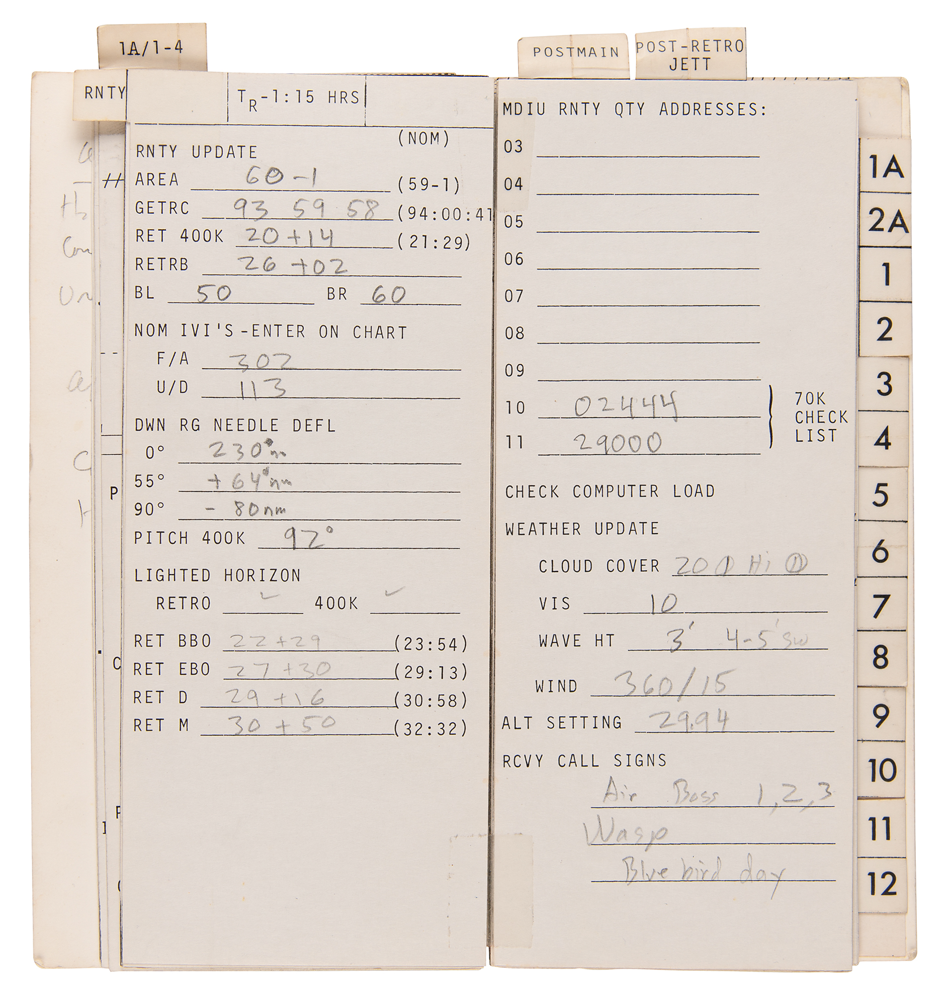 Scarce flown Gemini 12 checklist used on the mission by Command Pilot James Lovell, identified on the front as "CF 55047-9, S/N 112, Remarks: Checklist," and signed and flight-certified in black ballpoint, "Gemini 12, James Lovell, Gemini 12, Flown onboard Gemini 12." The tape-bound 3.75 x 8.5 checklist contains 20 double-sided pages plus stiff covers, with tabbed sections labeled "1A/1-4," "RNTY," "Post-Retro Jett," and "Postmain." It features numerous pencil notations inside in Lovell's own hand, with a list of instructions related to drinking water written inside the front cover. Other notations record critical flight metrics such as IVI values, wind and altitude data, coordinates, and other readouts. One ink notation designates settings for the 16mm camera: "f8, 1/250, 1 Frame/Sec." The rear board bears an affixed Velcro strip for securing the checklist within the Gemini spacecraft. In very good to fine condition, with light soiling and overall wear from use.