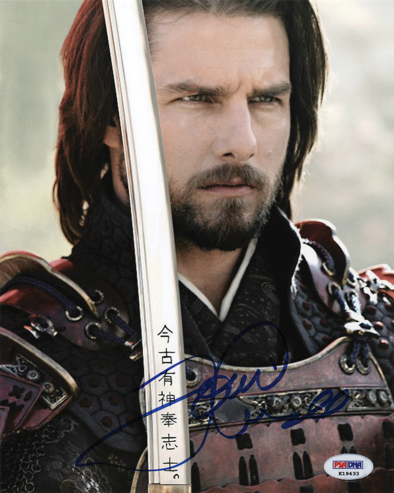 Color glossy 8 x 10 close-up photo of Tom Cruise in The Last Samurai, signed in blue felt tip. In fine condition, with a PSA/DNA authentication label affixed to the lower right corner. Accompanied by a certificate of authenticity from PSA/DNA.