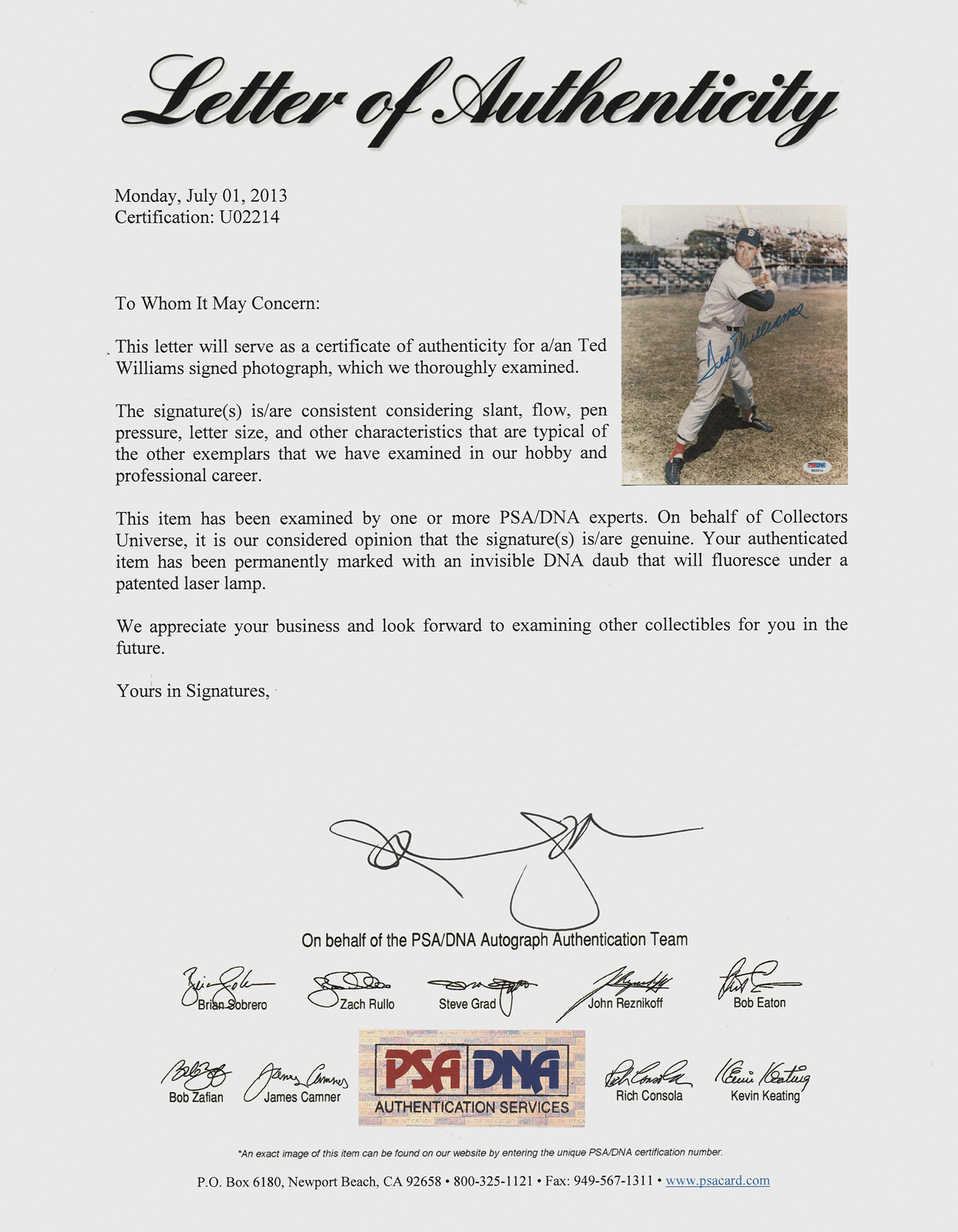 Color glossy 8 x 10 full-length photo of Ted Williams wearing his Boston Red Sox uniform in a batting pose, signed in blue felt tip. In fine condition, with a faint fingerprint impression to the right side, and a PSA/DNA authentication label affixed to the lower right corner. Accompanied by a full letter of authenticity from PSA/DNA.