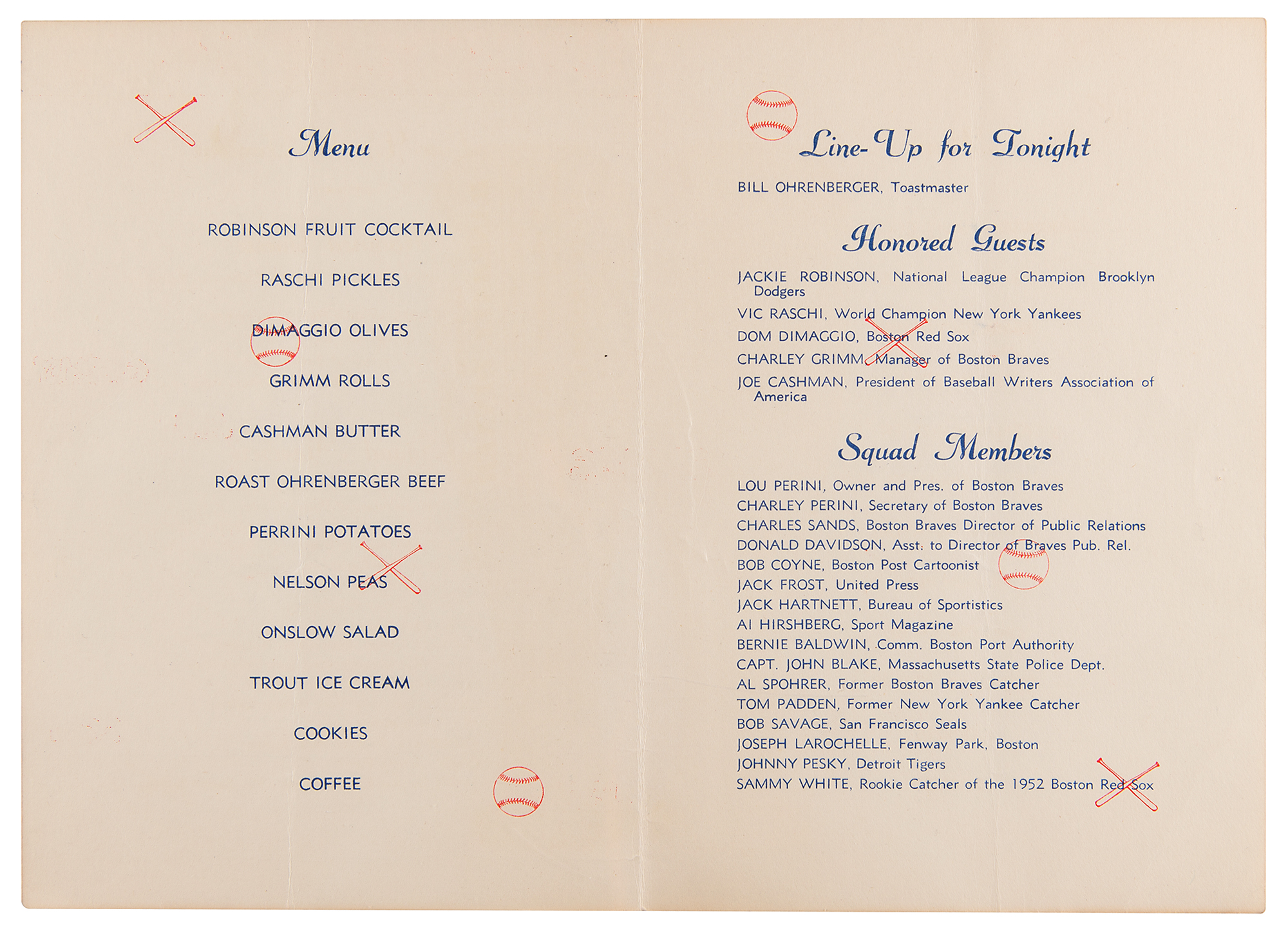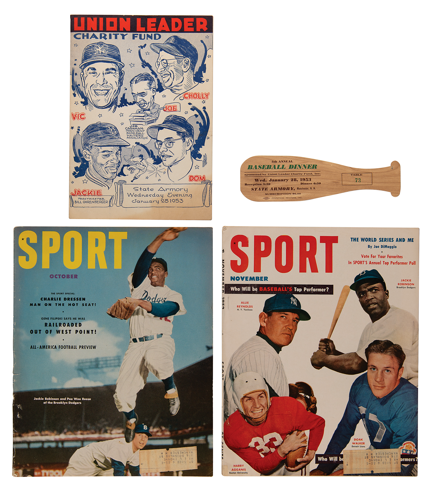 Unsigned program from the Union Leader Charity Fund's 5th Annual Baseball Dinner, two pages, 6.25 x 9, held at the State Armory in Manchester, New Hampshire, on January 28, 1953, featuring Jackie Robinson, Vic Raschi, Dom DiMaggio, Charley Grimm, and Joe Cashman as honored guests. Includes a bat-shaped table card from the charity fundraiser. Includes two complete issues of Sport Magazine from October and November 1952, both featuring Robinson on the cover. In overall very good to fine condition, with light creasing and staining.