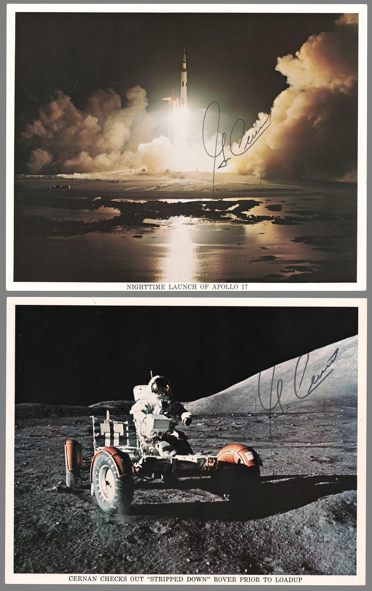 Two official color 10 x 8 NASA lithographs showing the nighttime launch of Apollo 17 and of Gene Cernan seated on a lunar rover, each signed by Cernan in black felt tip. In overall fine condition.