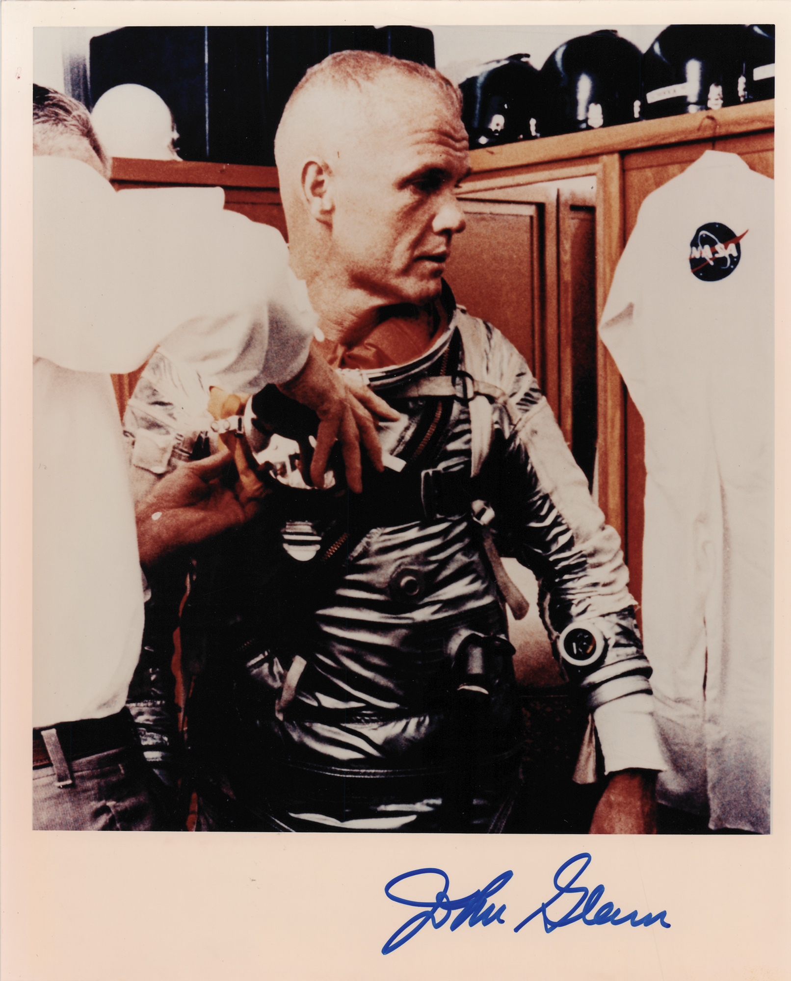 Color semi-glossy 8 x 10 photo of John Glenn in his Mercury space suit, signed in the lower border in blue felt tip. In fine condition.