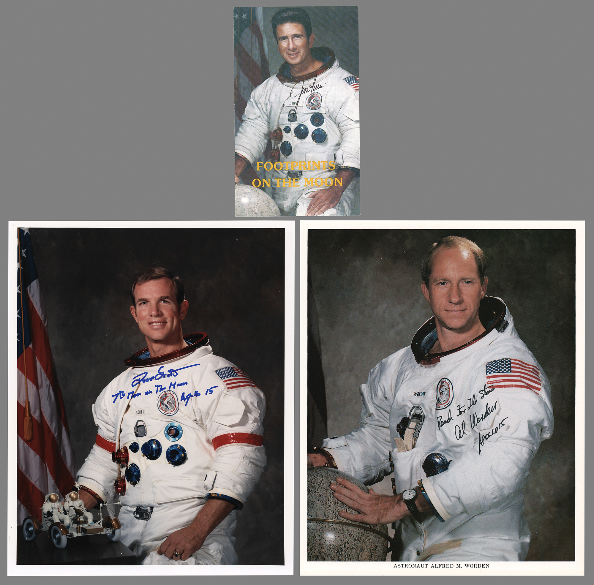 Three items signed by a member of the Apollo 15 crew: a 3.5 x 6 'Footprints on the Moon' pamphlet from the High Flight Foundation showing Jim Irwin in his white space suit, signed in black felt tip by Irwin; an official 8 x 10 NASA lithograph showing Al Worden in his white space suit with his hands on a moon globe, signed in black felt tip, “Reach for the stars, Al Worden, Apollo 15”; and a semi-glossy 8 x 10 photo of Dave Scott standing in his white space suit pictured with a model of the lunar rover, signed in blue felt tip, “Dave Scott, 7th man on the moon, Apollo 15.” In overall fine condition, with a light crease to the upper right corner of the Irwin photo.