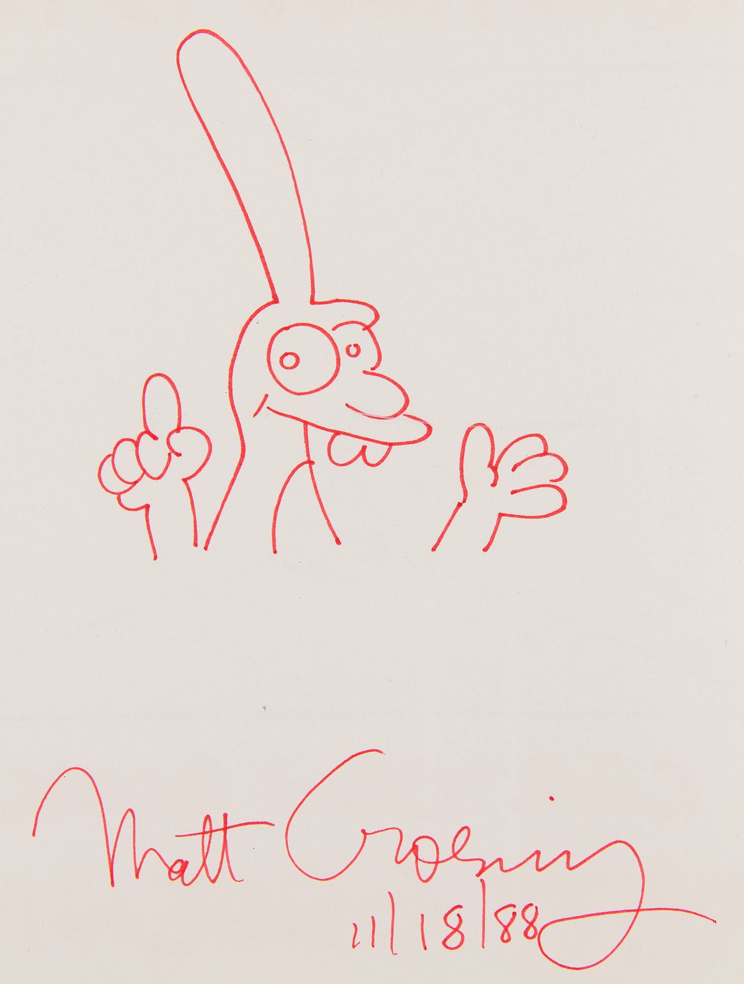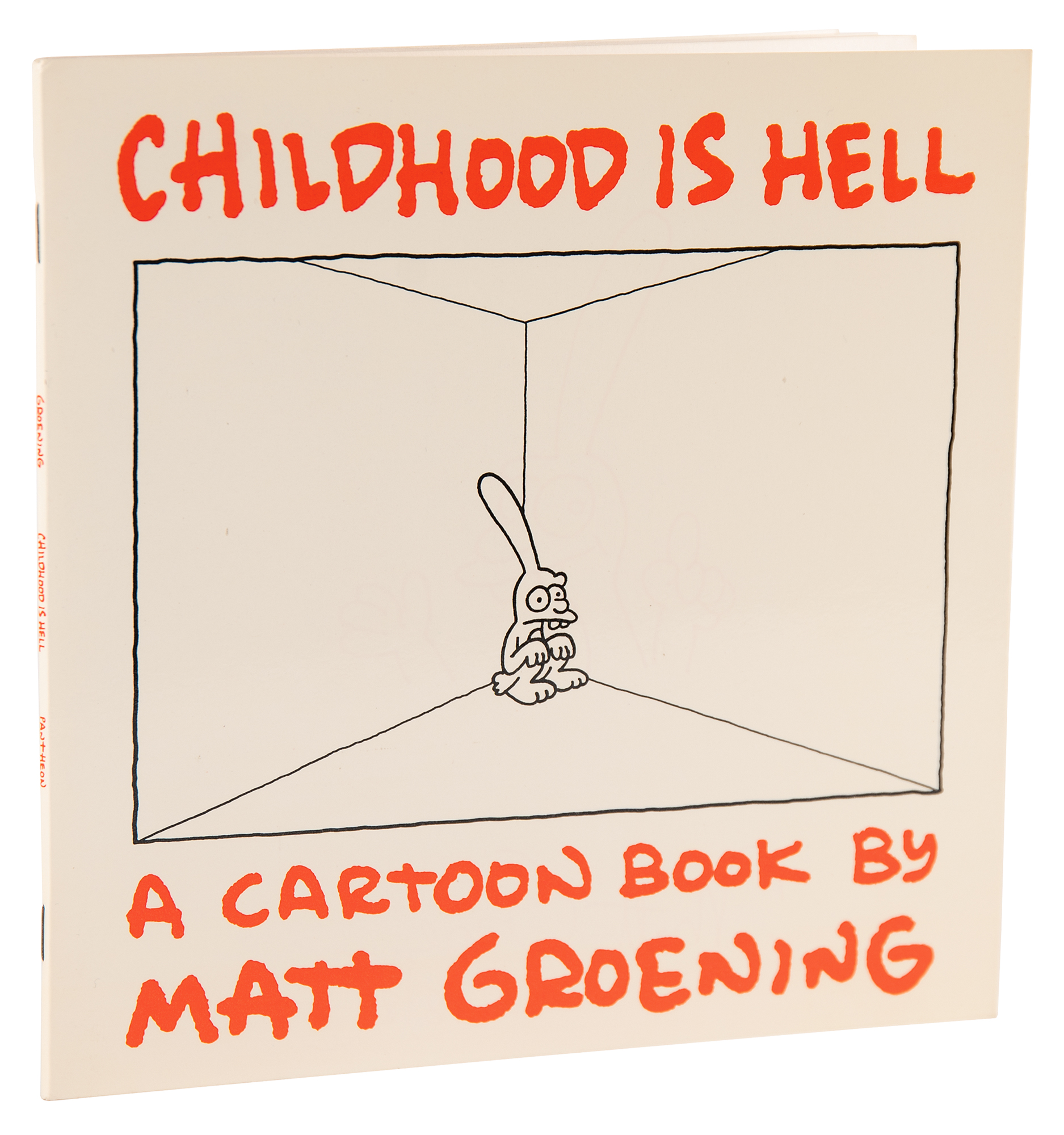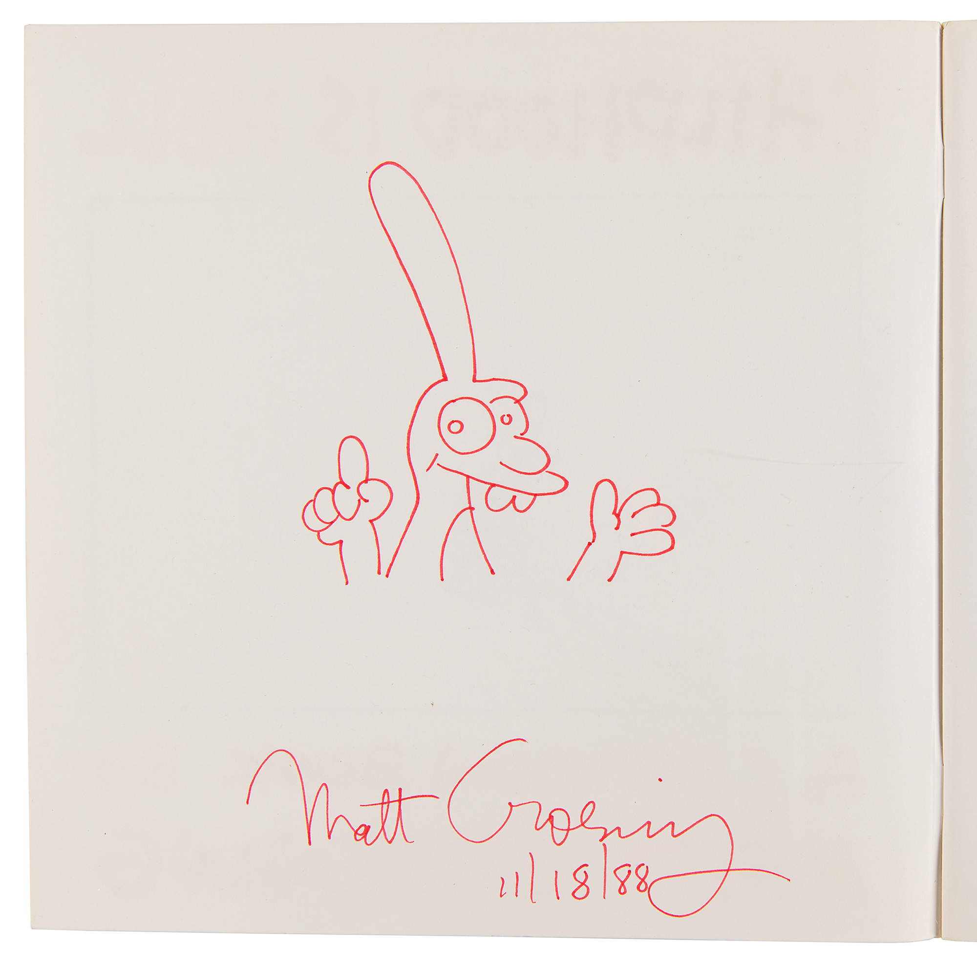 Signed book: Childhood Is Hell. First edition. NY: Pantheon Books, 1988. Softcover, 9 x 9. Signed on the inside front cover in red felt tip, "Matt Groening, 11/18/88," adding a fantastic bust-length sketch of Bongo, the illegitimate one-eared son of Binky. In fine condition. A choice uninscribed example.