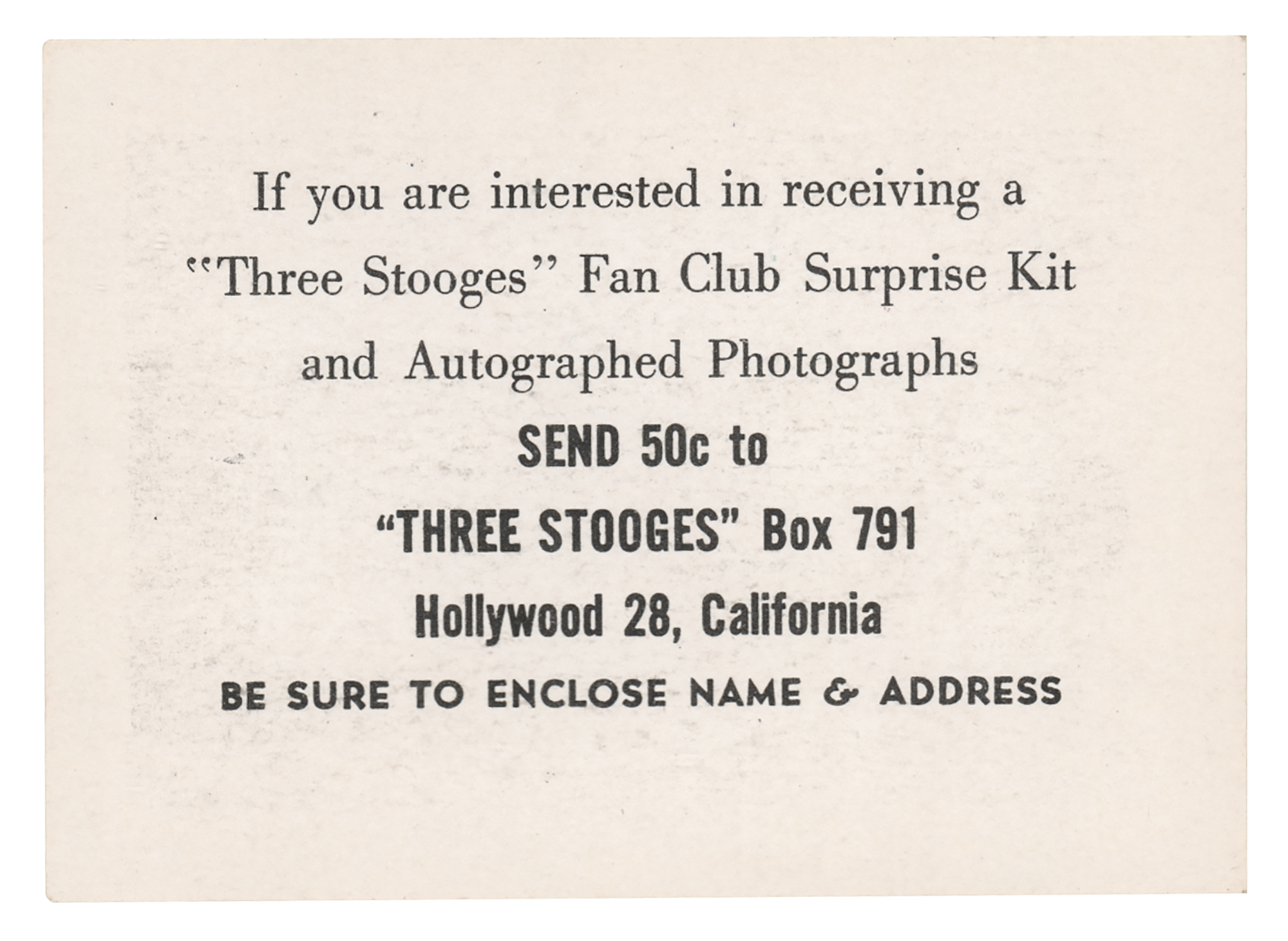 Choice 2.5 x 3.5 promo card for the 'Three Stooges' Fan Club, signed and inscribed in various inks entirely in the hand of Moe Howard, who signs on behalf of all three: "To Linda, Love, The 3 Stooges, Moe, Curly Joe, Larry." In very fine condition.