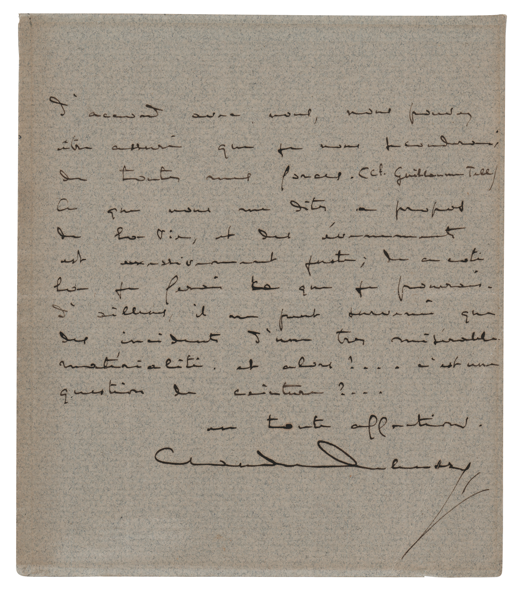 ALS in French, two pages, 5 x 6, no date. Handwritten letter to his publisher and benefactor Georges Hartmann, in part: "As you must know, we have come, my wife and I, quite far from home and we have presented our respects to the Florentine pearl. I have naturally not received anything from Colonne—perhaps he is dodging. As for Pelleas, it would be unfortunate if I were not completely in agreement with you, and you may rest assured that we would…with all our strength (as in William Tell). What you say to me about my life and happenings is excessively correct. And be assured that, for your good, I shall do all I can. Besides, only incidents of very miserable materialism could occur unaffectedly, and then?" In fine condition, with a short split to the central horizontal fold, and light toning from prior display.