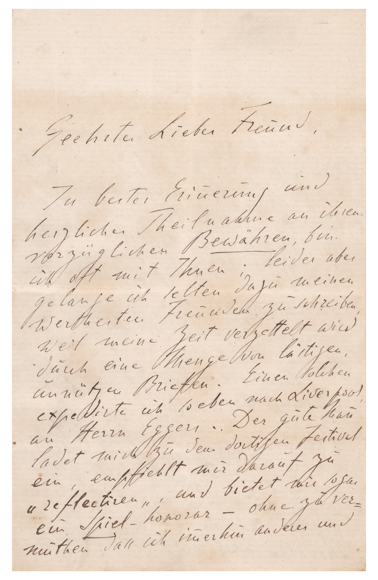 ALS in German, signed “F. Liszt,” three pages on two adjoining sheets, 4.25 x 7, June 21, 1874. Handwritten letter to pianist and conductor Walter Bache, who studied under Liszt and served as a champion of his works in England. In full (translated): "In the fond memory and heartfelt enjoyment of your generous approbation, I am often with you; But unfortunately I seldom succeed in writing to my worthiest friends, as my time is frittered away by a crowd of burdensome unprofitable letters. I have just sent such a one to Mr. Eggers in Liverpool. The good man invited me to the festival there, recommended me to 'reflect' about it, and offered me 10 guineas to play as a fee—without considering that after all I might have something other and better to do than accept this sort of invitation. Concert journeys are quite absurd for me. Fulfilling my duties in Pest and Weimar provide me with quite enough trouble and inconvenience. The rest may remain undecided.