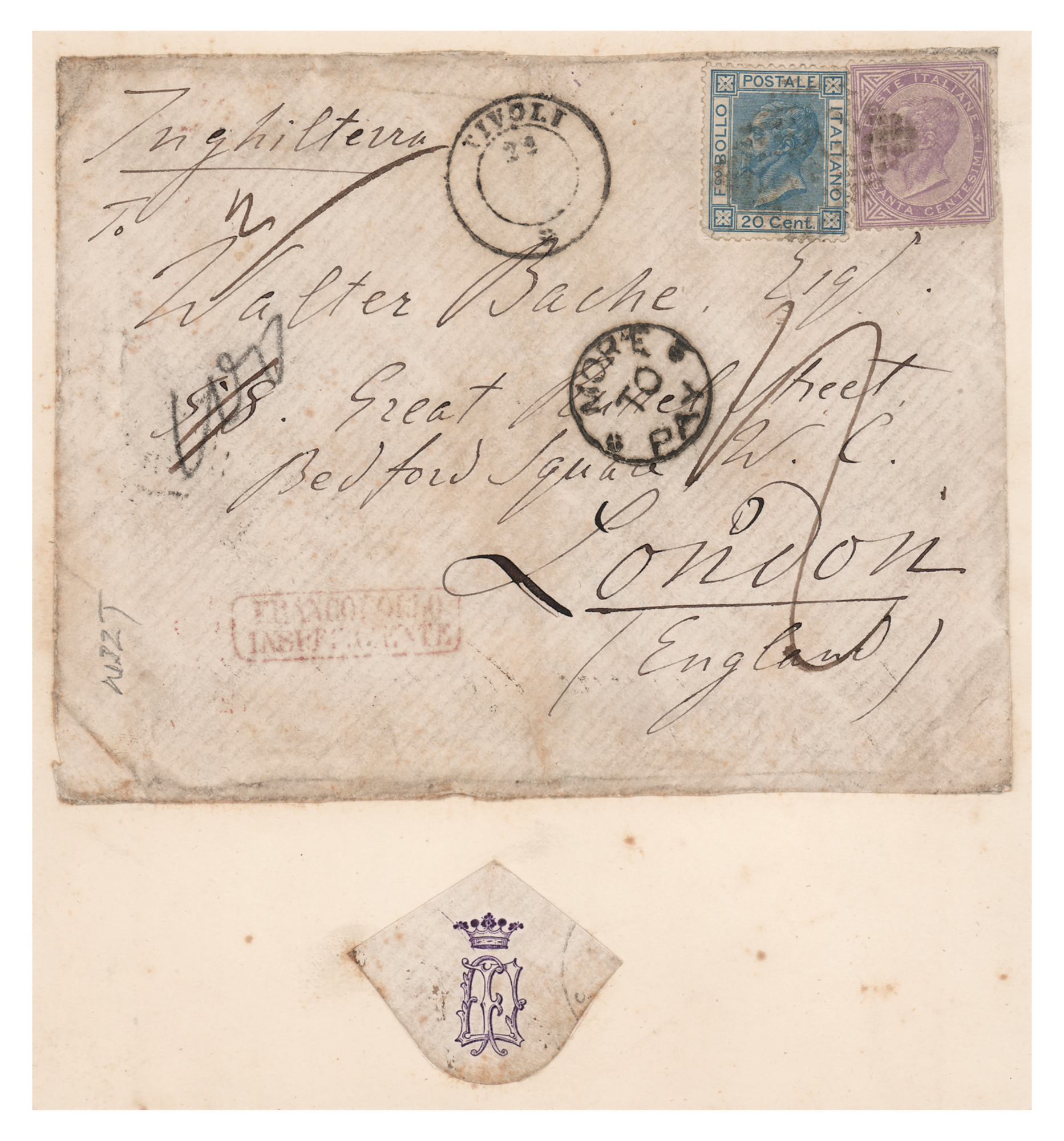 Give my kind regards, with my sincerest feelings, to Herr Daureuther, and do me the kindness of delivering the enclosed thank-you notes to Messrs Hueffer and Gounod. Our highly intelligent and dear daughter-in-law Madame Laussot told me that you, dear Bache, will probably soon be travelling to Italy. A hearty welcome therefore to old abodes where you can rest once again." Affixed to a larger scrapbook page and in fine condition, with scattered light staining. Accompanied by the original mailing panel, addressed in Liszt's own hand, affixed to a slightly larger card.