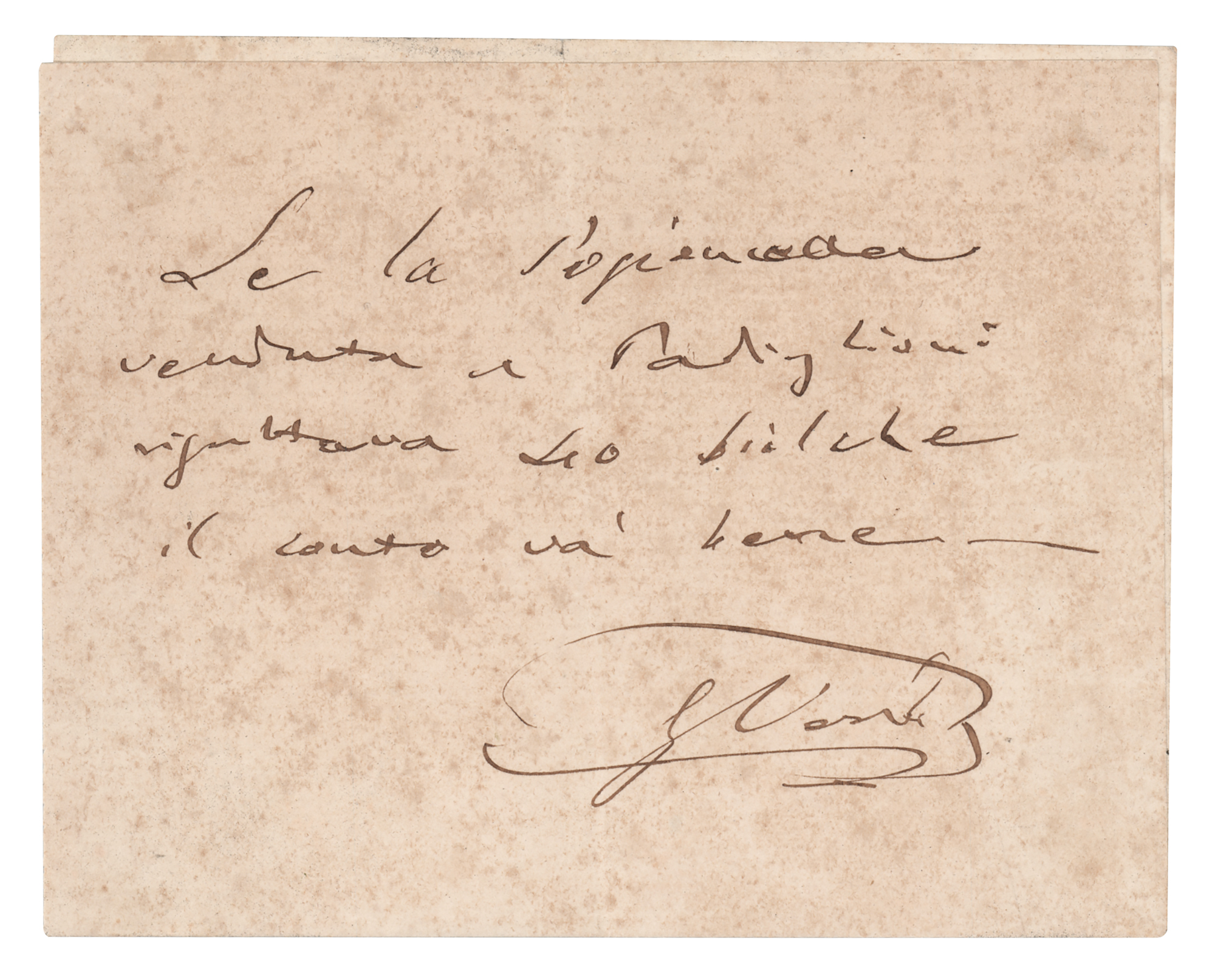 Italian composer (1813-1901) who was one of the most influential figures in the history of opera. ALS in Italian, signed “G. Verdi,” one page, 5.25 x 4.25, no date but circa 1879. Handwritten letter to his notary and friend, Dr. Angelo Carrara, asking about the size of a plot of land sold to Mr. Padiglioni. In fine condition, with light speckled foxing. Accompanied by the original transmittal envelope, addressed in Verdi's own hand.