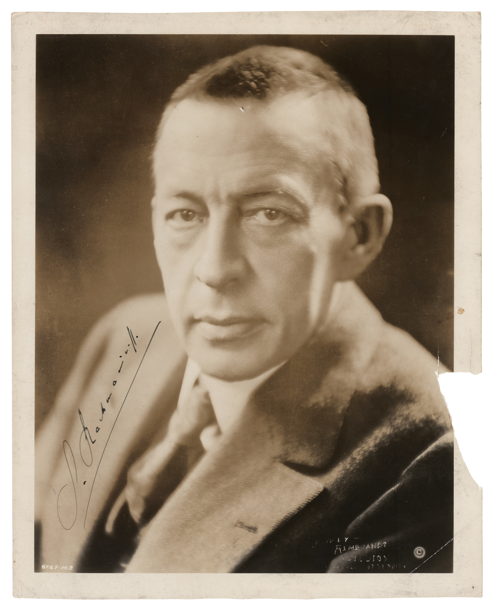Vintage glossy 8 x 10 photo of the celebrated Russian pianist in a head-and-shoulders pose, neatly signed in fountain pen, "S. Rachmaninoff." In very good to fine condition, with a crease to the lower right corner, and an area of loss to the right edge which could easily be matted out if desired.