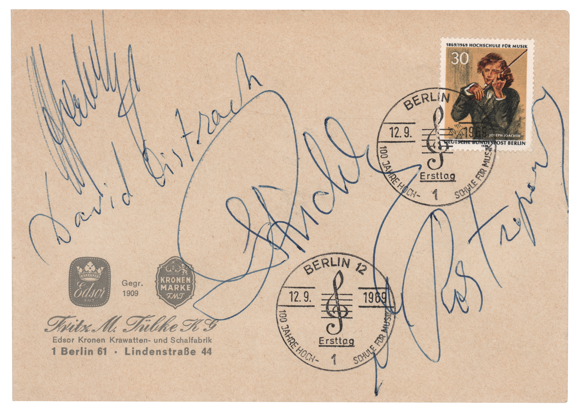 Commemorative cover featuring a postage stamp honoring the centenary of the "Hochschule für Musik," signed in blue ballpoint by David Oistrakh, Herbert von Karajan, Sviatoslav Richter, and Mstislav Rostropovich. In fine condition.