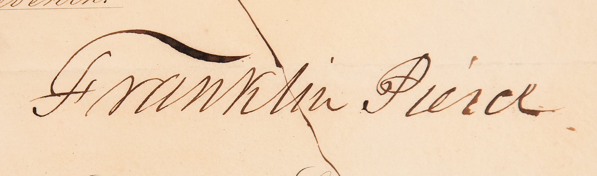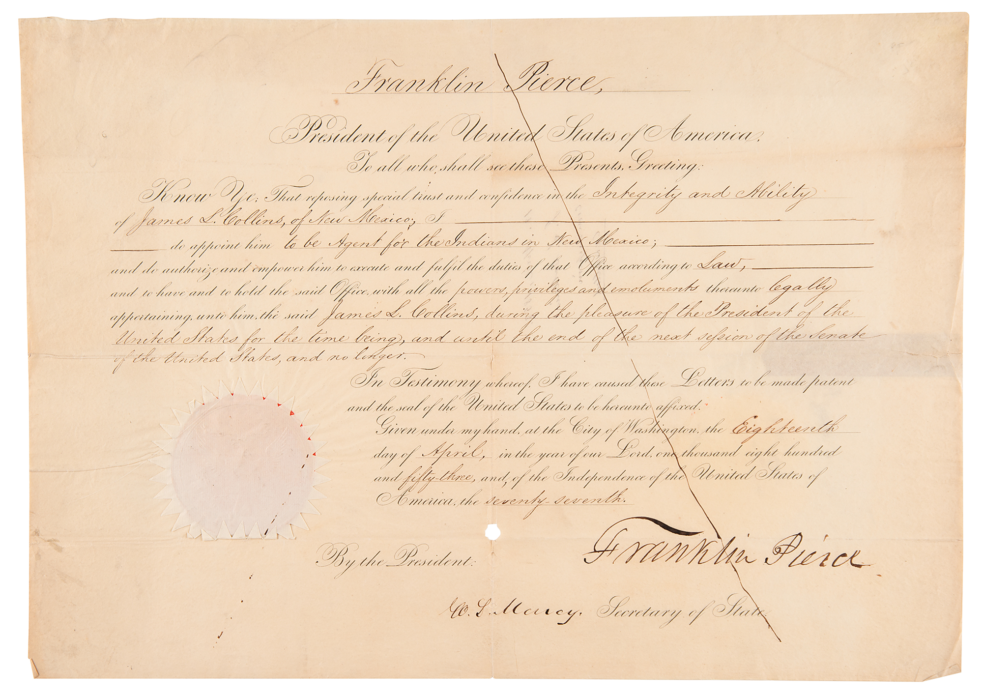 Partly-printed DS as president, one page, 16 x 11.25, April 18, 1853. President Pierce appoints James L. Collins to be an “Agent for the Indians in New Mexico.” Signed prominently at the conclusion by Franklin Pierce and countersigned by Secretary of State William L. Marcy. The embossed white seal remains affixed to the left side. In very good to fine condition, with a small hole to the left of the signature, and a tear to the right edge repaired with old tape on the back.