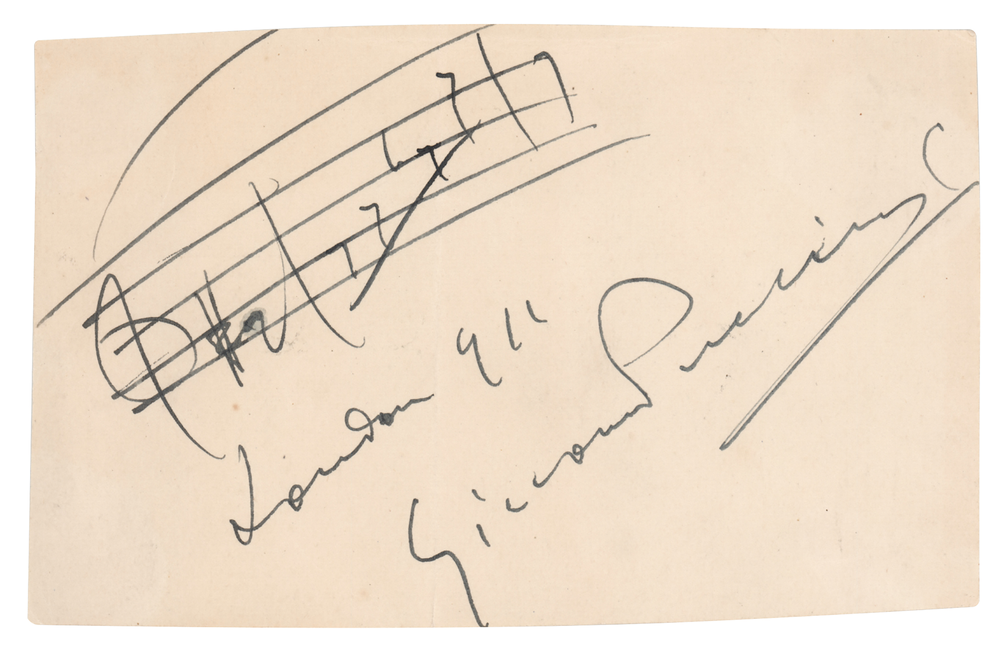 AMQS on an off-white 5.25 x 3.5 album page, neatly signed and dated below in ink, "London [1]911, Giacomo Puccini." Puccini pens two bars from his opera La Bohème. In fine condition, with trimmed edges and a vertical fold. Based on a story by French writer Henri Murger set in 1840s Paris, La Boheme was Puccini's first major success—making him rich and famous—and arguably his greatest work. After its 1896 debut in Turin, the piece was quickly adopted into the international repertory.