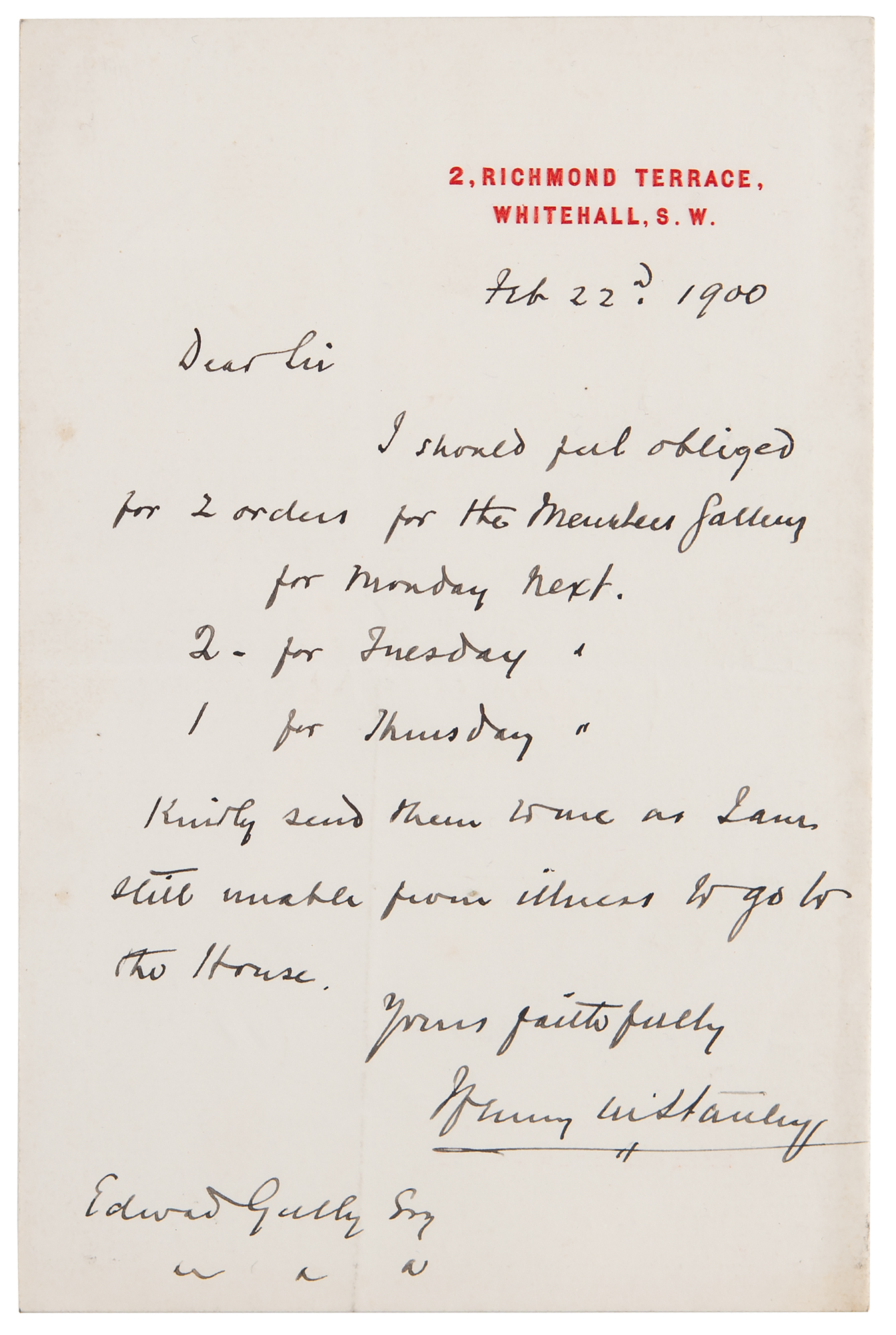 Author, explorer, and special correspondent for the New York Herald (1841–1904), most famous for his inquiry, ‘Dr. Livingstone, I presume?,’ upon finding David Livingstone, a fellow explorer who had become lost in the wilds of Africa. ALS, one page, 4.75 x 7.25, Richmond Terrace letterhead, February 22, 1900. Handwritten letter to Edward Gully, Secretary to the Speaker of the House of Commons, in part: "I should feel obliged for 2 orders for the Members Gallery for Monday next. 2—for Tuesday, 1 for Thursday, Kindly send them to me as I am still unable from illness to go to the house." In fine condition.
