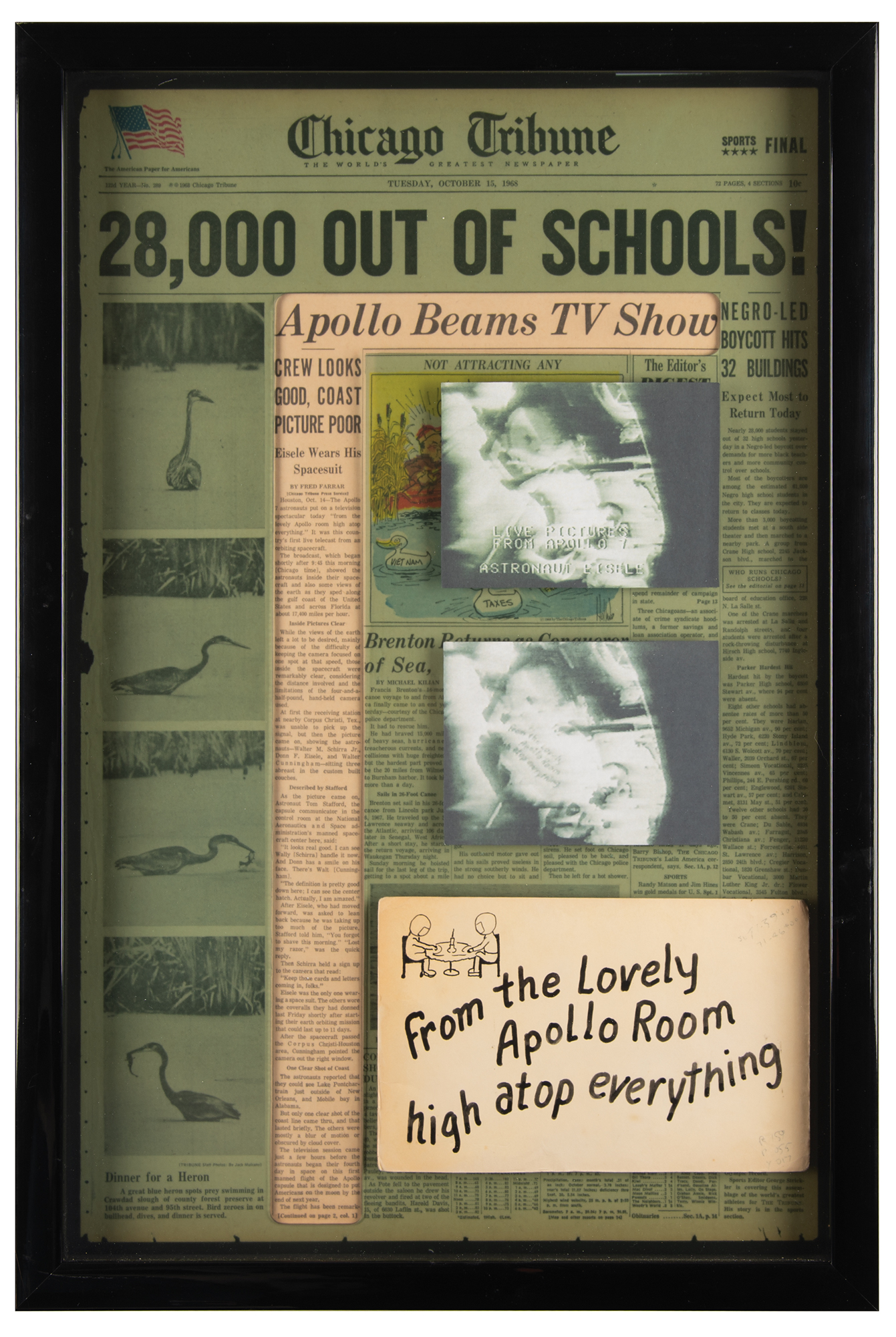 Iconic flown television cue card from the historic flight of the Apollo 7 mission, which transmitted the first live television broadcast aboard a crewed American spacecraft on October 14, 1968. The cue card, 8.5 x 5.5, famously reads in black felt tip, “From the Lovely Apollo Room high atop everything,” with the upper left corner featuring a small sketch of two Apollo astronauts enjoying a candlelight dinner in space. The card's upper and lower right corners also appear to feature in-flight ink notations related to the spacecraft’s positioning: “SL 71-39 +00, 71-46 +00” and “R 150, P 055, Y 017.” The card is displayed with two screenshots of the Apollo 7 broadcast, one of which shows CMP Donn Eisele holding the card up to the camera, and an original front page of the Chicago Tribune from October 15, 1968, with the lead article’s headline reading: “Apollo Beams TV Show: Crew Looks Good, Coast Picture Poor.” Archivally framed under Tru Vue conservation glass to an overall size of 16.75 x 25.5. In fine condition.