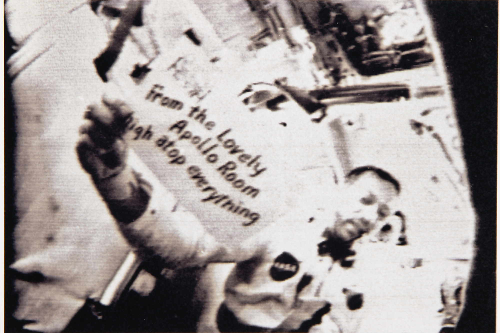 “From the Lovely Apollo Room high atop everything"—amazing flown cue card from Apollo 7's historic television broadcast from space