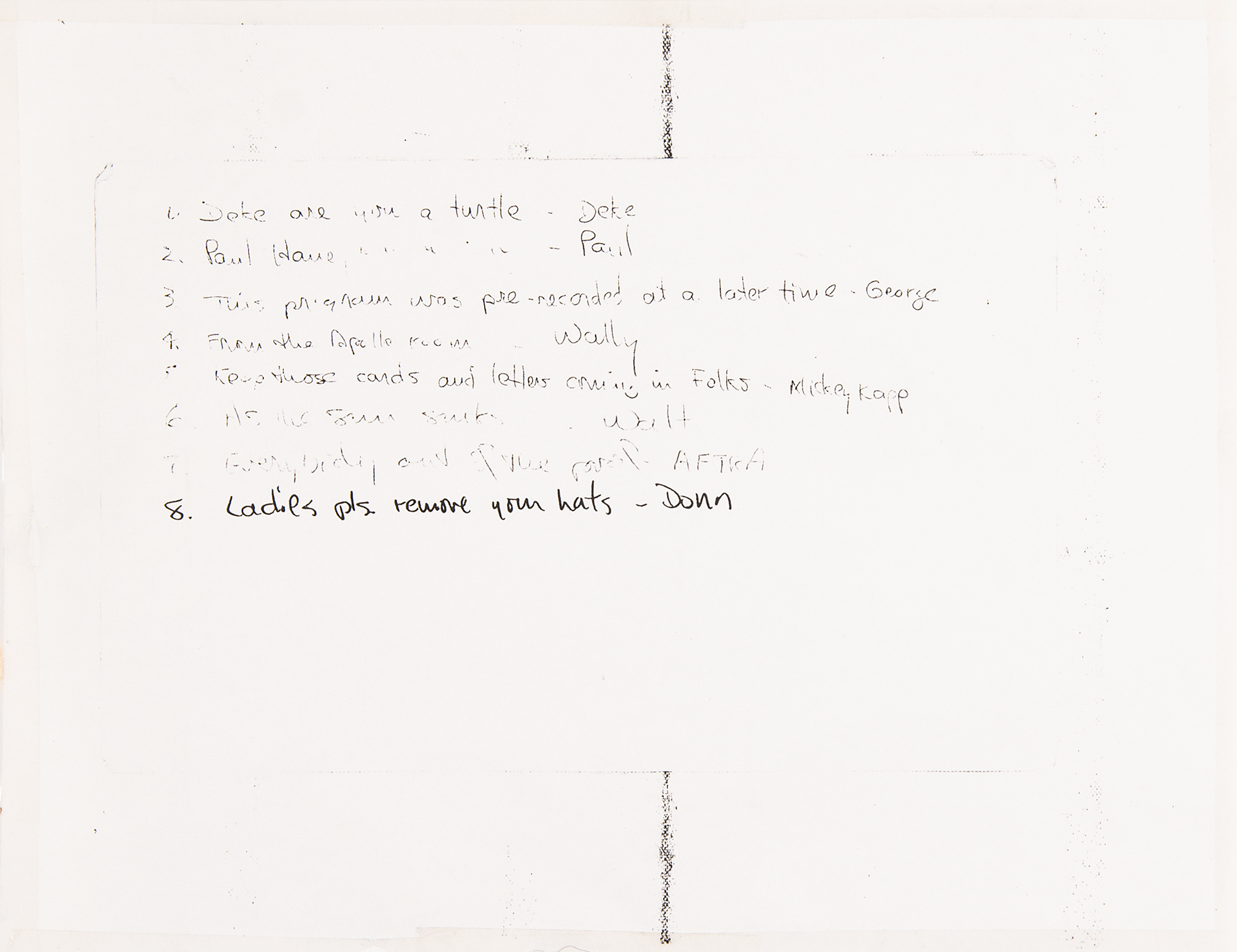 Accompanied by additional newspaper clippings for the TV broadcast, three modern glossy prints of Eisele holding the offered cue card, and a printed copy of the cue card’s reverse side, which is annotated with a script of eight cue card prompts, with this lot’s card listed fourth: “From the Apollo room – Wally.” Accordingly, the script’s fifth prompt was the next card held up to the camera: “Keep those cards and letters coming in Folks – Mickey Kapp.”