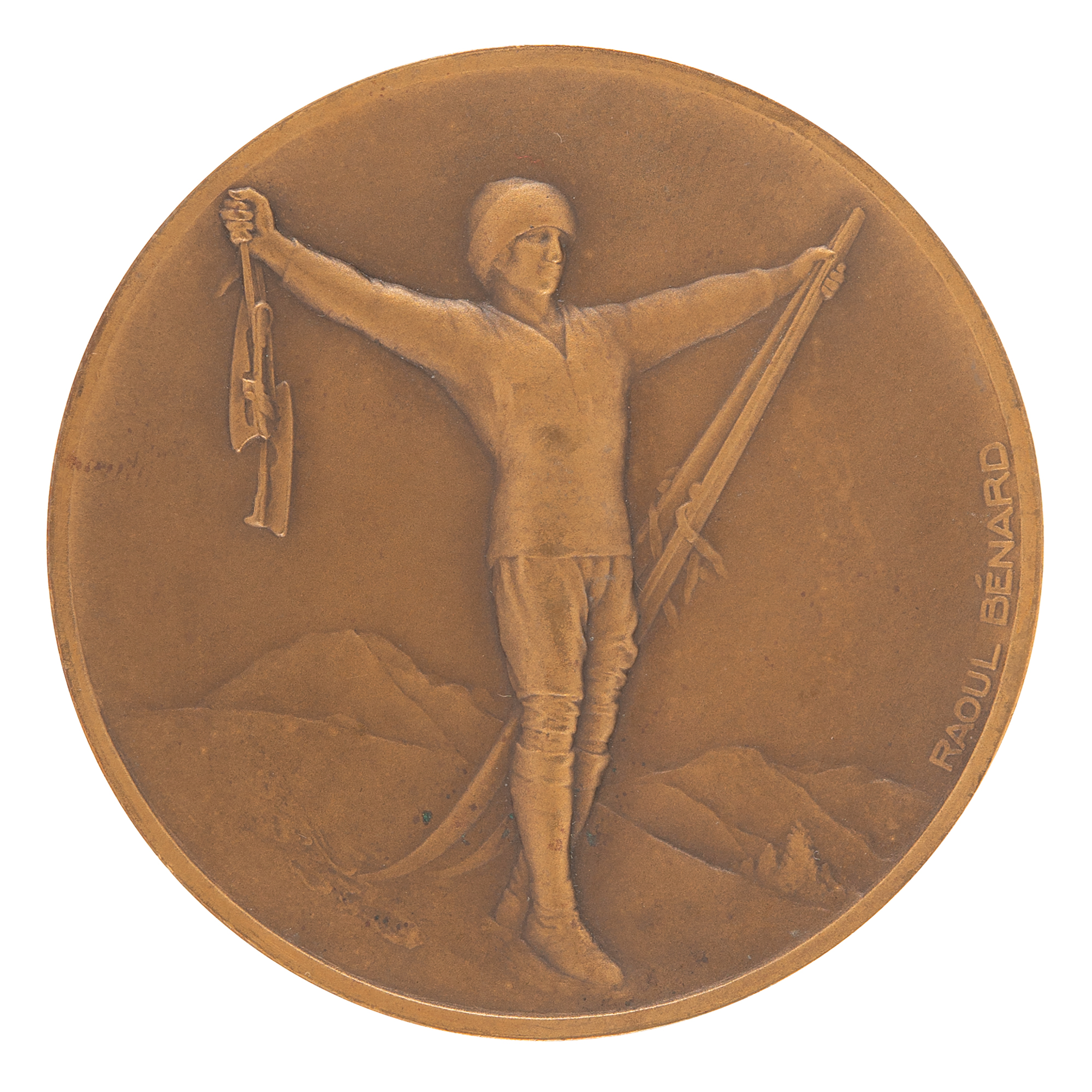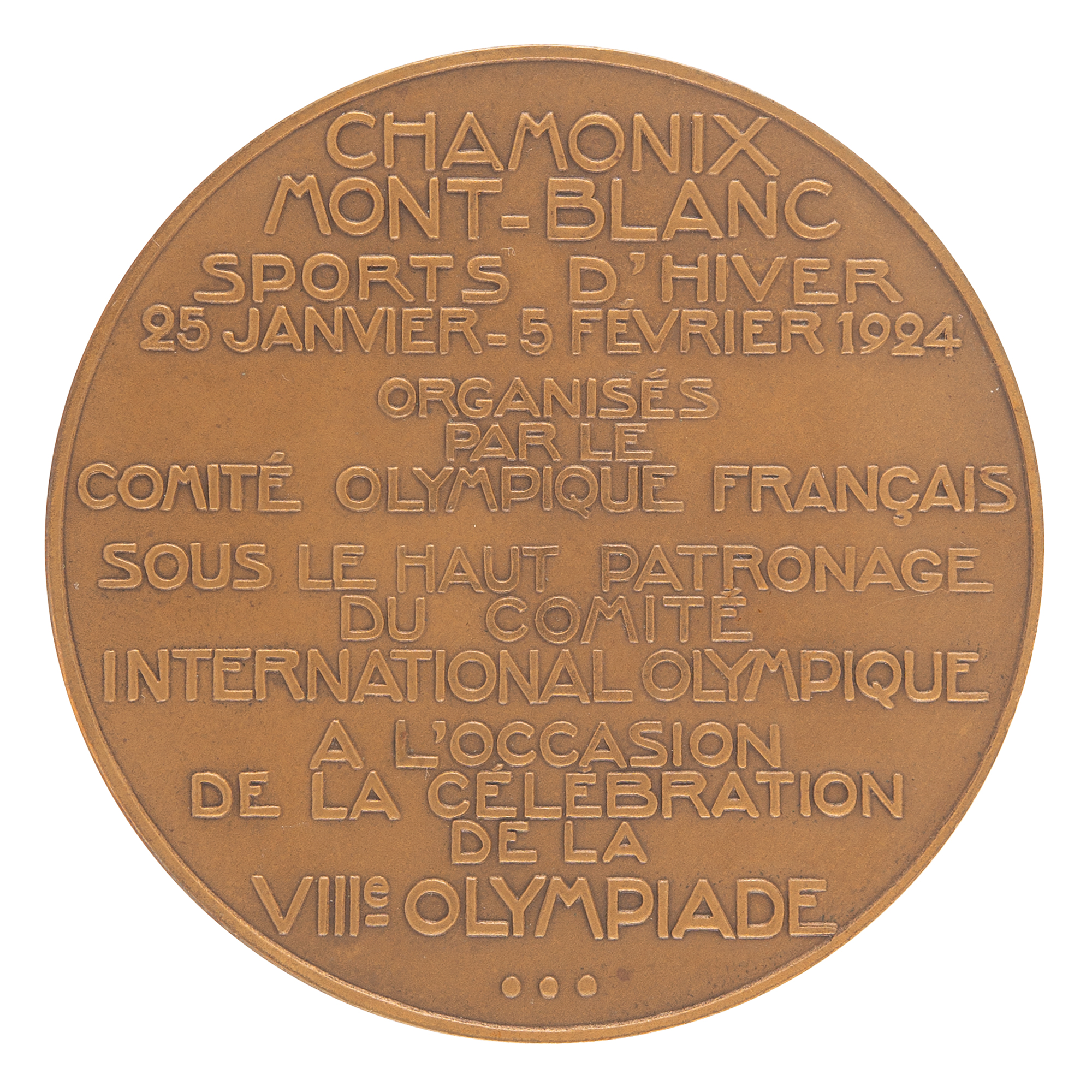 Exceedingly rare medal from the Chamonix 1924 Winter Olympics, which was issued as the bronze medal to third-place winners and also used as the participation medal of the Games. Bronze, 56 mm, 68 gm, by Raoul Benard, Paris. The front features a victorious athlete holding ice skates and skis high in the air with the Alps in the background; the reverse is inscribed at length in French, "Chamonix Mont-Blanc Sports D'Hiver, 25 Janvier–5 Fevrier 1924, Organises par le Comite Olympique Francais sous le haut patronage du Comite International Olympique a l'occasion de la celebration de la VIII Olympiade [Chamonix Mont-Blanc Winter Sports, 25 January-5 February 1924, Organized by the French Olympic Committee under the patronage of the International Olympic Committee on the occasion of the celebration of the VIII Olympiad]." The edge is stamped "Bronze." One of the finest Chamonix bronze medals to come to auction.