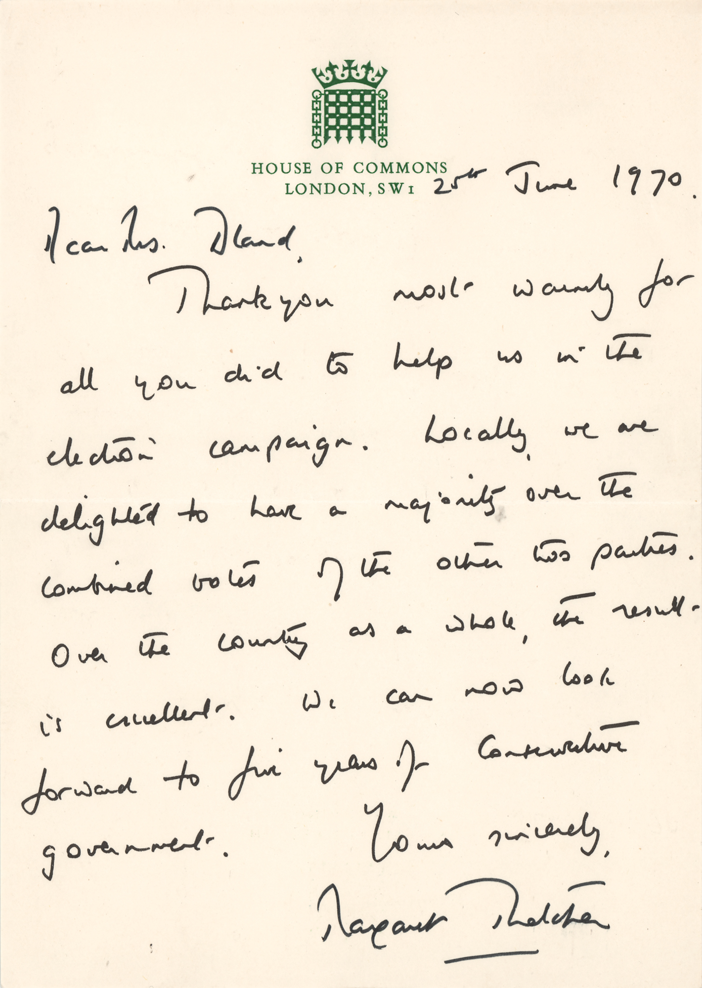 Form letter signed “Margaret Thatcher,” one page, 6 x 8.25, House of Commons letterhead, June 25, 1970. Printed facsimile form letter with the salutation ("Dear Mr. Bland") and signature handwritten by Thatcher, in part: "Thank you most warmly for all you did to help us in the election campaign. Locally we are delighted to have a majority over the combined votes of the other two parties. Over the country as a whole, the result is excellent. We can not look forward to five years of Conservative government." In fine condition.