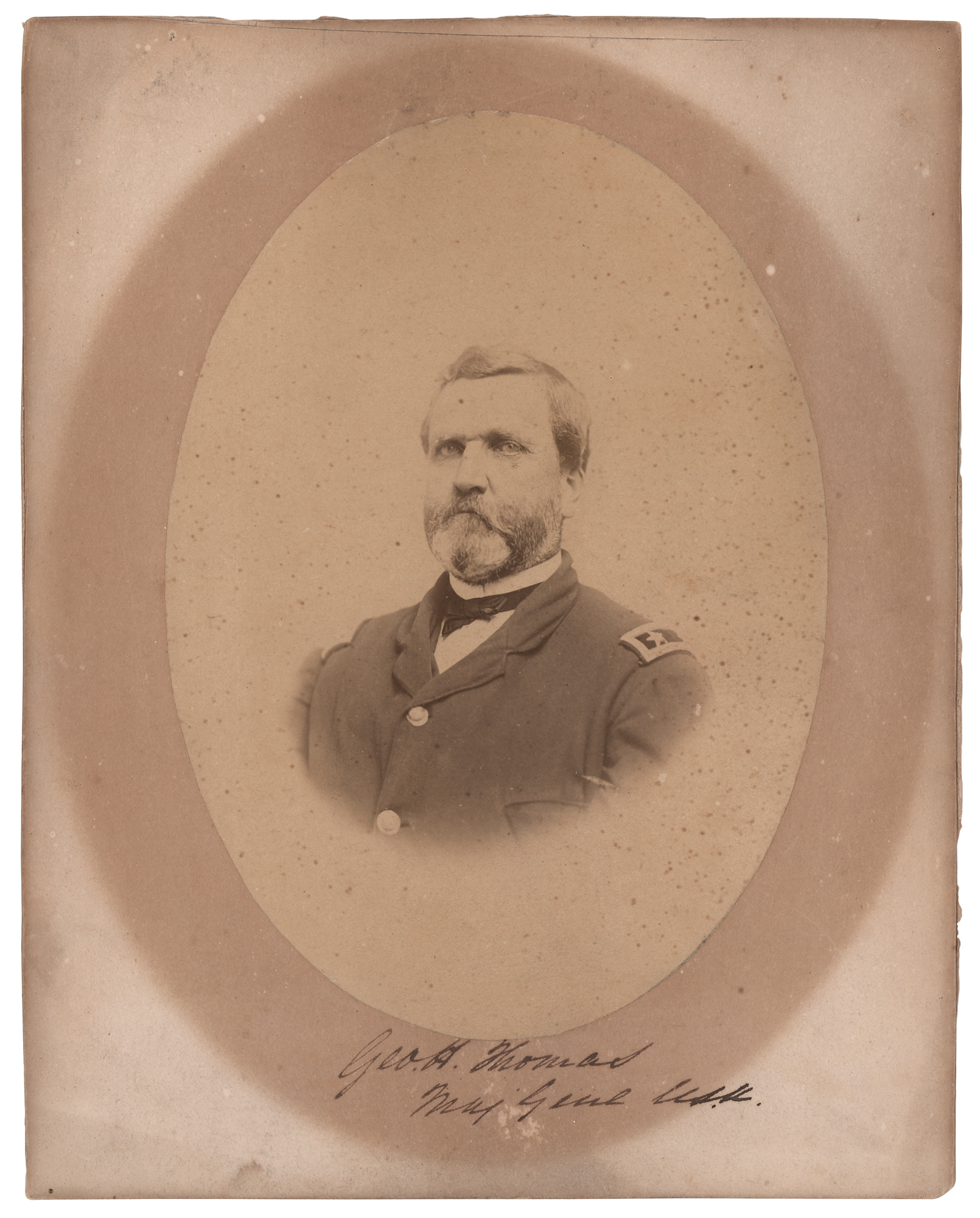 Union general (1816-1870) whose most decisive victory earned him the sobriquet 'Rock of Chickamauga.' Uncommon 5.5 x 7.75 albumen portrait of Thomas in uniform, affixed to its original 8 x 10 mount, signed on the mount in ink, "Geo. H. Thomas, Maj. Genl. U.S.A." In very good to fine condition, with scattered speckling to the image, and somewhat irregular toning to the mount.