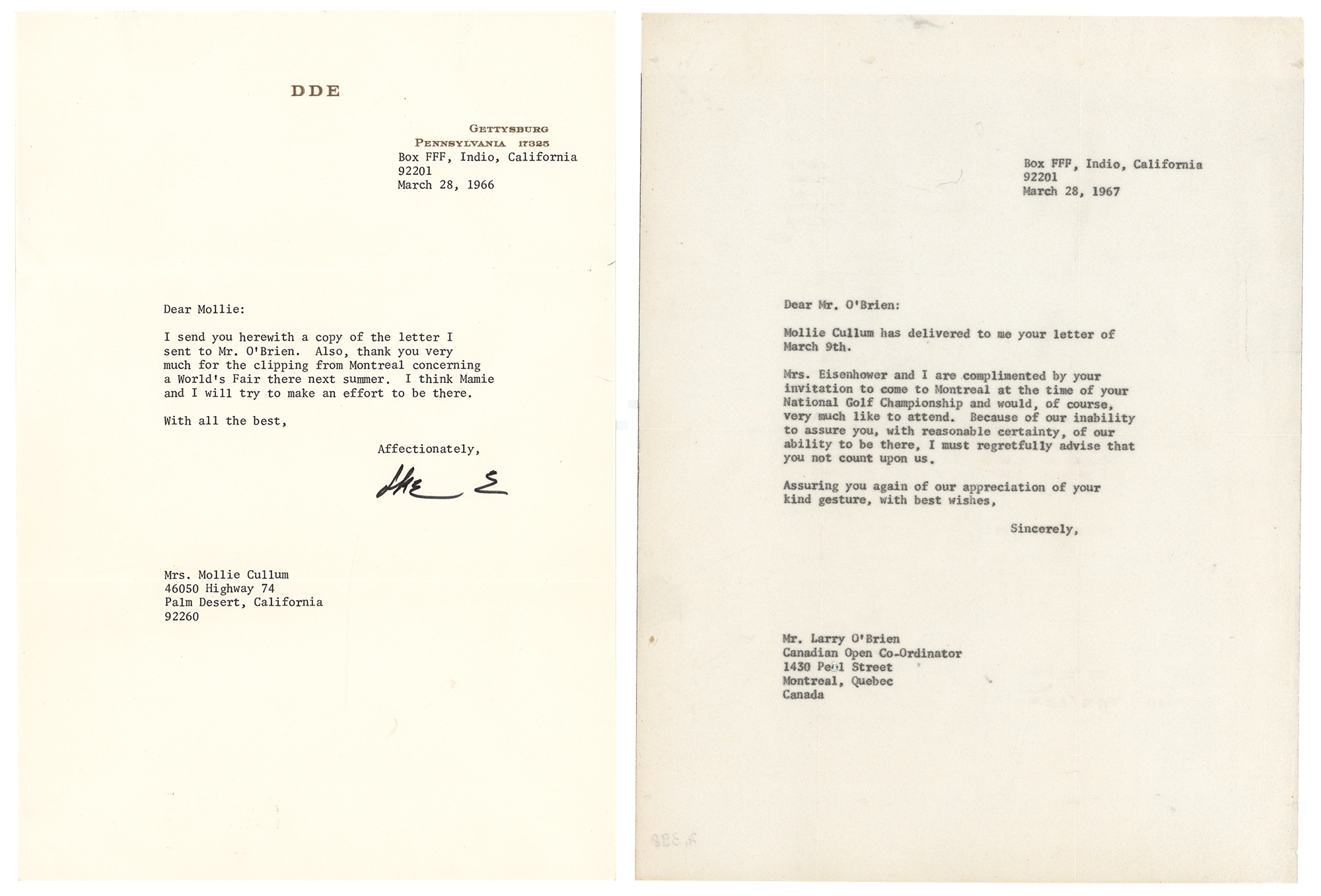 TLS signed “Ike E.,” one page, 7.25 x 10.5, personal letterhead, March 28, 1966. Letter to Mollie Cullum, in part: "I send you herewith a copy of the letter I sent to Mr. O'Brien. Also, thank you very much for the clipping from Montreal concerning a World's Fair there next summer. I think Mamie and I will try to make an effort to be there." In fine condition. Accompanied by a carbon copy of a letter from Eisenhower to Canadian Open coordinator Larry O'Brien, declining an invitation to Montreal to attend the National Golf Championship.