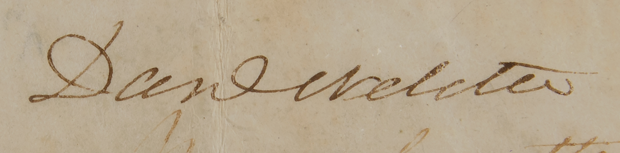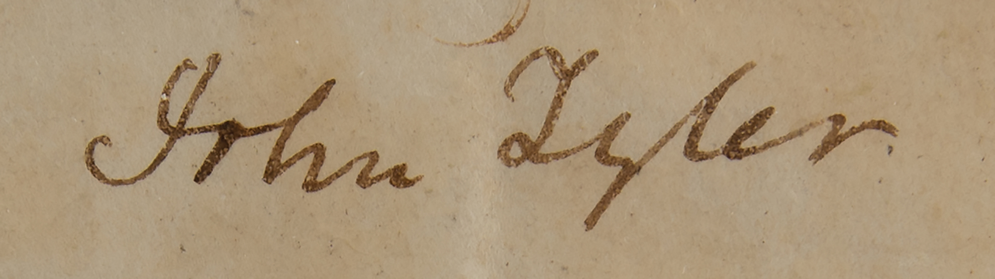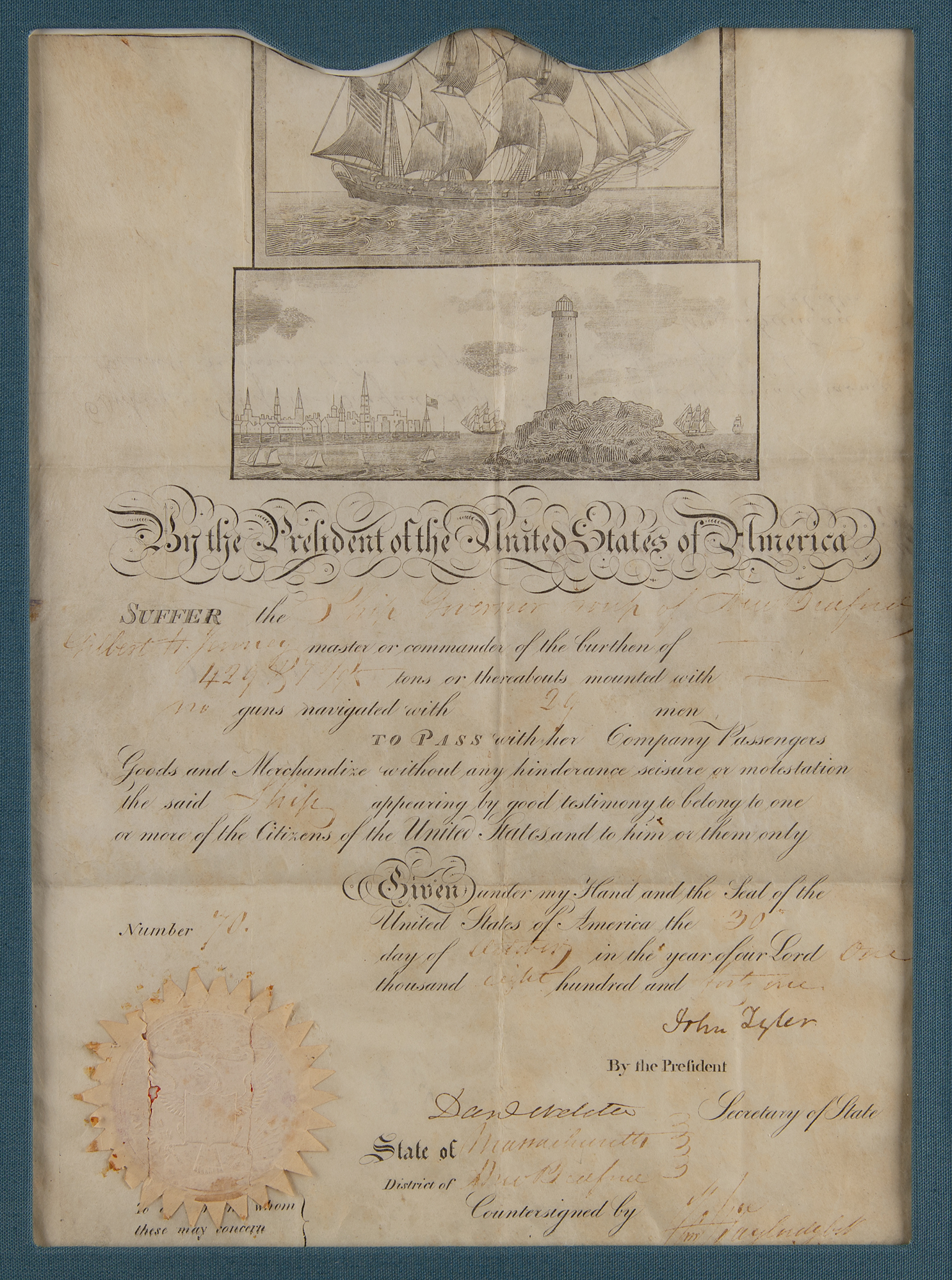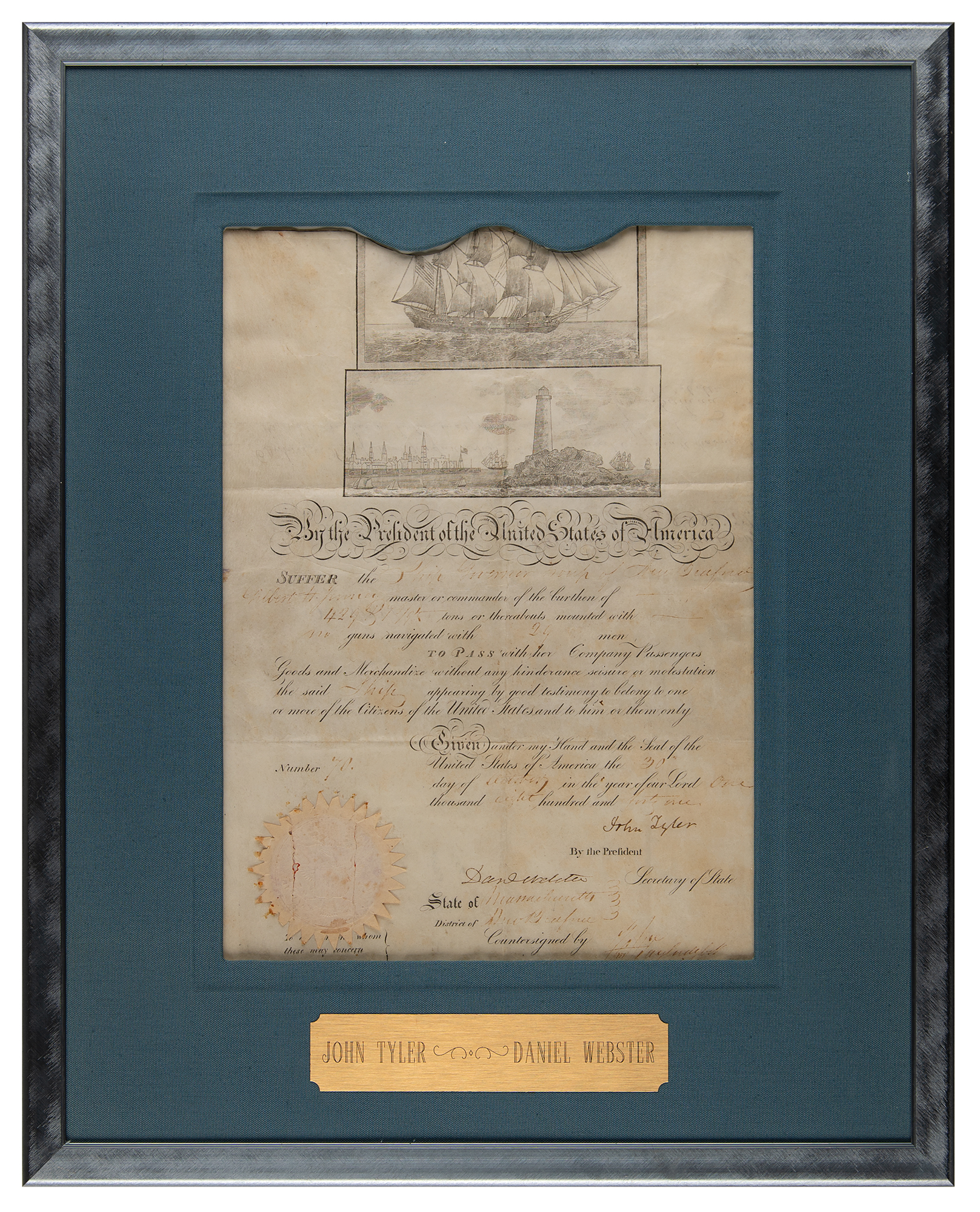 Partly-printed vellum DS, one page, 10.25 x 14.25, October 30, 1841. Scallop-topped ship’s pass issued for the "Ship Governor Troup of New Bedford, Gilbert H. Jenney master or commander…navigated with 29 men, To Pass with her Company, Passengers, Goods and Merchandize without any hinderance, seisure or molestation, the said Ship appearing by good testimony to belong to one or more of the Citizens of the United States." Boldly signed at the conclusion by President John Tyler and countersigned by Secretary of State Daniel Webster. The embossed white paper seal affixed to the lower left is cracked but intact. Cloth-matted and framed with an engraved plaque to an overall size of 18.25 x 23. In very good to fine condition, with scattered light staining, and fading to the handwritten portions of text; both signatures remain bold.