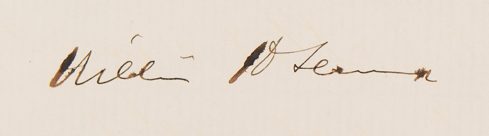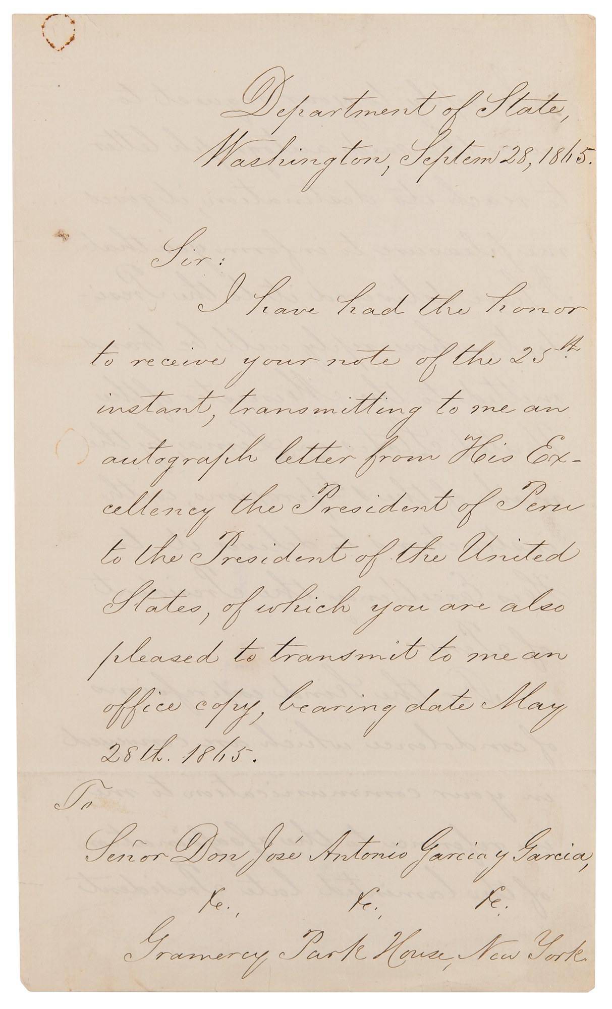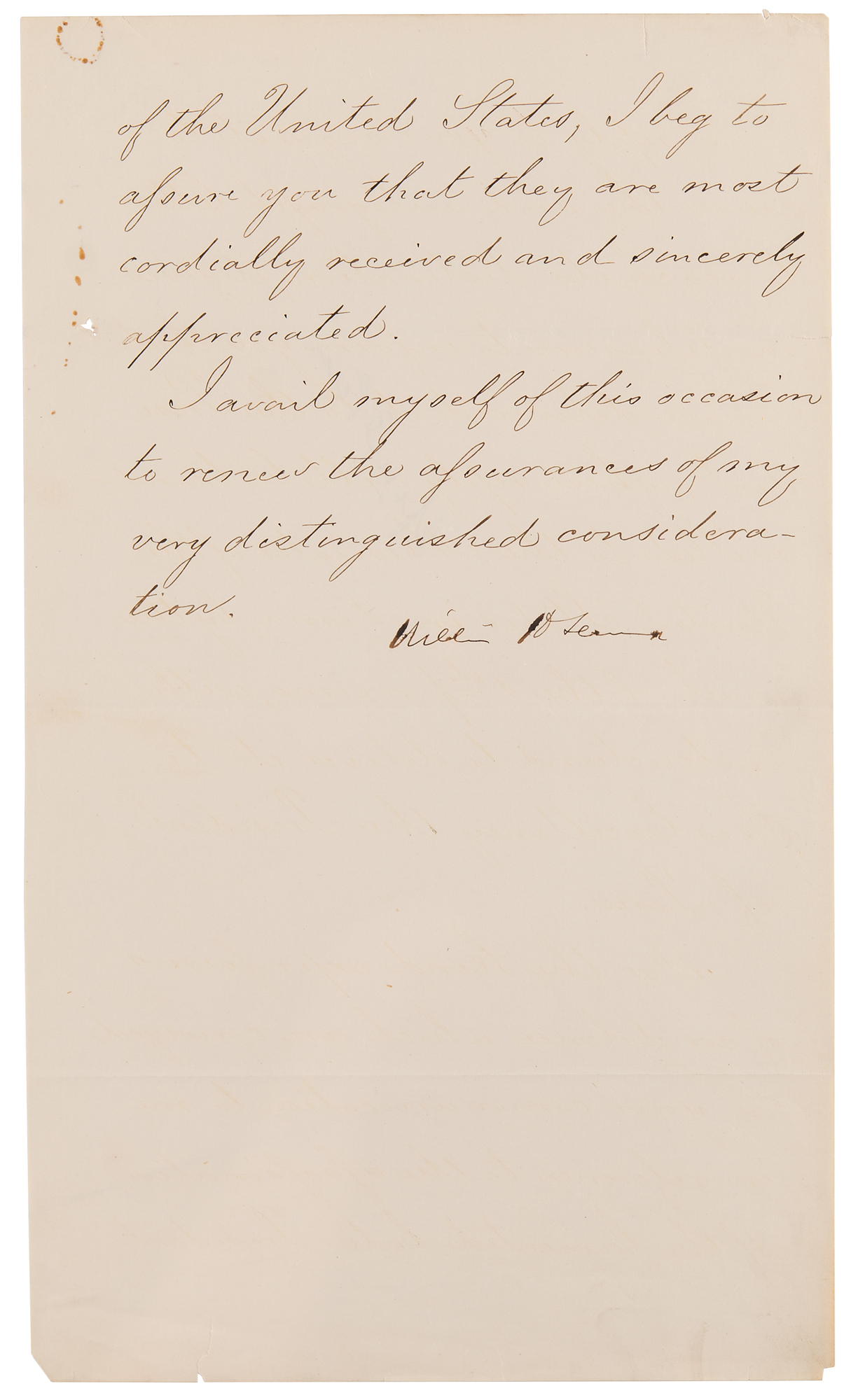 American statesman (1801–1872) who served as secretary of state in the Lincoln administration and who was severely injured in an attack that was part of the assassination conspiracy. His greatest political achievement was the purchase of Alaska from Russia, derided by contemporary skeptics as 'Seward's Folly.' LS signed “William H. Seward,” three pages on two sheets, 7.25 x 12.75, September 28, 1865. Official letter of state to Peru's ambassador to the United States, in part: "I have had the honor to receive…an autograph letter from His Excellency the President of Peru to the President of the United States…For the kind expressions of condolence which are conveyed in your communication to me in reference to the assassination of the lamented late President of the United States, I beg to assure you that they are most cordially received and sincerely appreciated." In fine condition, with scattered small rust stains. Accompanied by a carte-de-visite portrait of Seward by Brady's National Photographic Portrait Galleries.