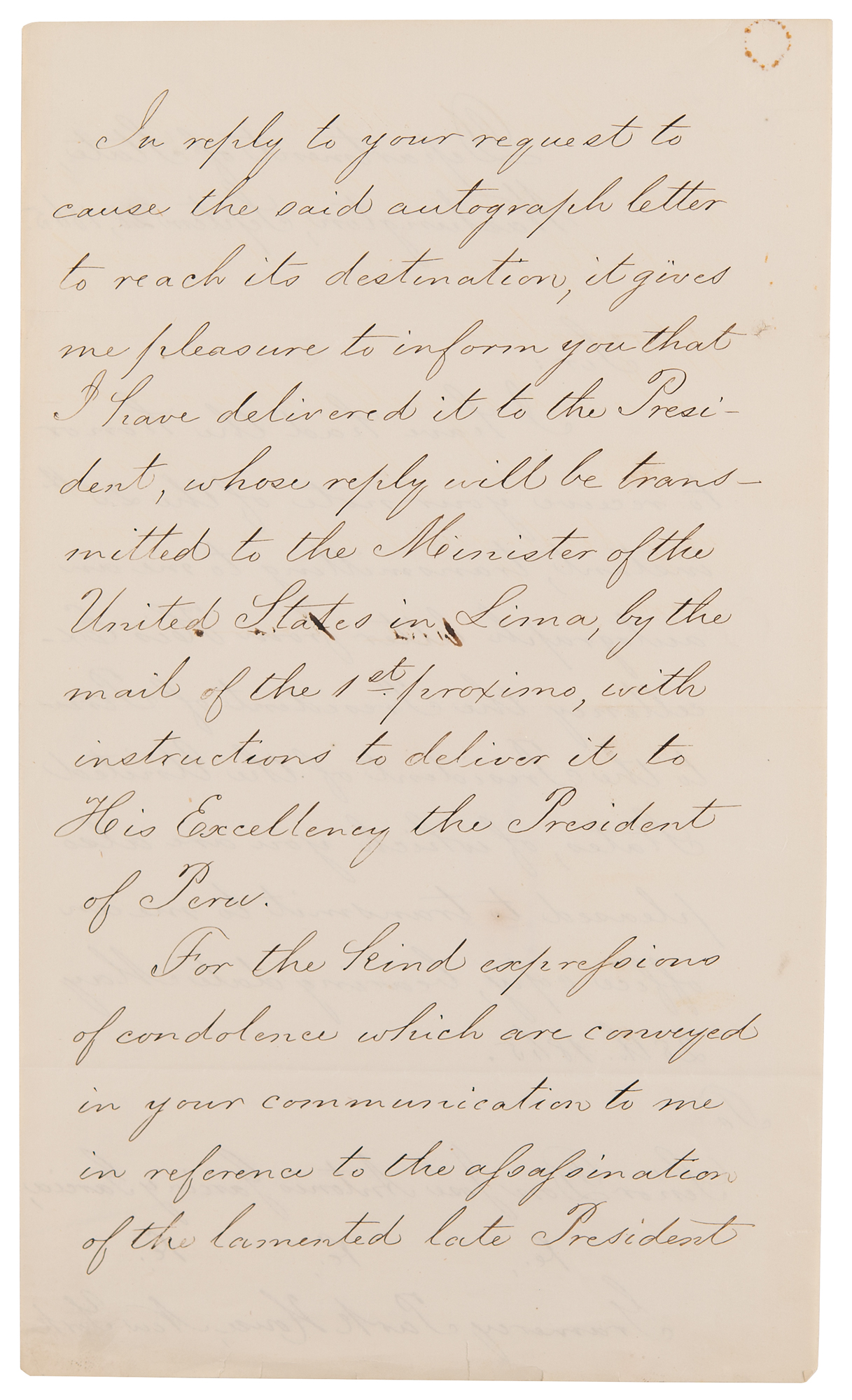 Seward thanks the Peruvian ambassador for condolences "in reference to the assassination of the lamented late President of the United States"