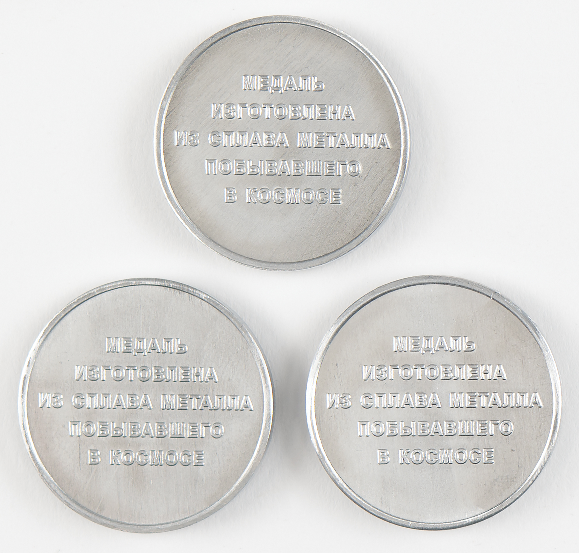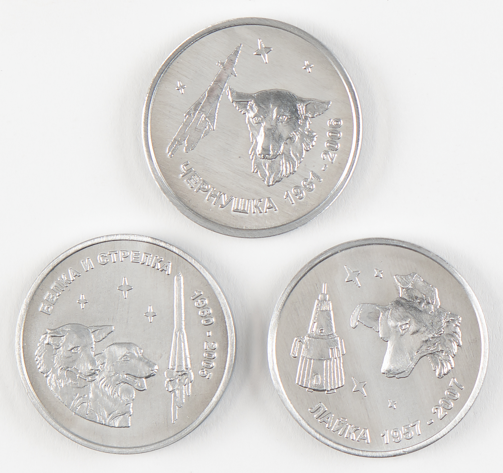Three aluminum commemorative coins, all approximately 1.25″ in diameter, issued between 2005 and 2007, each honoring a different unmanned Sputnik mission and its canine passenger. The coins honor Sputnik 2 (Laika), Sputnik 5 (Belka and Strelka), and Sputnik 9 (Chernushka). All three were issued by the Samara Industrial Complex, makers of the Soyuz spacecraft, and are made from metal that was flown in space. In overall fine condition.