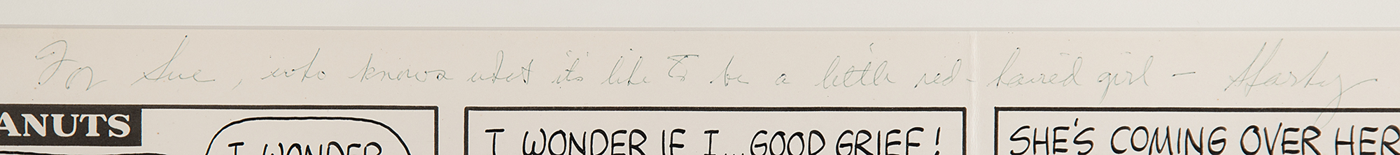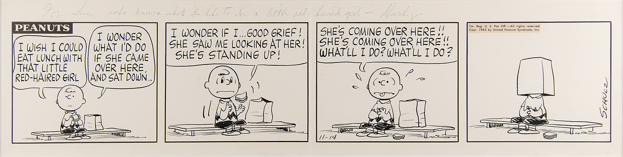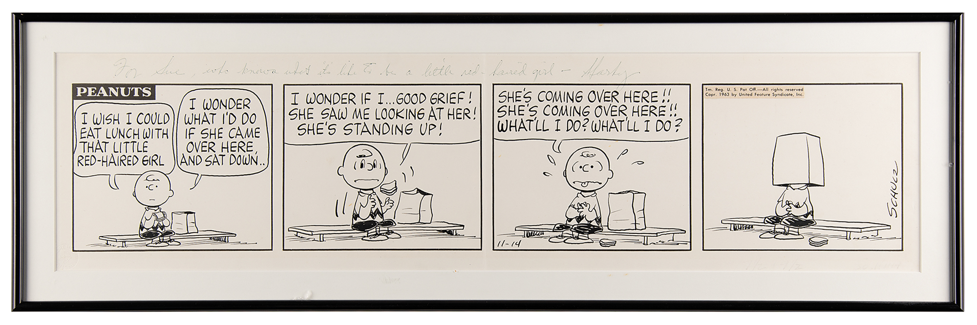 Original hand-inked four panel Peanuts daily comic strip by Charles Schulz, 28 x 7, signed and inscribed across the top in blue ballpoint, "For Sue, who knows what it's like to be a little red-haired girl—Sparky," and also signed vertically in the last panel with his artist signature, "Schulz." Dating to November 14, 1963, the comic strip shows Charlie Brown sitting on a park bench with his lunch, contemplating a romantic encounter: "I wish I could eat lunch with that little red-haired girl. I wonder what I'd do if she came over here and sat down… I wonder if I… good grief! She saw me looking at her! She's standing up! She's coming over here!! She's coming over here!! What'll I do? What'll I do?" The final panel shows Charlie Brown with his paper lunch bag over his head. Matted and framed to an overall size of 31 x 10. In fine condition, with Schulz's signature and inscription a shade light.