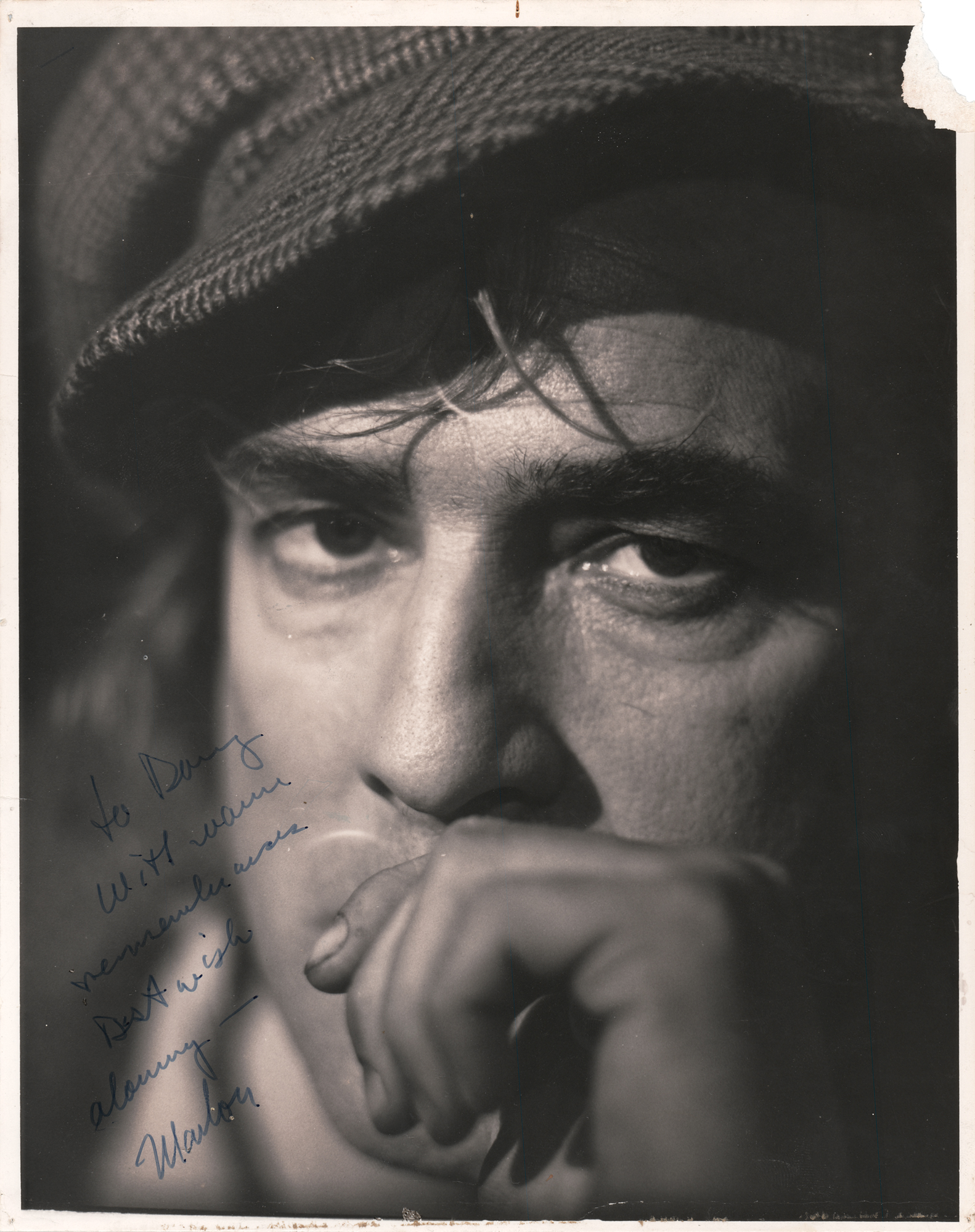 Vintage glossy 8 x 10 close-up photo of Marlon Brando wearing a flat cap as Peter Quint from the 1971 horror film The Nightcomers, signed and inscribed in black felt tip, “To Doug, with warm remembrances, Best wishes, always — Marlon.” In very good to fine condition, with fingerprint impressions to the lower right corner area, and loss to the upper right corner that could be matted out. The Nightcomers is a prequel to Henry James' 1898 novella The Turn of the Screw, which had already been adapted into the classic 1961 film The Innocents.