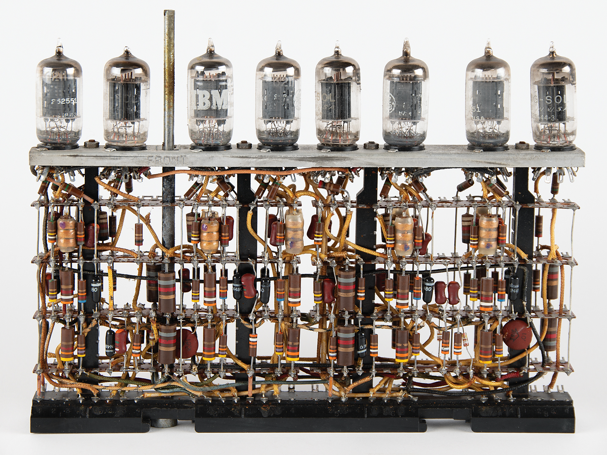 Circa late 1950s vacuum tube assembly from an IBM 704 mainframe computer, introduced in 1954 as the first mass-produced computer with hardware for floating-point arithmetic; at the time, it was one of the only computers capable of handling complex scientific calculations, and one of the earliest to use core memory. The vacuum tube module measures approximately 9.75˝ x 7.25˝ x 1˝, and features eight vacuum tubes installed on top, including tubes with IBM, GE, and Tung-Sol branding. In very good to fine condition.