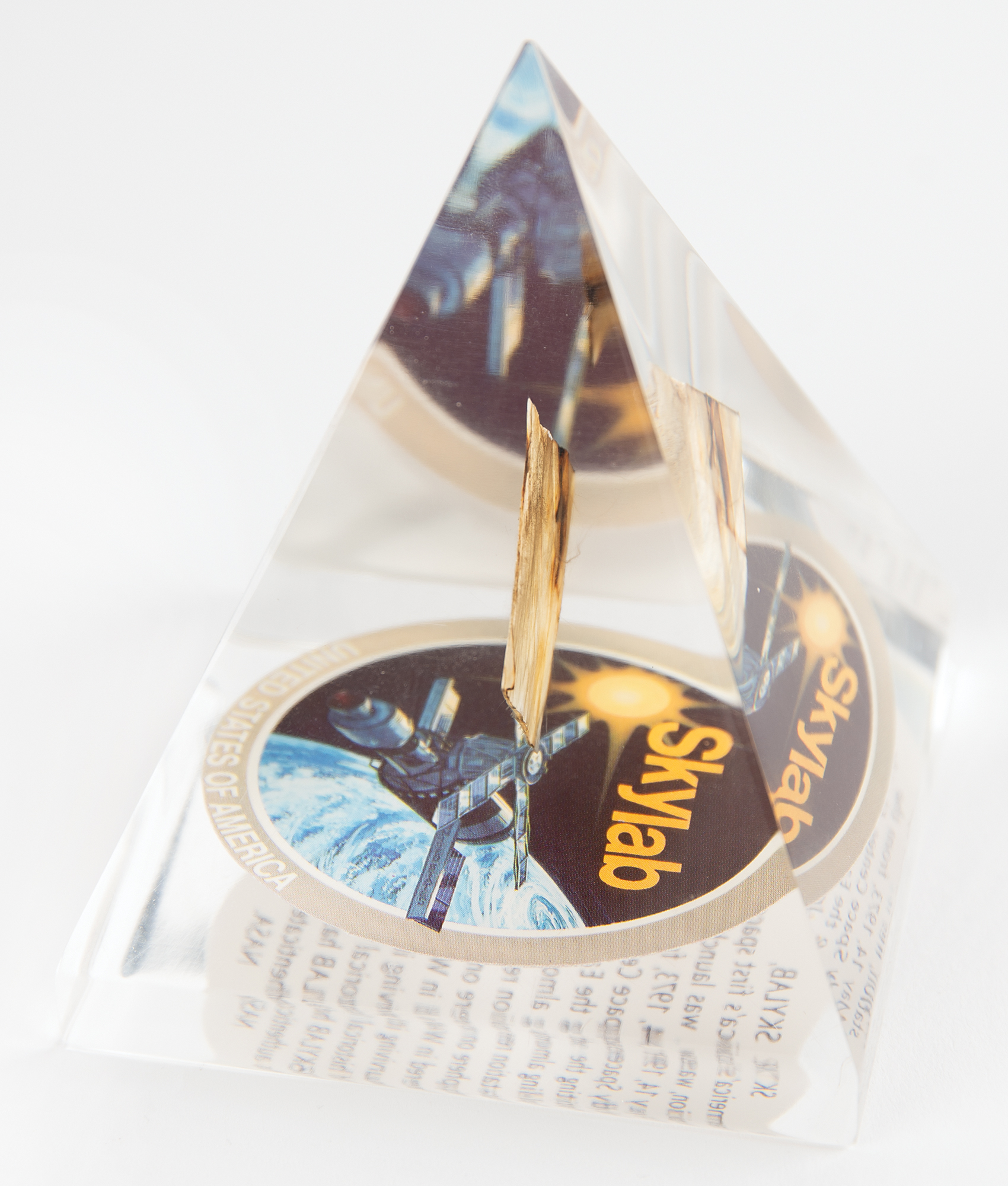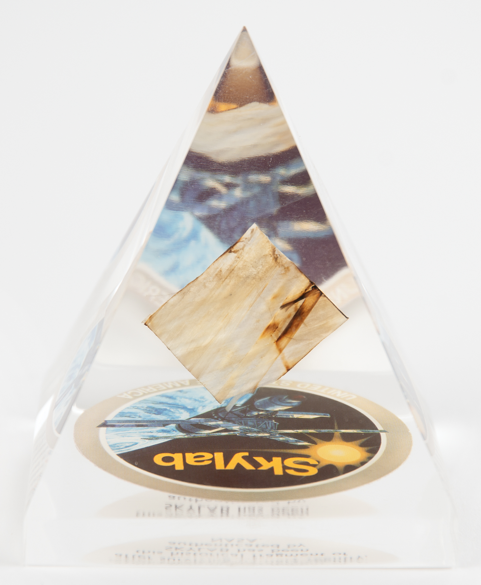 Flown fragment of a Skylab oxygen supply tank recovered in Western Australia after the space station's fiery reentry in 1979, approximately 1˝ x 1˝, encased in a pyramidal 3.25˝ x 4.5˝ x 3.25˝ block of Lucite with a Skylab emblem at the bottom. In fine condition.
