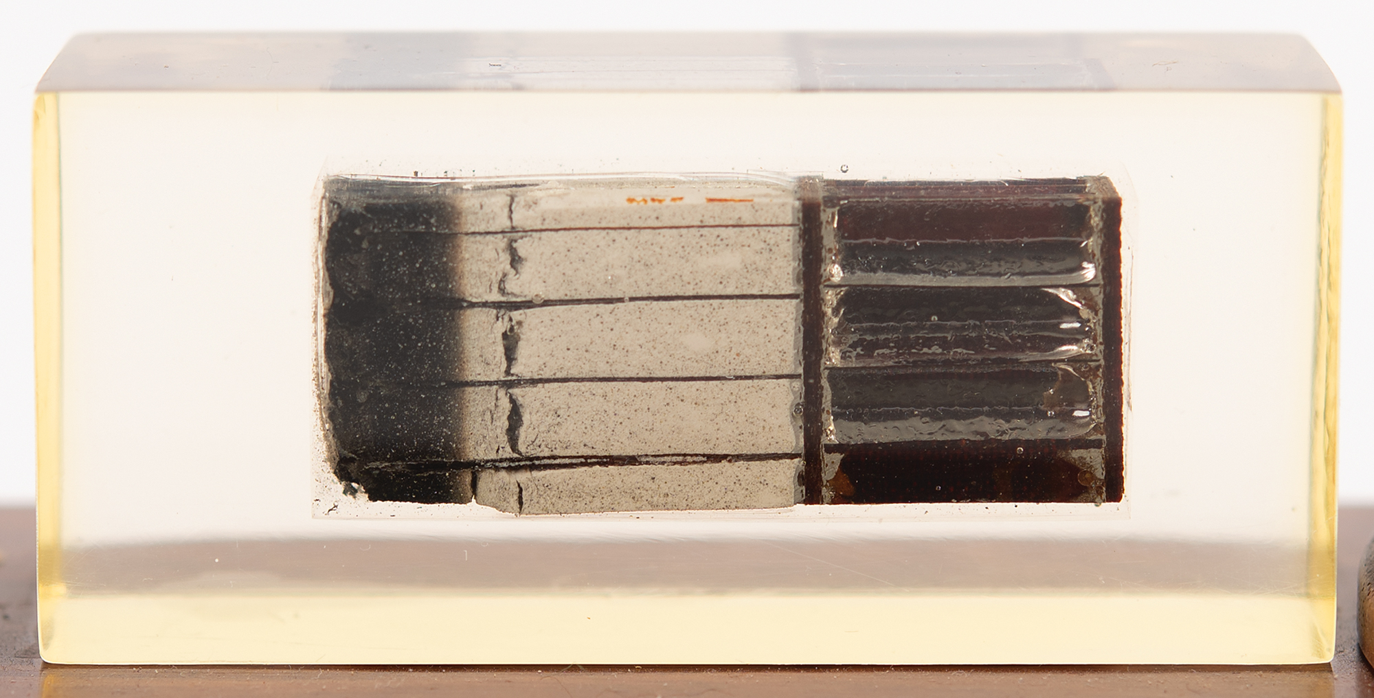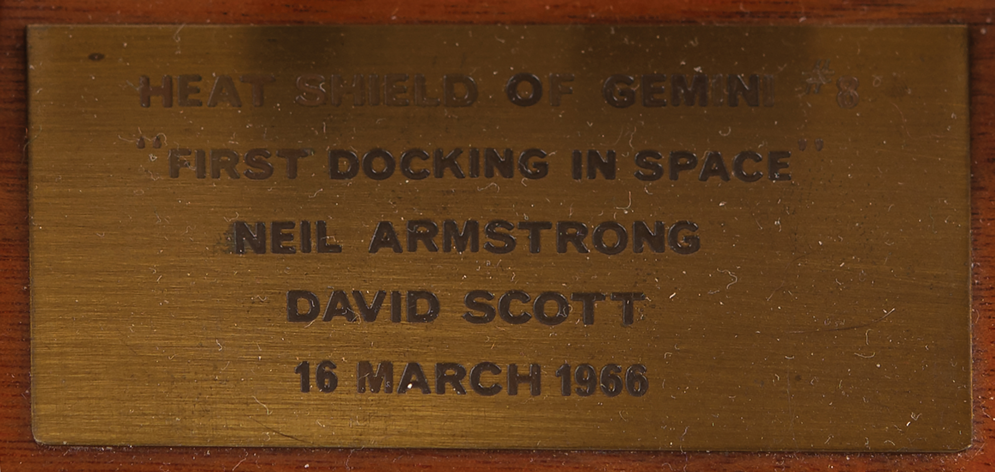 A substantial segment of flown heat shield from the Gemini 8 spacecraft, measuring approximately 2˝ x .5˝ x .75˝ and encased in a 3˝ x 1.5˝ x 1˝ Lucite block, displayed on a wooden base with an engraved plaque reading: "Heat Shield of Gemini #8, 'First Docking in Space,' Neil Armstrong, Dave Scott, 16 March 1966." The base features circular stands for 9˝ tall models of the Gemini-Titan and Atlas-Agena launch vehicles, both included. In fine condition, though the adhesive for the Titan model has let go, it could easily be reattached. An appealing presentation piece from a historic and harrowing flight: it achieved the first docking of two spacecraft in orbit, but also faced a critical in-flight emergency due to a stuck thruster, forcing the crew to perform an emergency reentry.