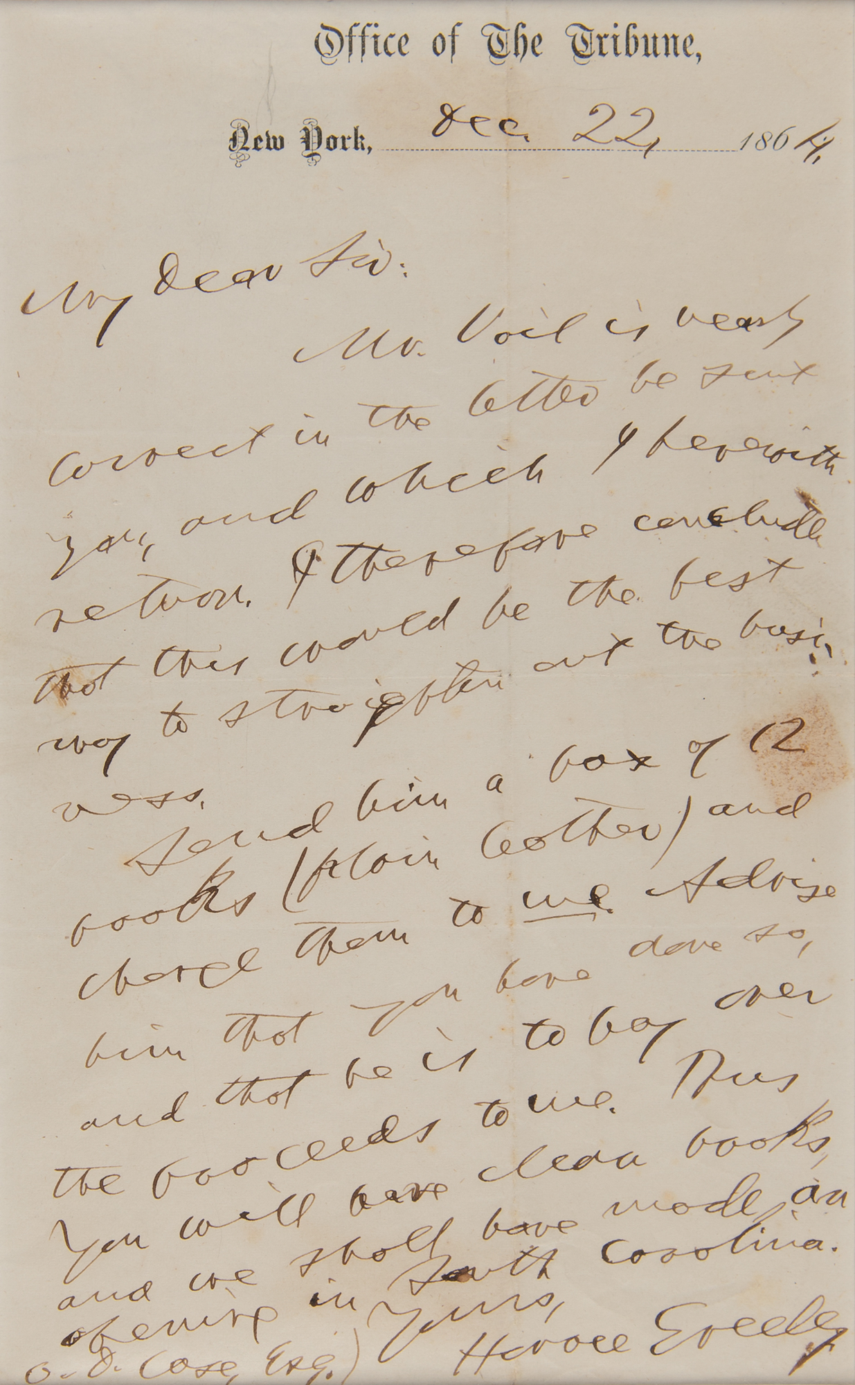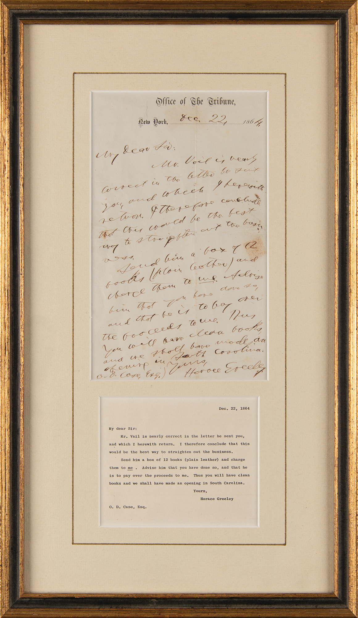Founder and editor of the New York Tribune (1811-1872) who used the power of his newspaper to advocate for a variety of liberal causes, most importantly the call for emancipation of slaves during the Civil War. Civil War-dated ALS, one page, 4.75 x 7.75, Office of The Tribune letterhead, December 22, 1864. Handwritten letter to O. D. Case, in full: “Mr. Vail is nearly correct in the letter he sent you, and which I herewith return. I therefore conclude that this would be the best way to straighten out the business. Send him a box of 12 books (plain leather) and charge them to me. Advise him that you have done so, and that he is to pay over the proceeds to me. Thus you will have clean books and we shall have made an opening in South Carolina.” Matted and framed with a typed transcription to an overall size of 10 x 17. In fine condition, with some old light stains.