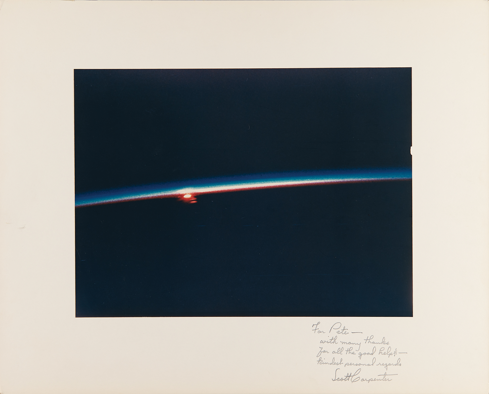 Scarce official color semi-glossy 13.75 x 10.25 NASA photo of an orbital sunset captured by Aurora 7 pilot Scott Carpenter during the Mercury-Atlas 7 mission, affixed to its original 20 x 16 cardstock mount, which is signed and inscribed in black ink, “For Pete — with many thanks for all the good help & kindest personal regards, Scott Carpenter.” In fine condition, with a small chip to right edge of photo.