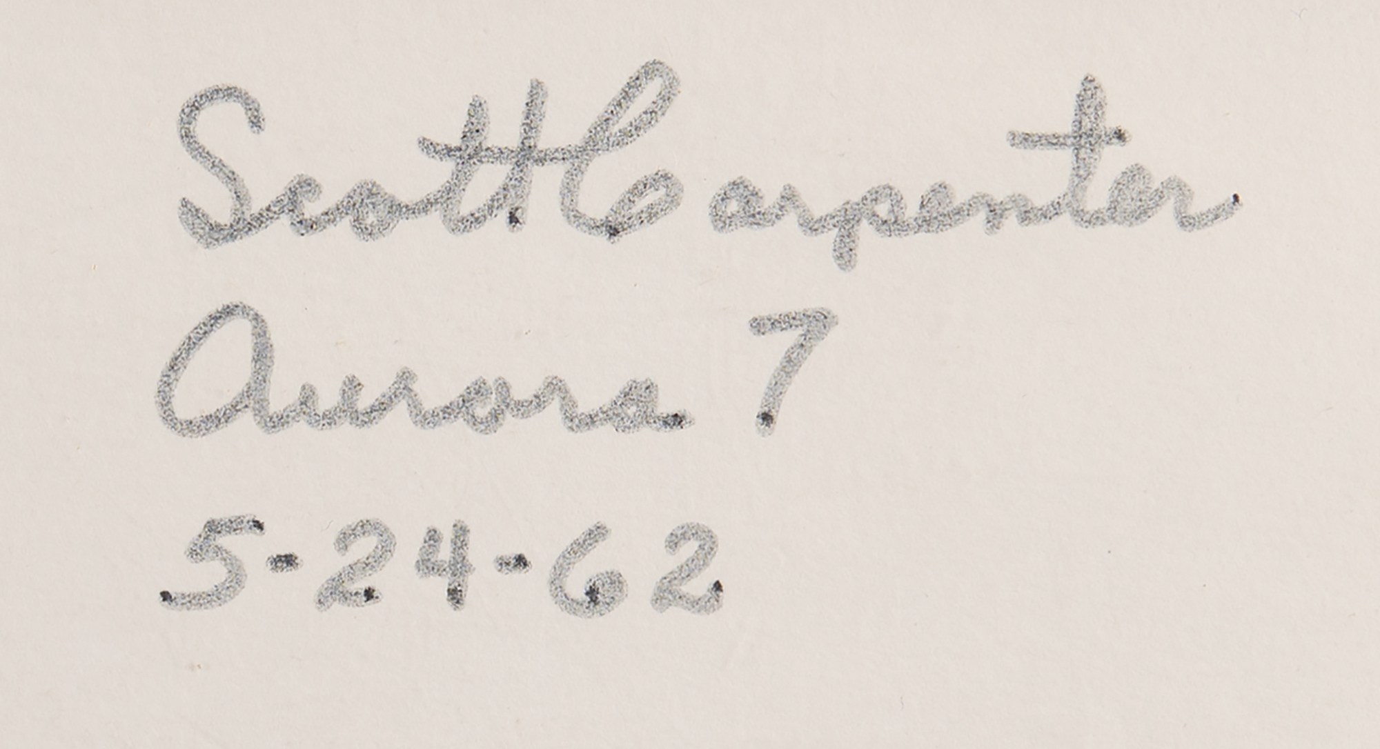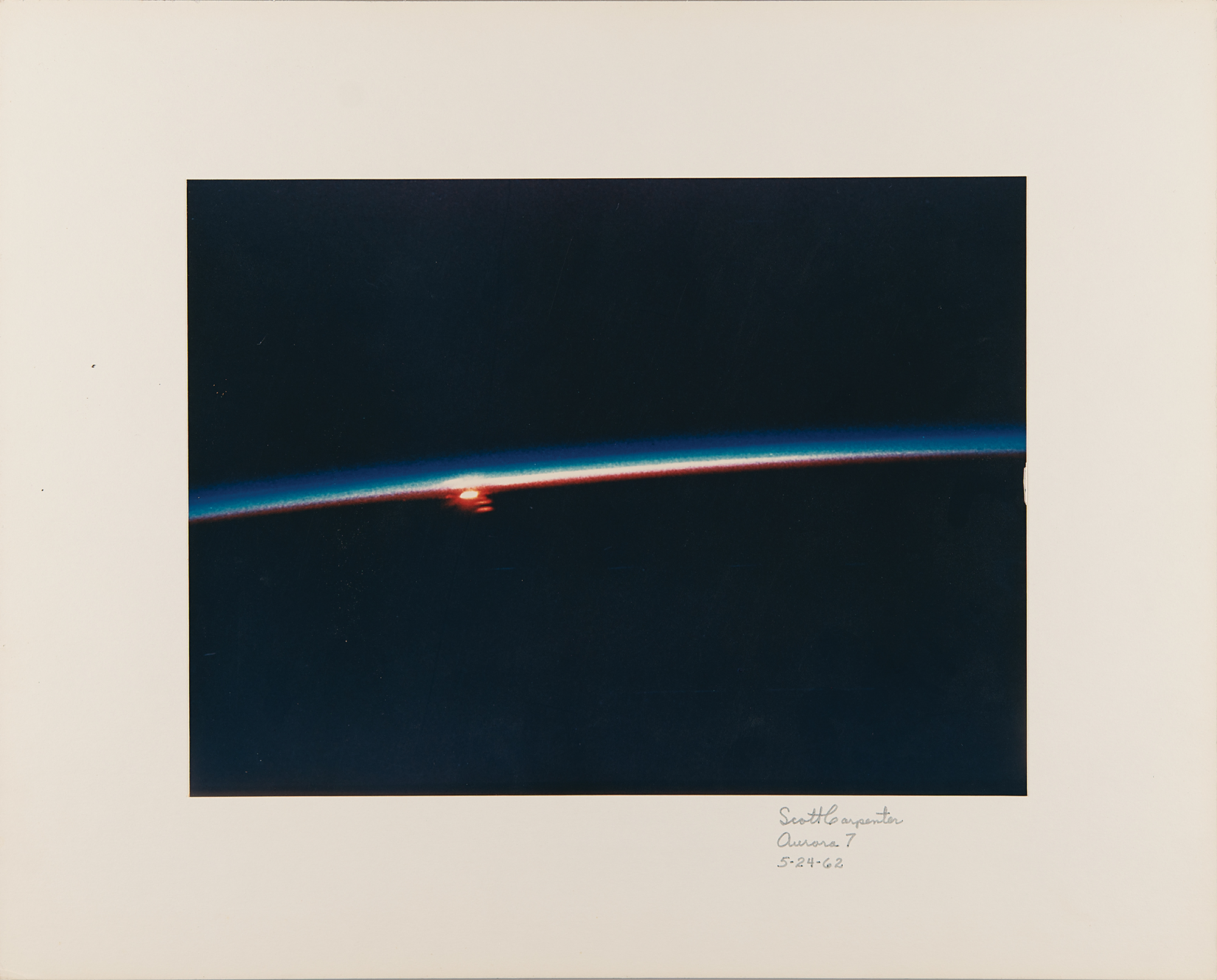 Attractive official color semi-glossy 13.75 x 10.25 NASA photo of an orbital sunset captured by Aurora 7 pilot Scott Carpenter during the Mercury-Atlas 7 mission, affixed to its original 20 x 16 cardstock mount, which is signed in black ink, “Scott Carpenter, Aurora 7, 5-24-62.” In fine condition, with a small chip to right edge of photo.