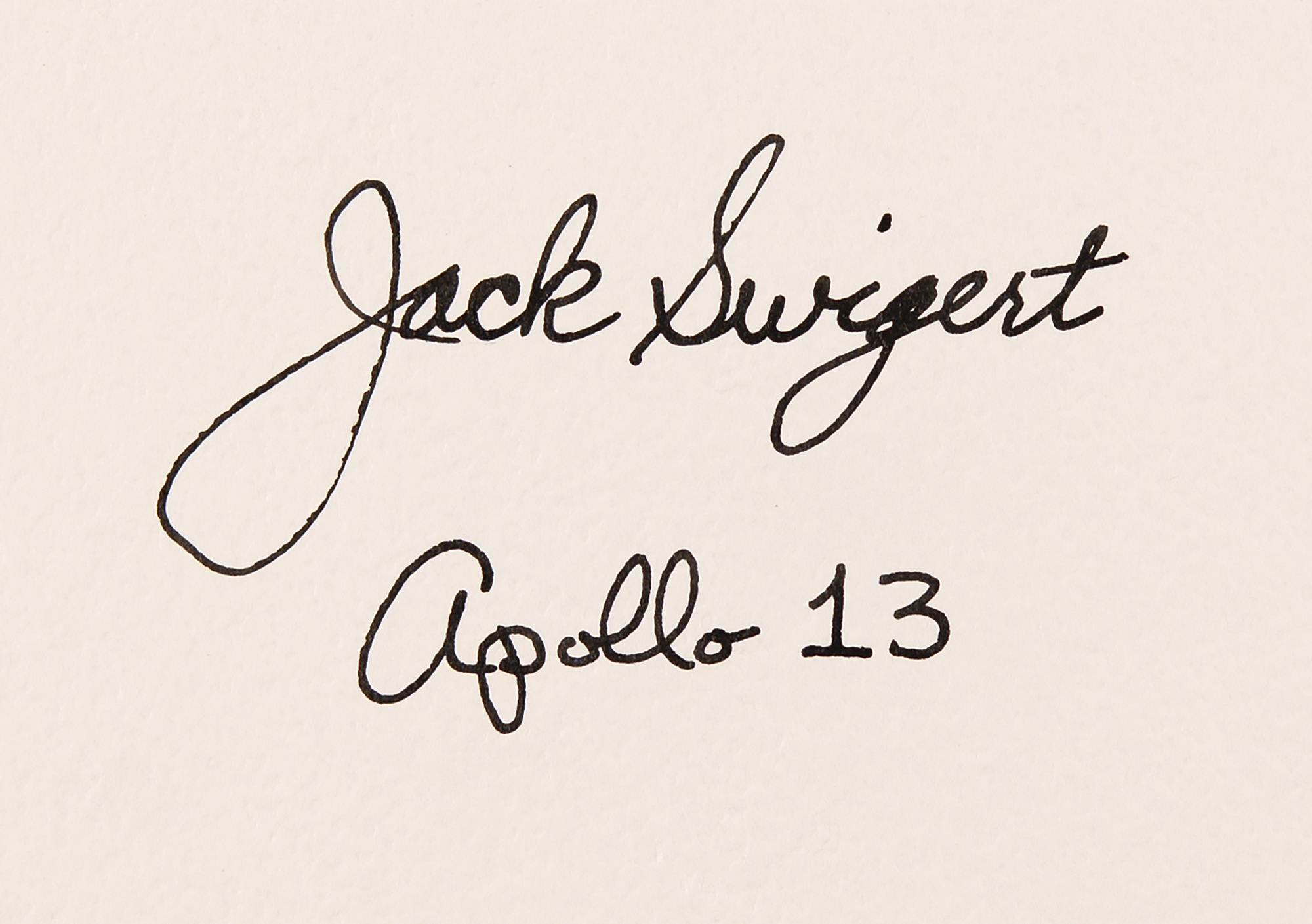 Superb official color glossy 10.75 x 13.75 NASA photo of the Apollo 13 astronauts bowing their heads in prayer offered by Navy Chaplain Lt. Commander Phillip Jerauld moments after they arrived on deck of the carrier, USS Iwo Jima, following successful splashdown on April 17, 1970, affixed to its original 16 x 20 cardstock mount, which is signed crisply in black ink, “James Lovell,” “Jack Swigert, Apollo 13,” and “Fred W. Haise.” In fine condition, with some light scuffing to the top of the image. A beautifully signed photo display honoring NASA’s most successful failure.