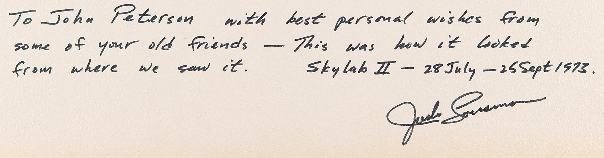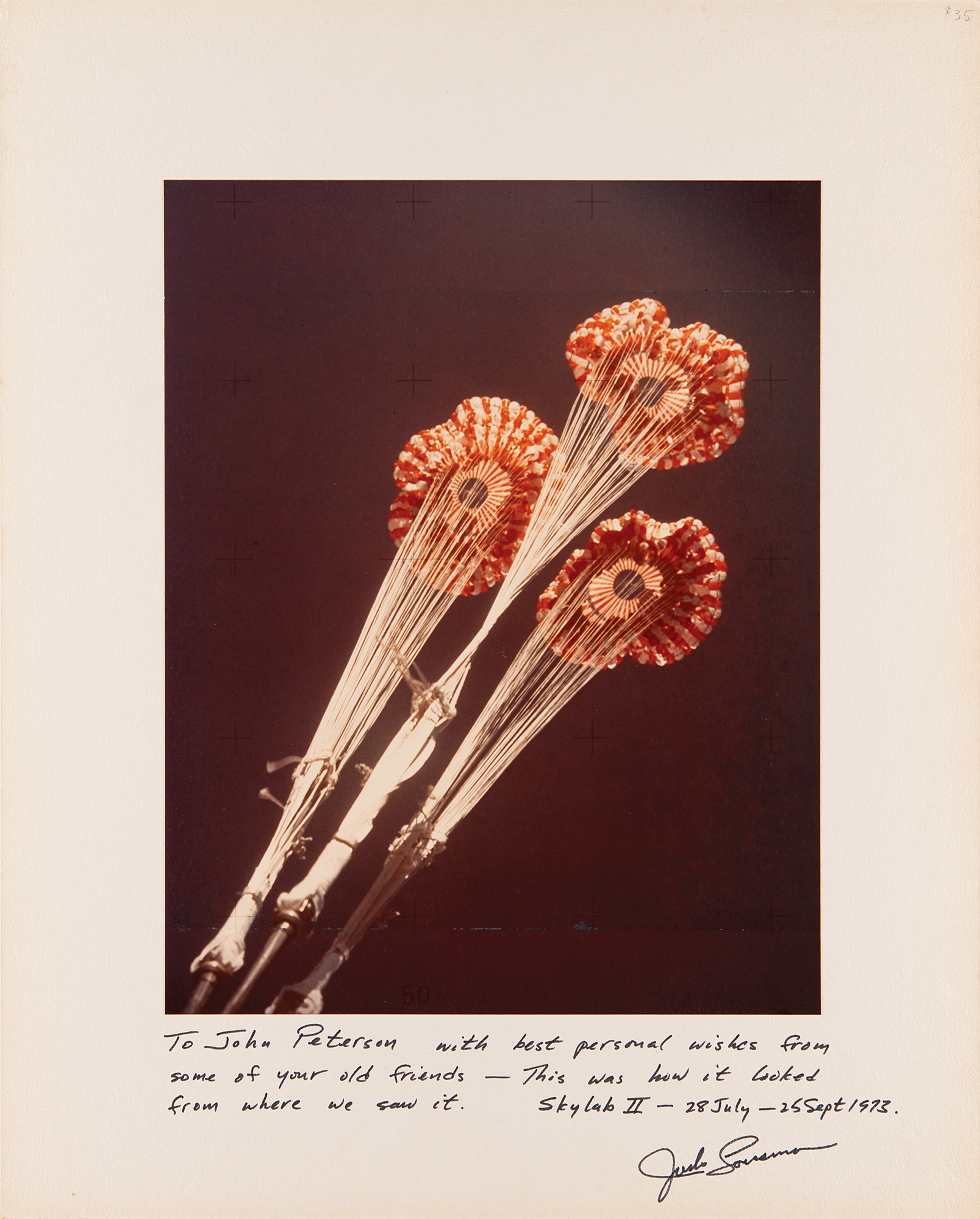 Attractive official color semi-glossy 10.75 x 13.75 NASA photo of the three main ring sail parachutes of the Skylab 3 command module as they unfurl during descent to a successful splashdown in the Pacific Ocean, affixed to its original 16 x 20 cardstock mount, which is signed and inscribed in black felt tip, “To John Peterson, with best personal wishes from some of your old friends — This was how it looked from where we saw it. Skylab II – 28 July – 25 Sept 1973, Jack Lousma.” In fine condition.